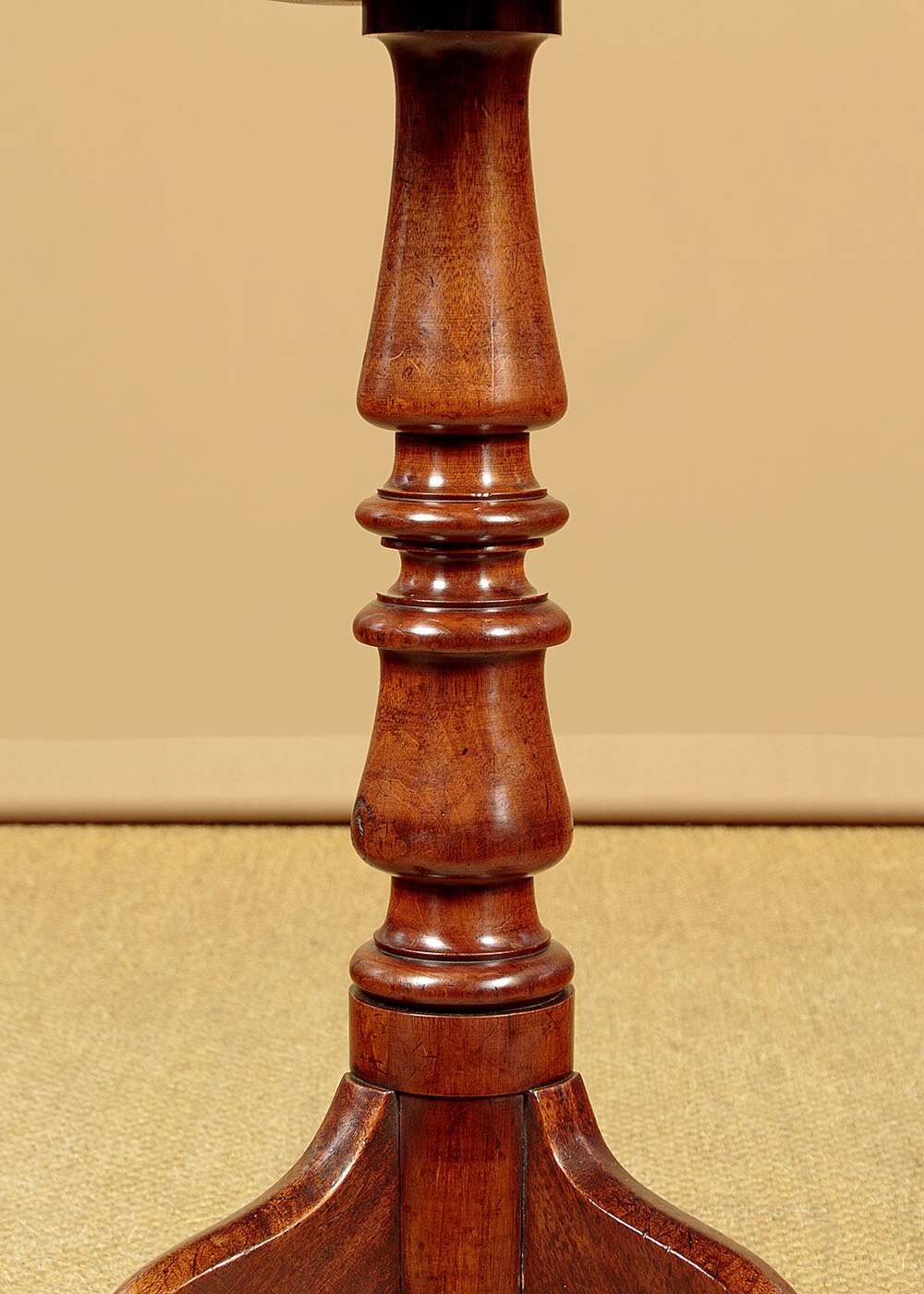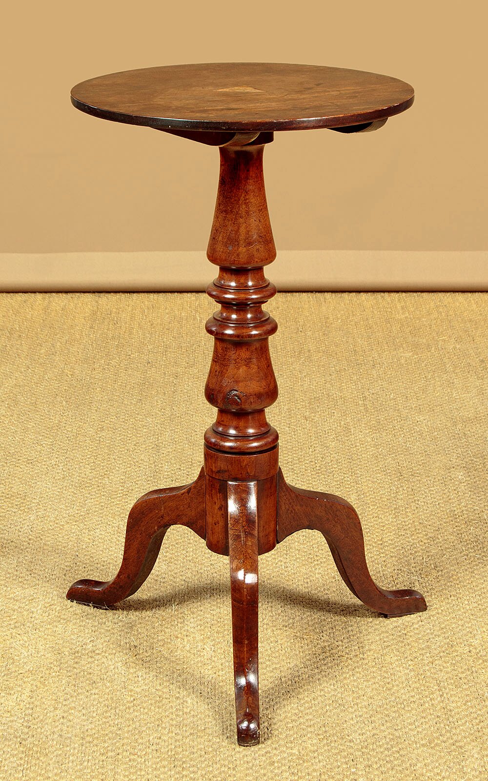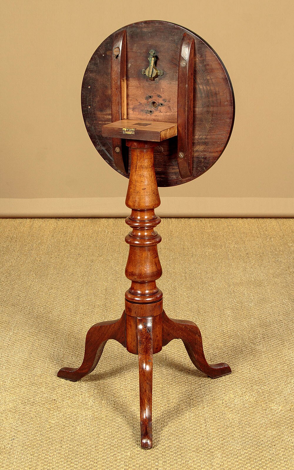 Useful little mid 19th.c. mahogany tilt-top tripod wine table c.1860. 16½" diameter top on a good turned column and shaped tripod legs all in solid mahogany. Top can be tipped to horizontal when not in use, locking into place with a brass catch. Old patched repair to centre of the top. Good colour and condition, cleaned and waxed in our workshops.Height: 28.5" (72.5 cm)
