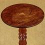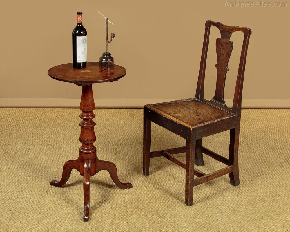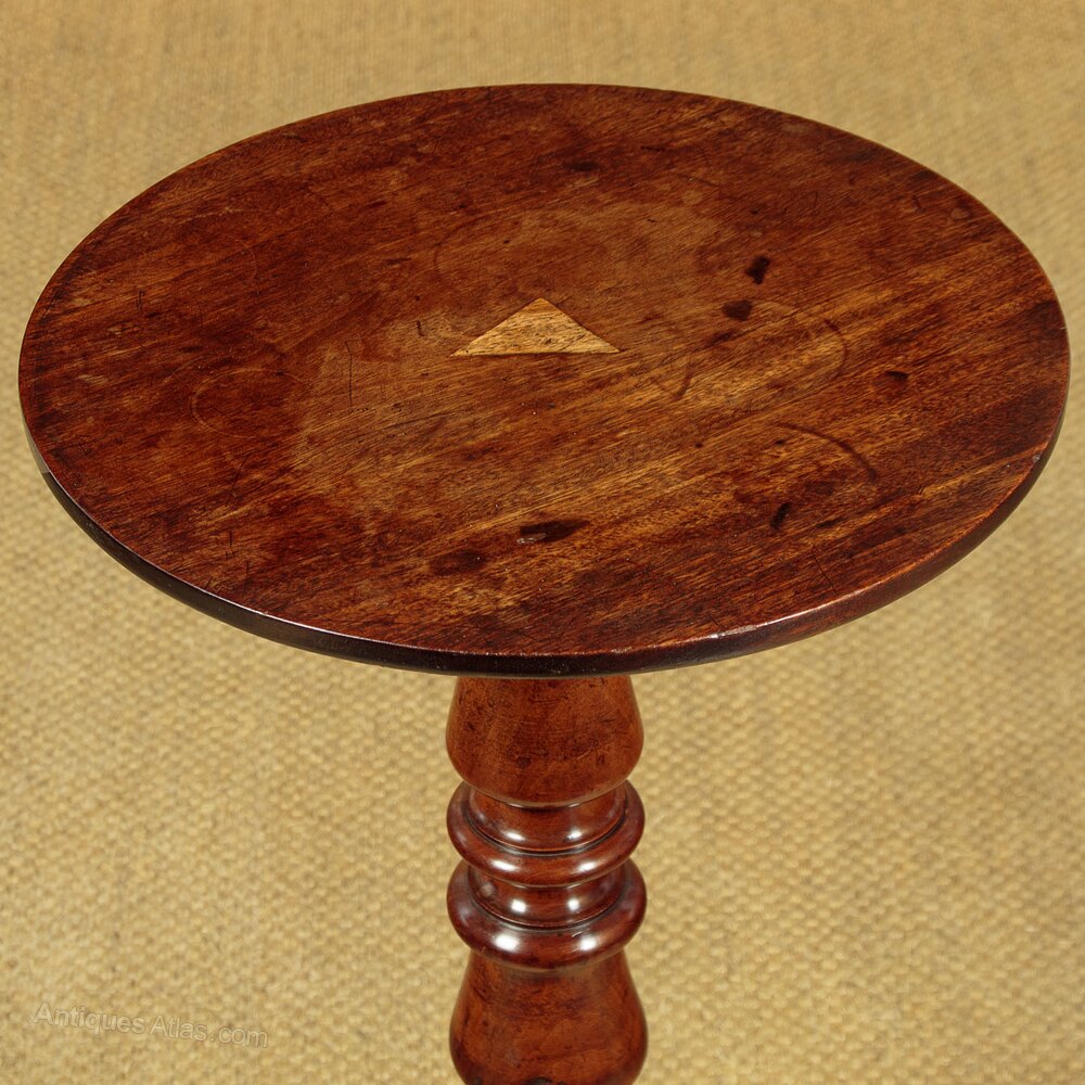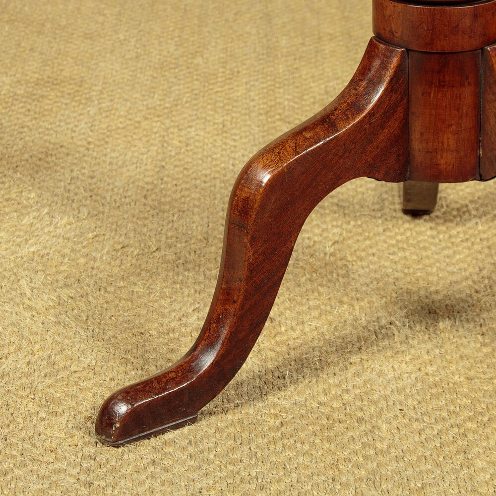 Useful little mid 19th.c. mahogany tilt-top tripod wine table c.1860. 16½" diameter top on a good turned column and shaped tripod legs all in solid mahogany. Top can be tipped to horizontal when not in use, locking into place with a brass catch. Old patched repair to centre of the top. Good colour and condition, cleaned and waxed in our workshops.Height: 28.5" (72.5 cm)