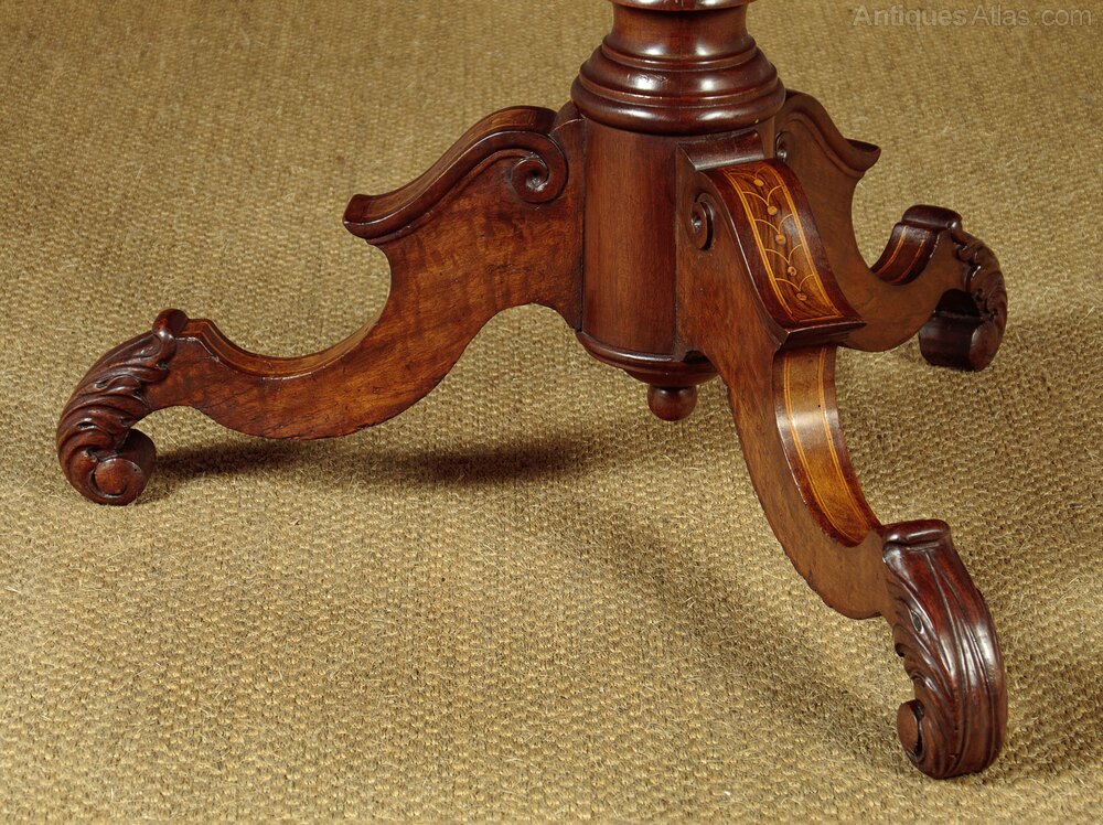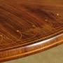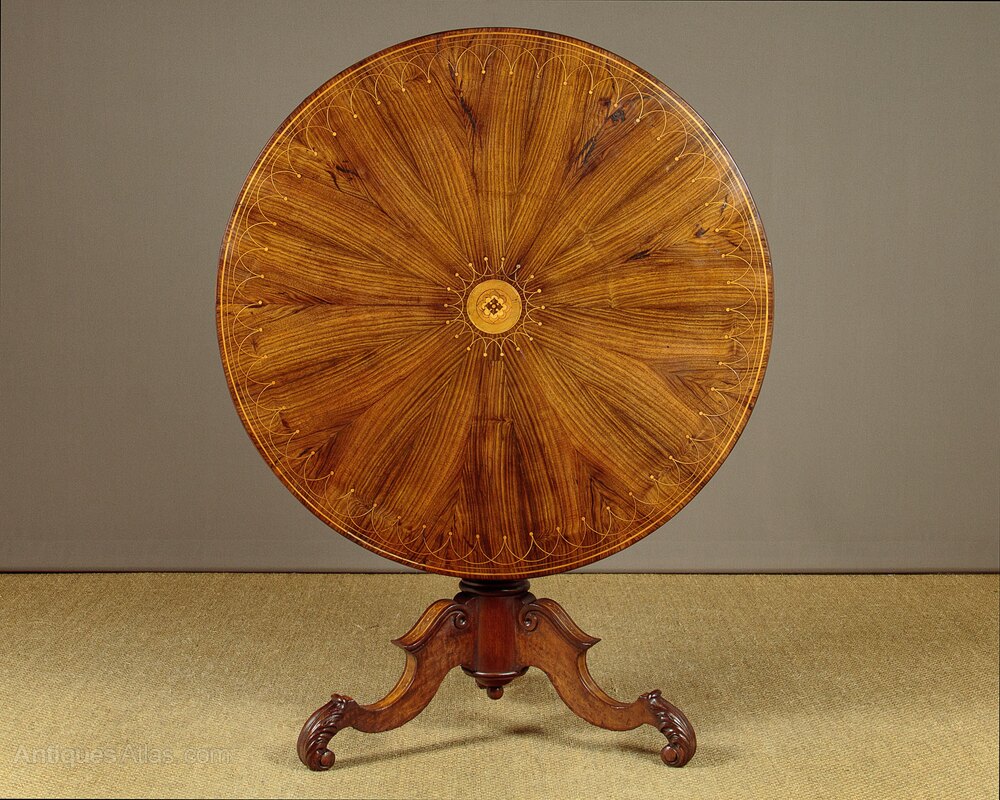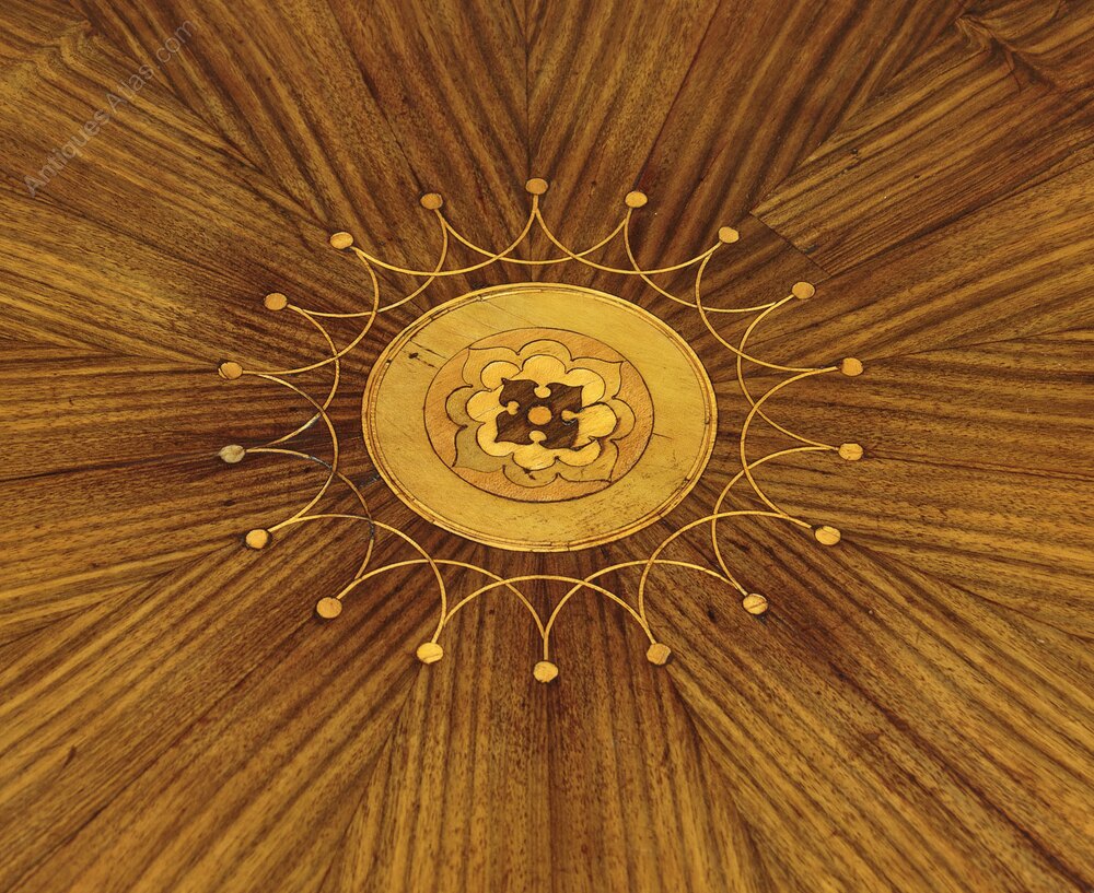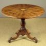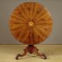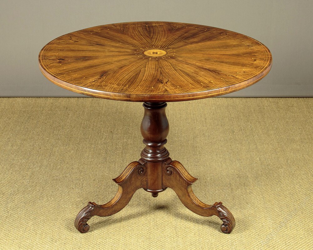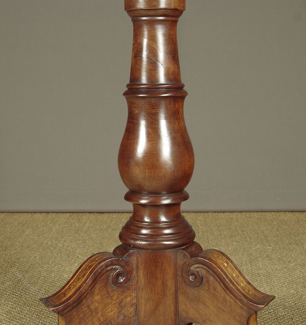 Beautiful mid 19th.c. Italian Sorrento ware tripod supper table c.1860. 40" diameter top with highly figured veneers laid in a radiating pattern with an inlaid marquetry work motif at the centre surrounded with fine inlaid stringing which is repeated around the outer edge of the table. Crossbanded edge also inlaid. Raised on a crisp turned walnut column and fine shaped tripod legs with inlaid tops and scrolling acanthus feet. Top can be tipped to vertical when not in use, locking into place with the original catch. Missing a few little portions of inlay, otherwise excellent colour and condition, cleaned and waxed in our workshops.Height: 31" (78.5 cm)