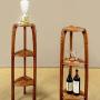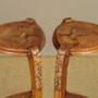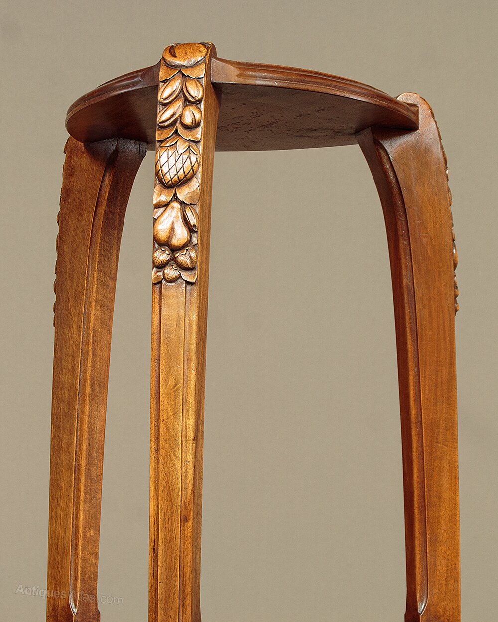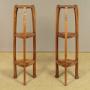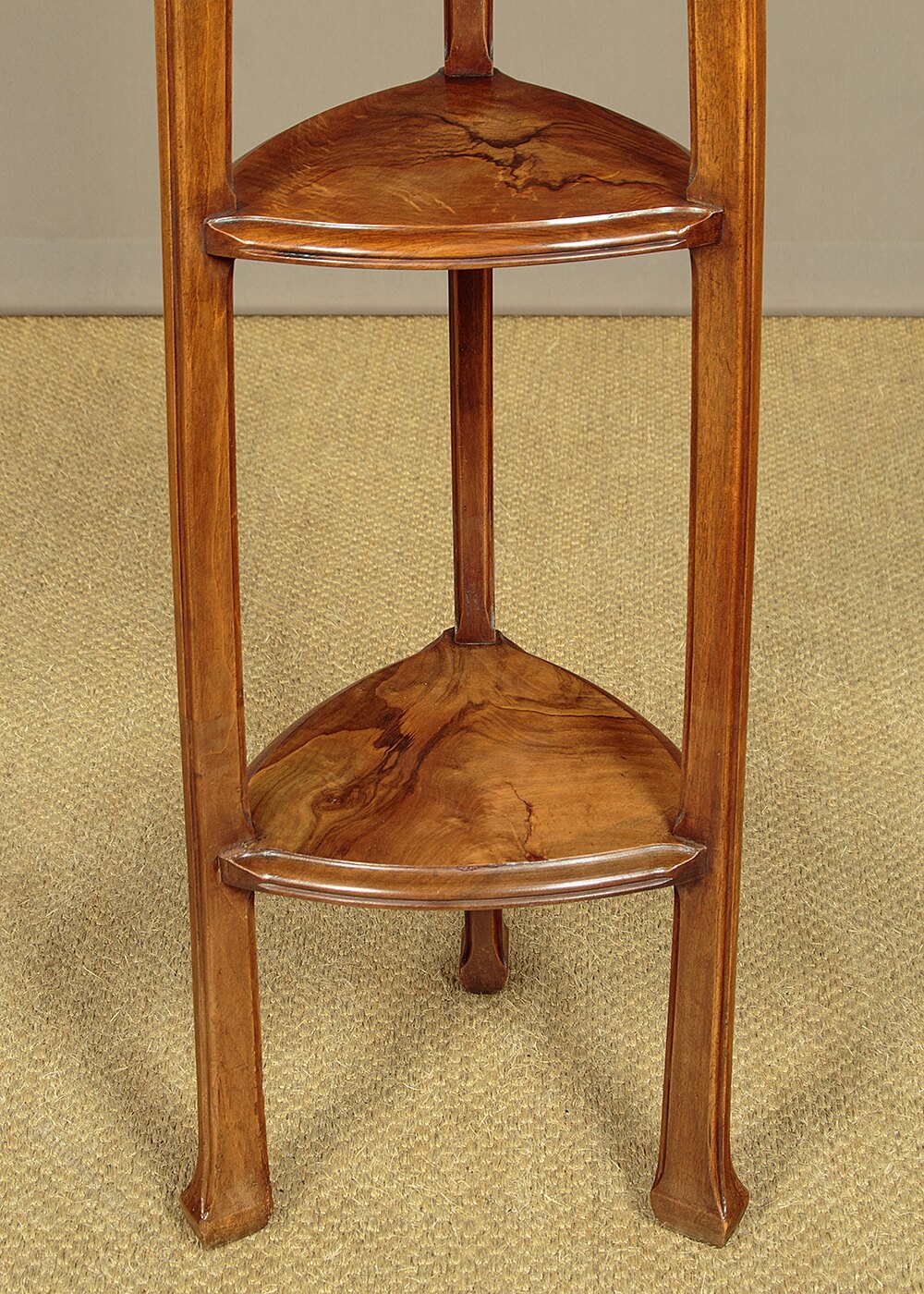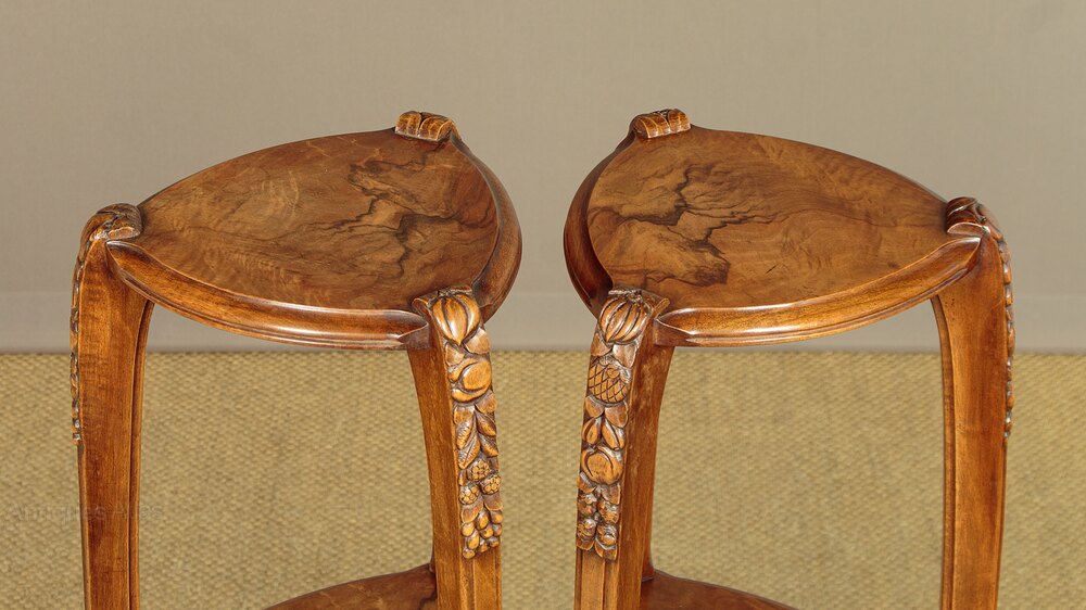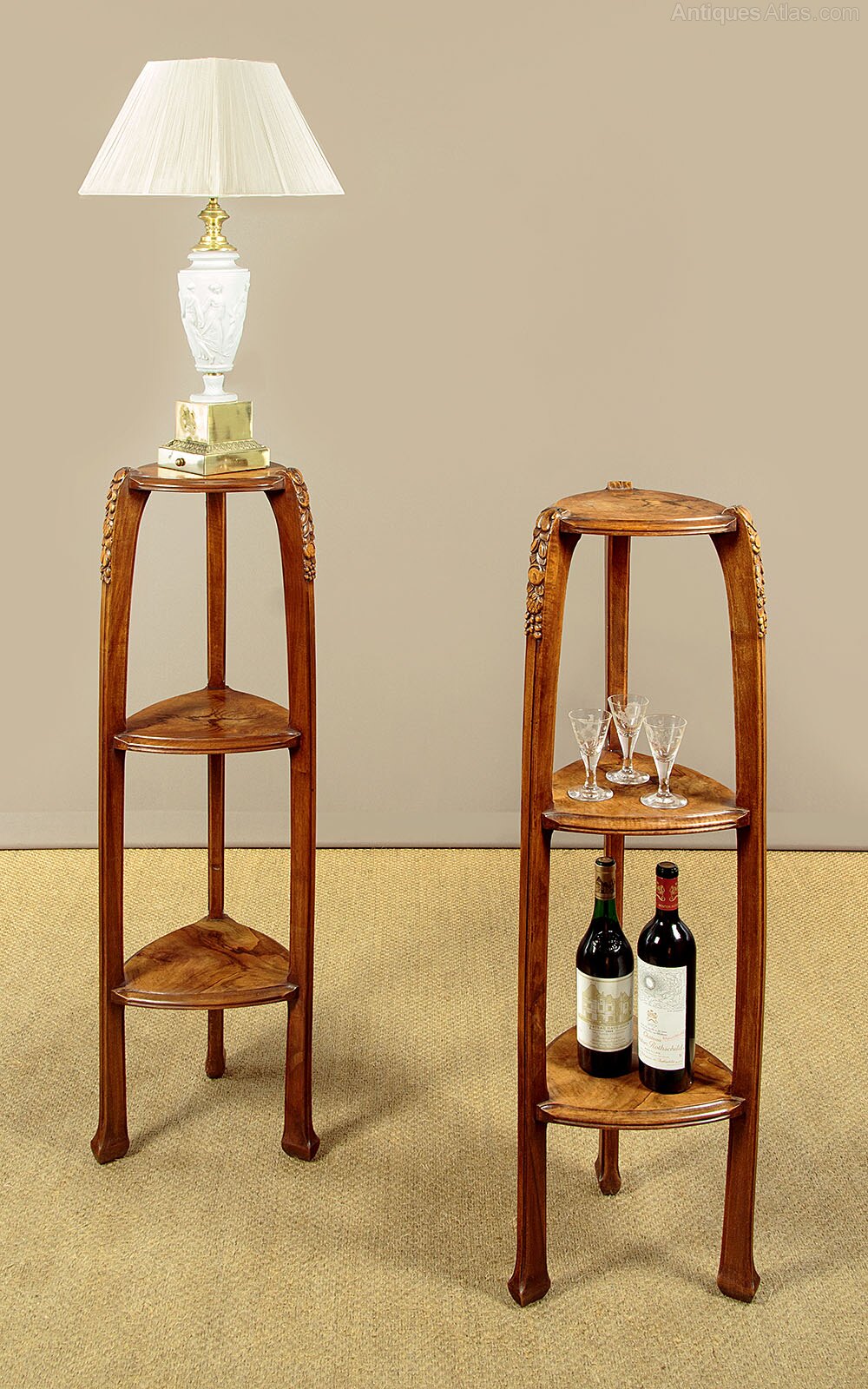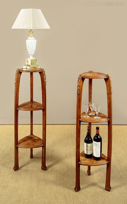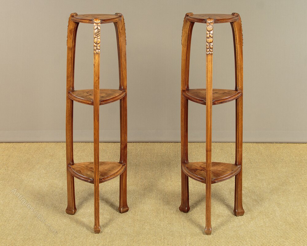 Unusual pair of slim Art Nouveau or Art Deco style walnut three tier stands or what-nots c.1920. Three shelves of rounded triangular form with burr walnut veneers and moulded edges. On organic shaped stiles with carved flowers and fruit at the shoulders, moulded edges and bulbous feet. A little bit of bubbling to the veneers on the shelves, otherwise very good colour and condition, cleaned and waxed in our workshops.Width: 14" (35.5 cm)