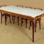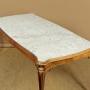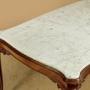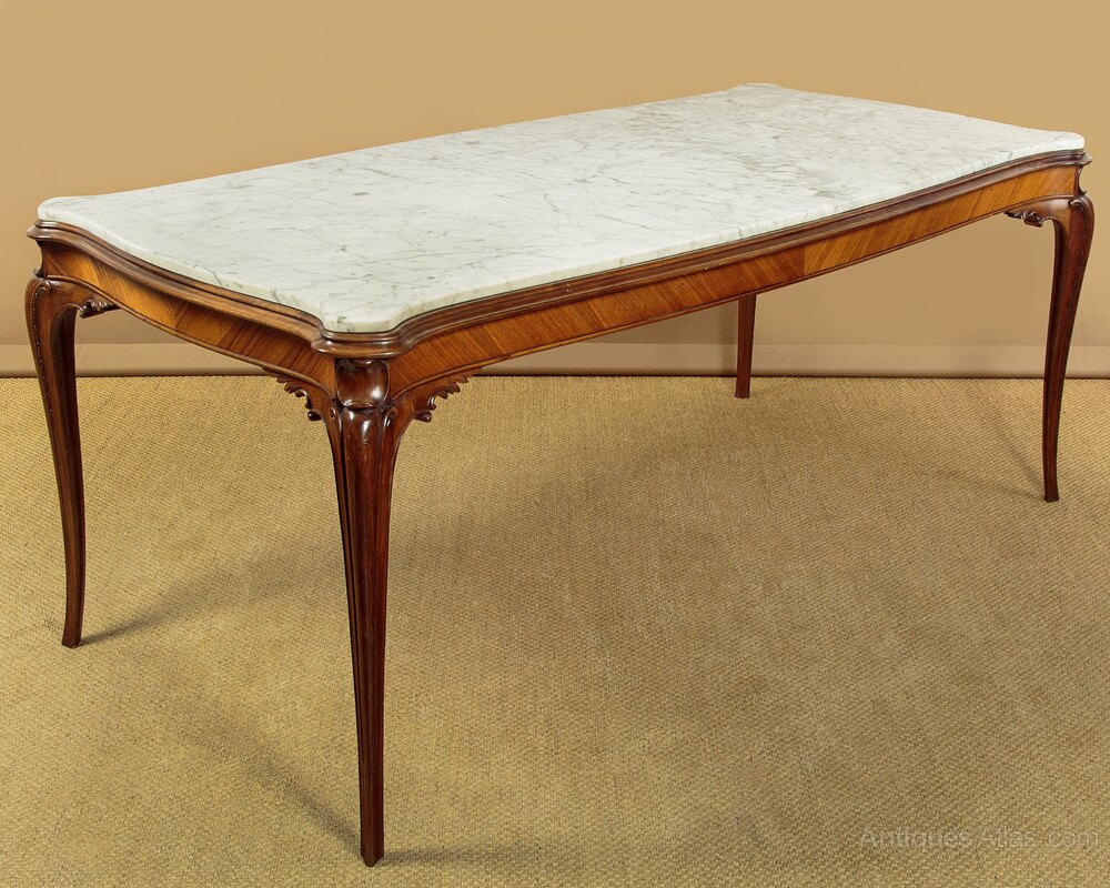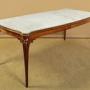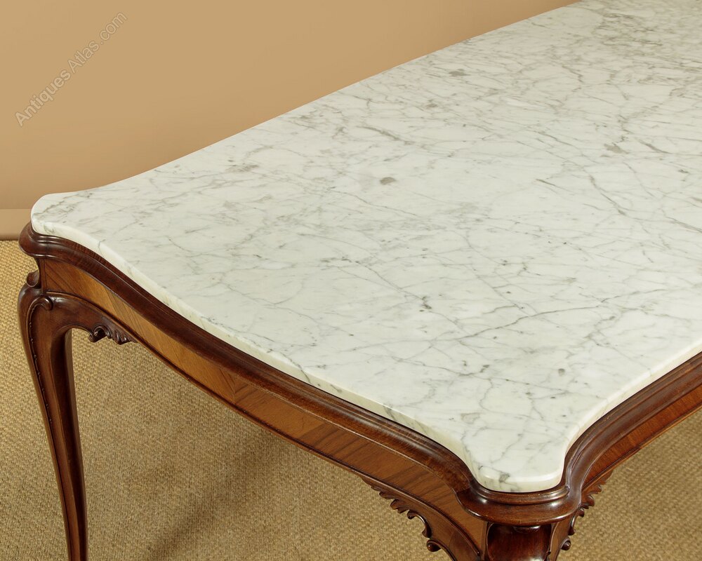 Good looking large French marble top dining or centre table c.1960. Big enough to seat eight people. Three quarter inch thick white marble top with projecting corners and a serpentine shaped edge. On a walnut base with a moulded edge and slim veneered apron. Raised on tapering cabriole shaped legs with carved detail to the knees. Height below the apron 27". Fading to the colour at one end of the base. Otherwise very good condition, cleaned and waxed in our workshops.Width: 76" (193 cm)