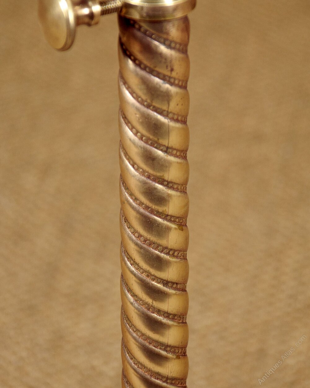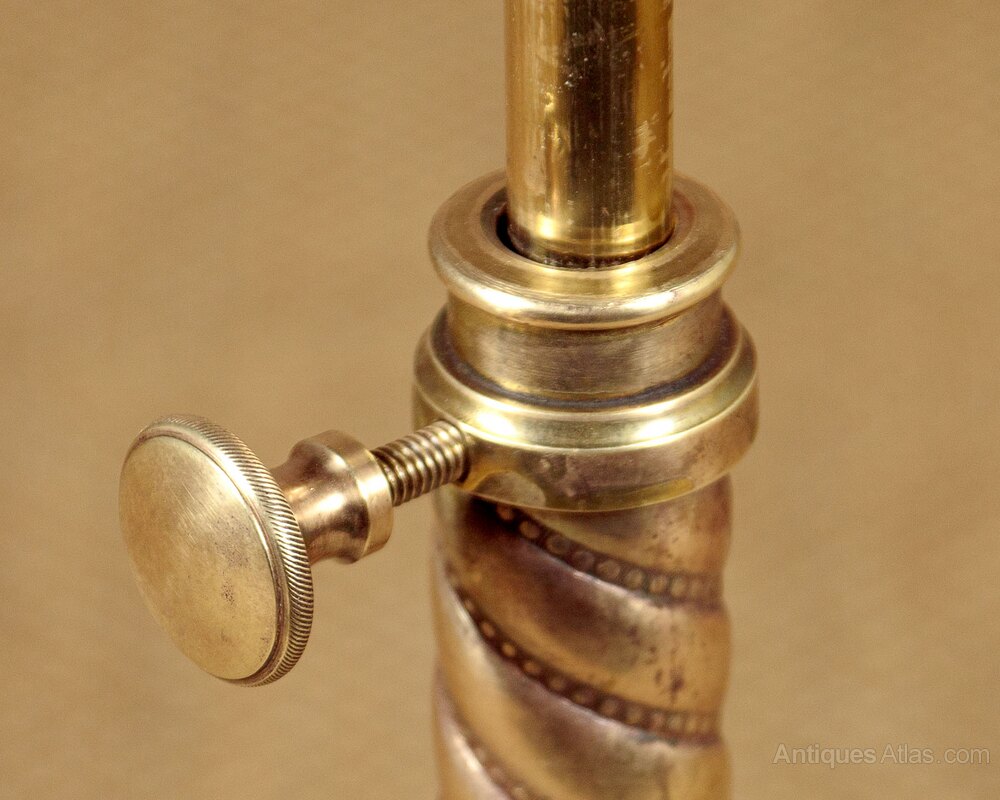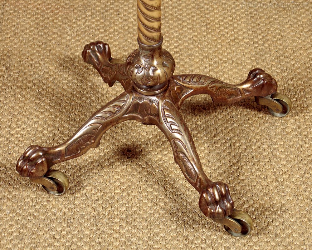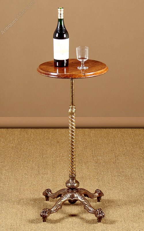Late 19th.c adjustable wine table c.1890. 15" diameter mahogany table top with a moulded edge. Height adjustable from 26" - 46" on a spiral cast telescopic brass column. On a heavy cast iron base with claw feet and large brass castors. Very good condition, cleaned and waxed in our workshops.Width: 18" (45.5 cm)