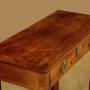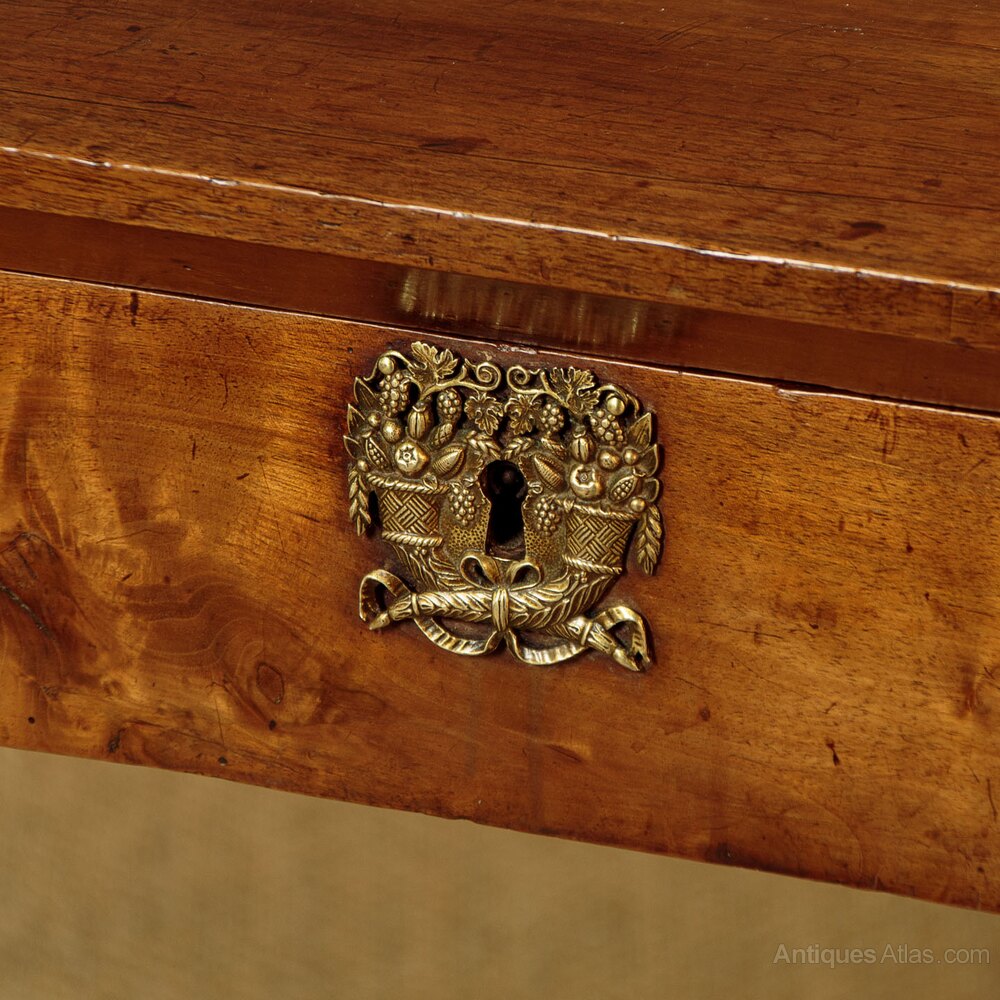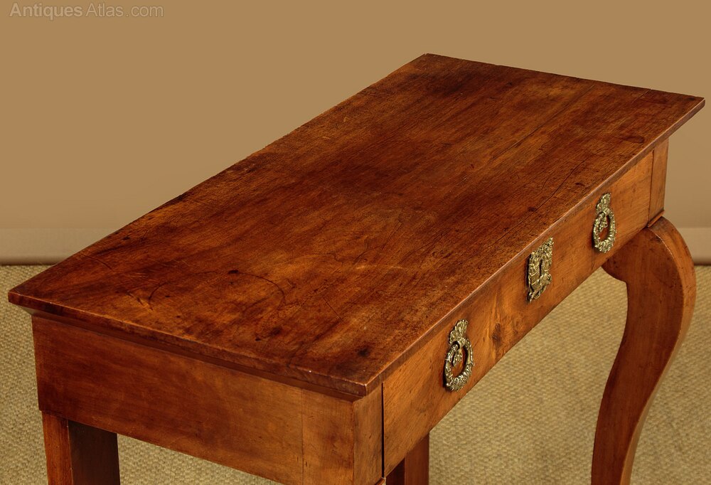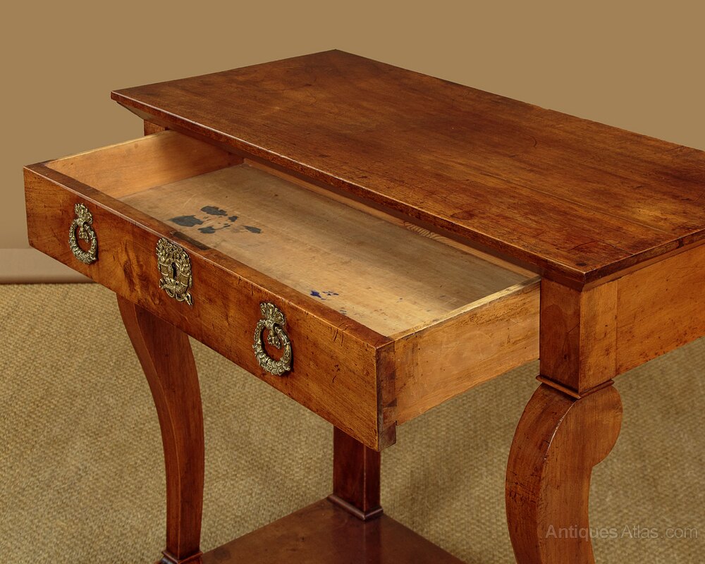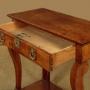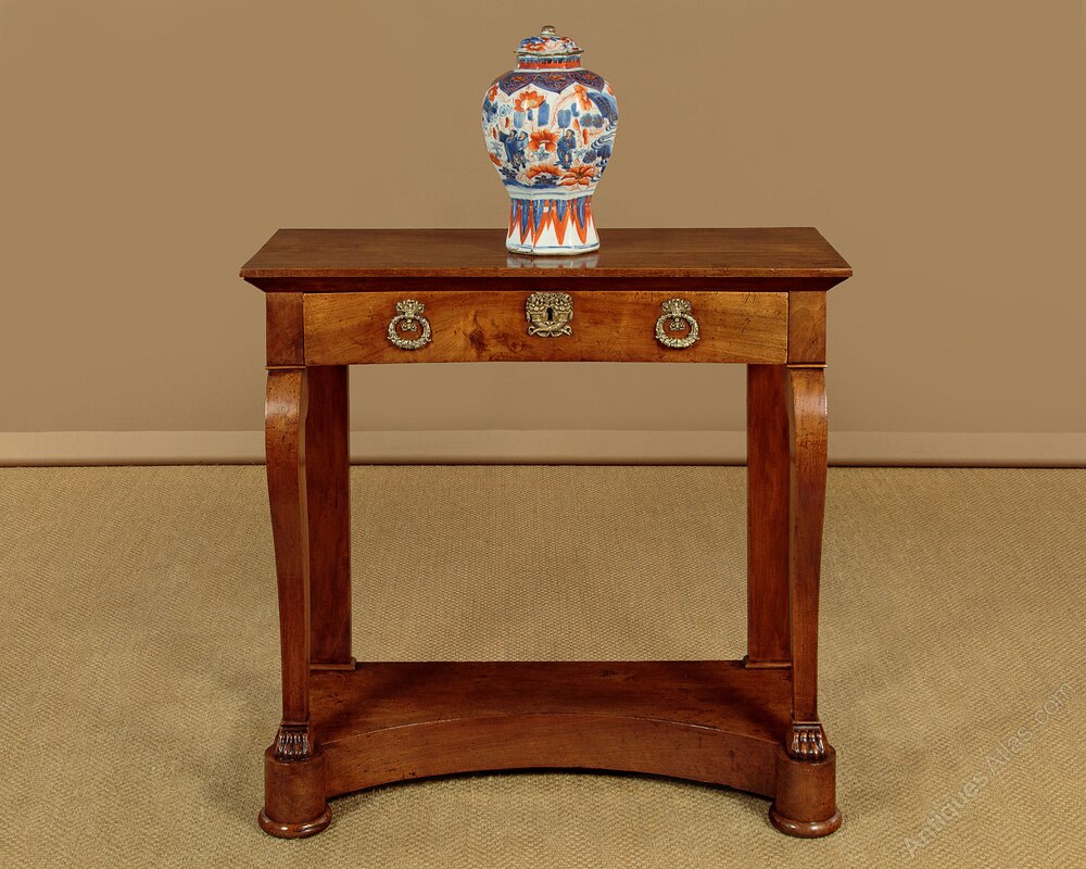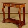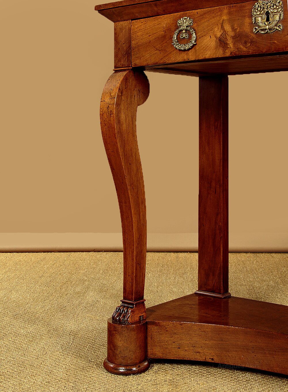 Small mid 19th.c. French console table in walnut c.1840. Useful small size, just 35” wide. Quite unusual solid walnut top (rather than marble) with a simple chamfered moulding below. Over a slim drawer with a solid walnut drawer front with splendid Empire style brass handles and escutcheon plate featuring crossed cornucopia. Curving front supports with neat little carved paw feet over a concave plinth raised on turned pads. Very good colour and condition, restored cleaned and waxed in our workshops.Width: 35" (89 cm)