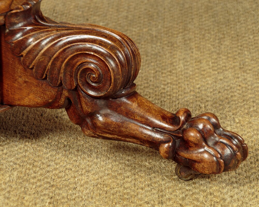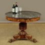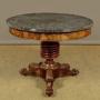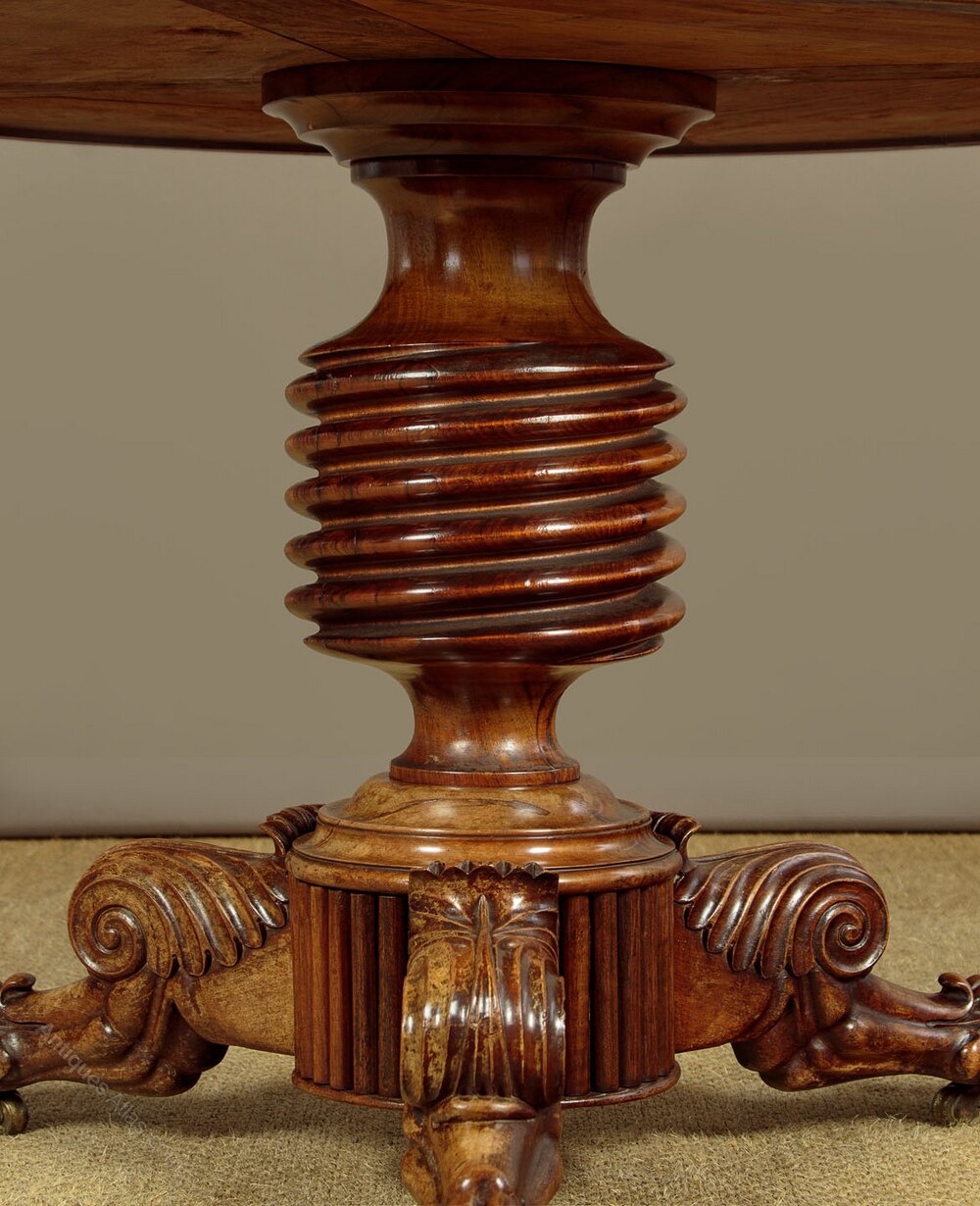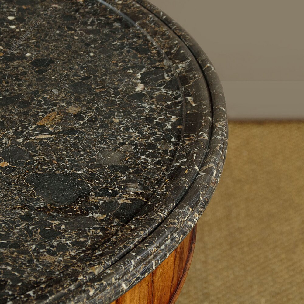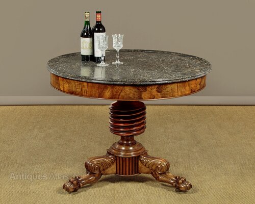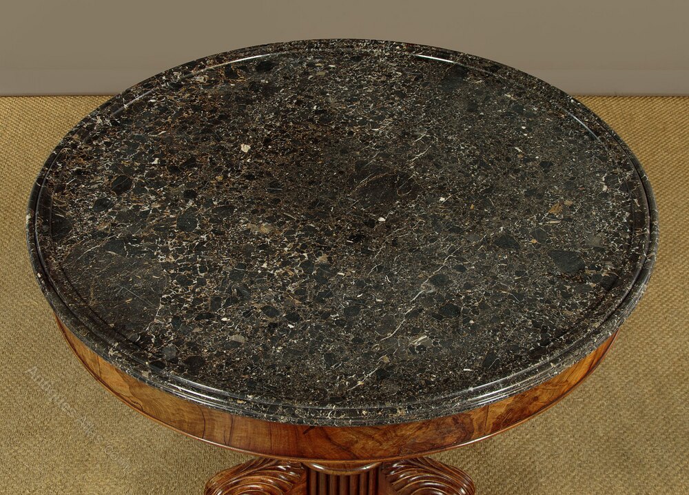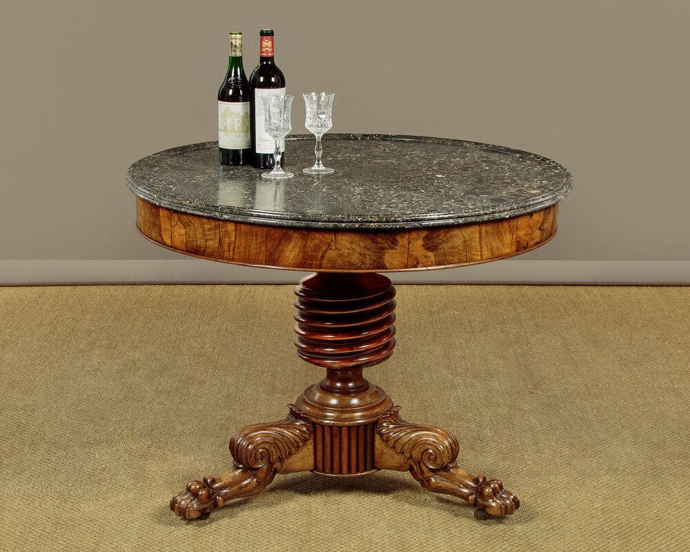 Superb early 19th.c. French marble top gueridon or centre table c.1840. Original 38½″ diameter top in well figured grey marble, the edge moulded with a border of concentric rings designed to stop spilt liquids from running over the sides. Highly figured walnut veneered apron with an applied moulding around the bottom edge. Very unusual corkscrew carved column over splendid Empire style tripod legs carved with scrolling acanthus leaves and large claw feet. With the original wooden wheeled castors below. Excellent colour and condition, cleaned and waxed in our workshops.Width: 38.5" (98 cm)