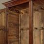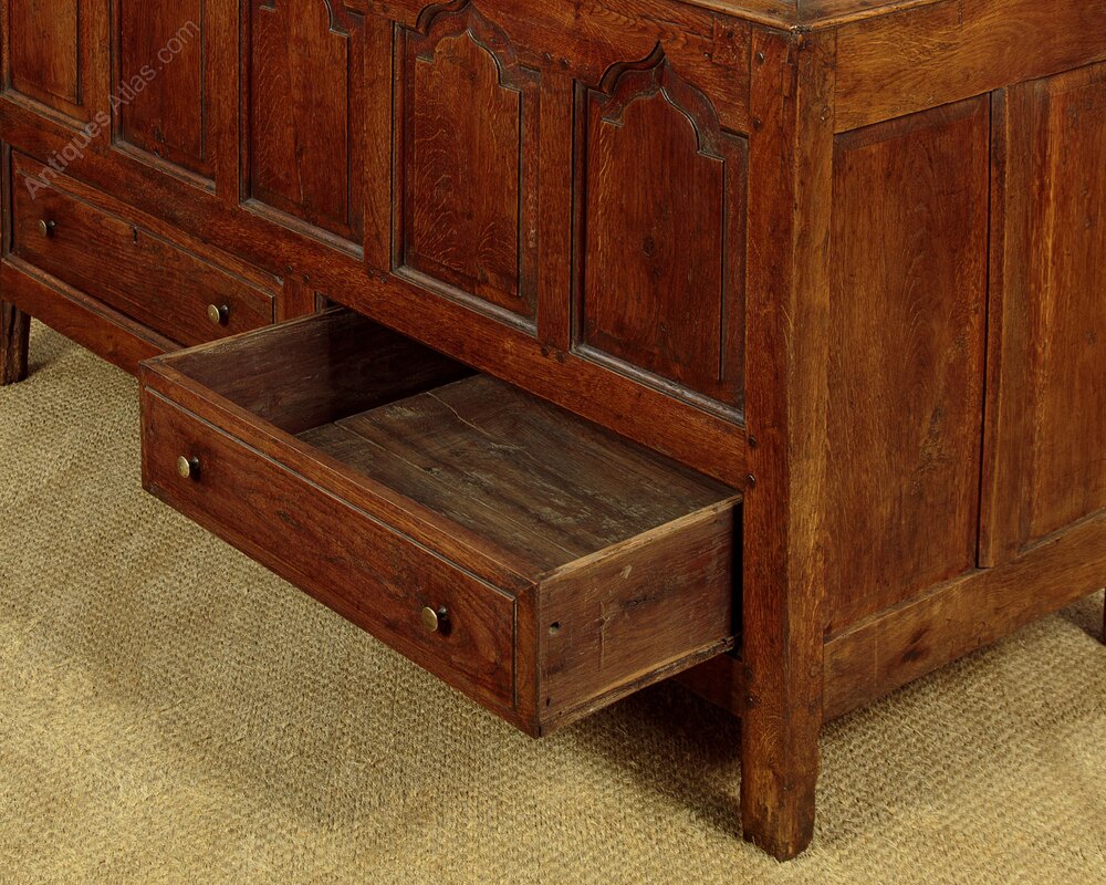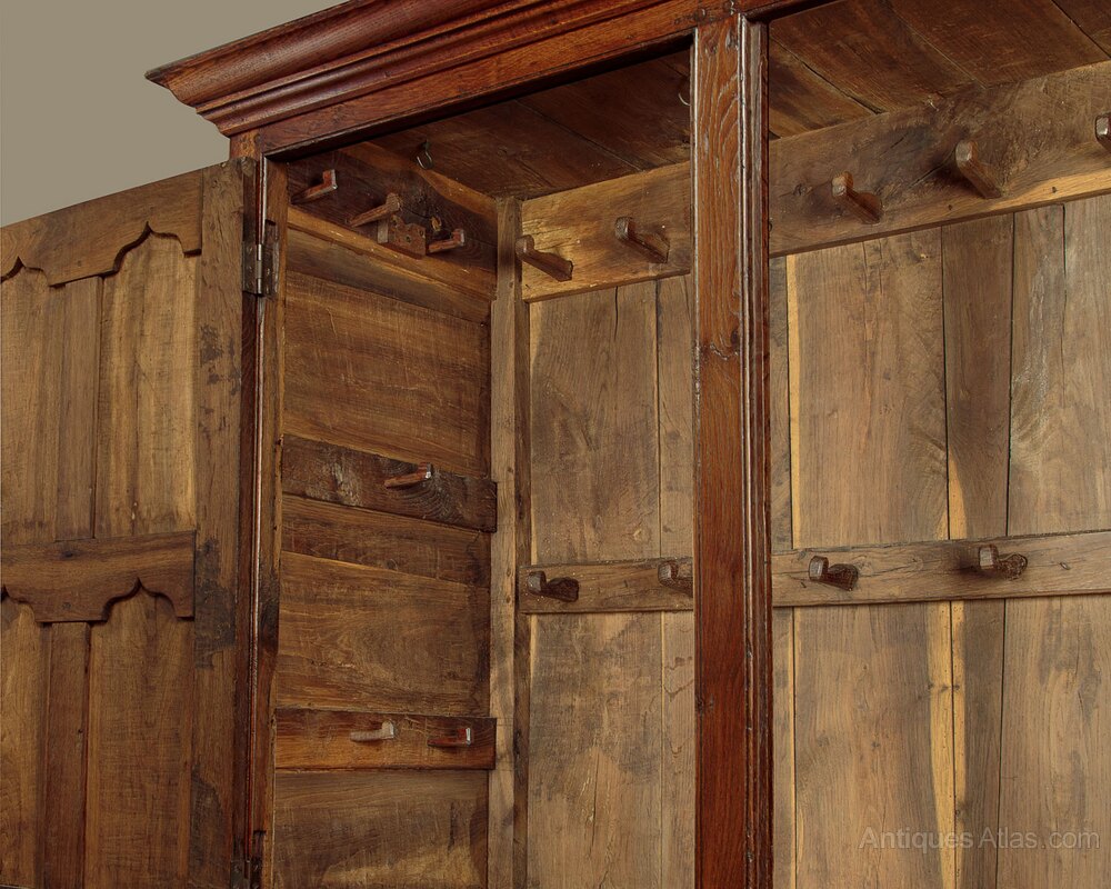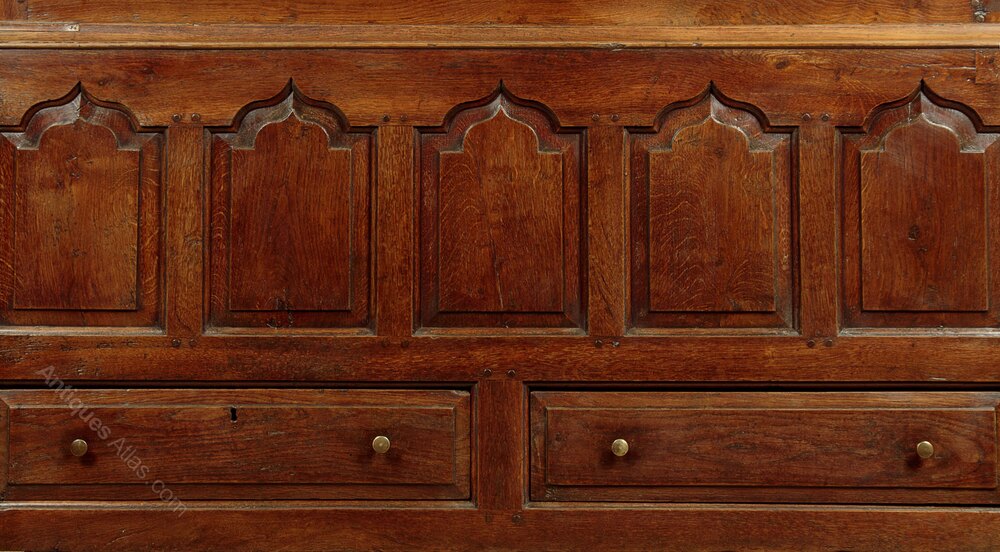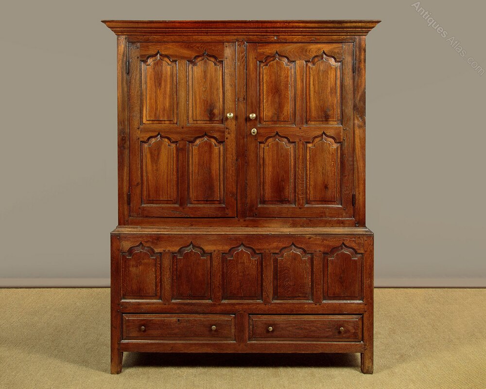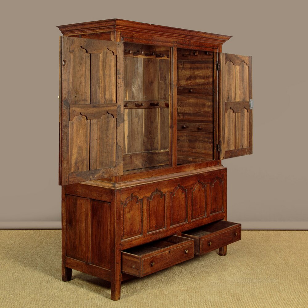 Superb mid 18th.c. oak tack or cloak cupboard c.1760. In two pieces, a little larger than many we see, with a two door cupboard top fitted inside with 26 wooden pegs for hanging coats, bags etc. On a base with an open top (to allow for extra hanging length inside) and two drawers in the base. Internal depth 18½", internal hanging height is 55" from the hooks. Flared and moulded cornice over a very handsome front featuring rows of ogee pointed arch-shaped raised and fielded panels set within moulded rails and mullions. Note the lovely grain of the timber and the pegged construction. Raised and fielded drawer fronts with brass button knobs and oak drawer linings. Oak fielded panelled sides and oak backboards. Excellent colour and condition. Restored, cleaned and waxed in our workshops. Key supplied.Width: 58" (147.5 cm)