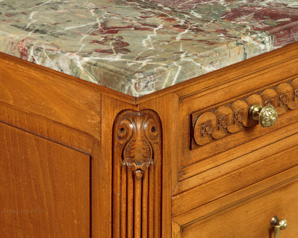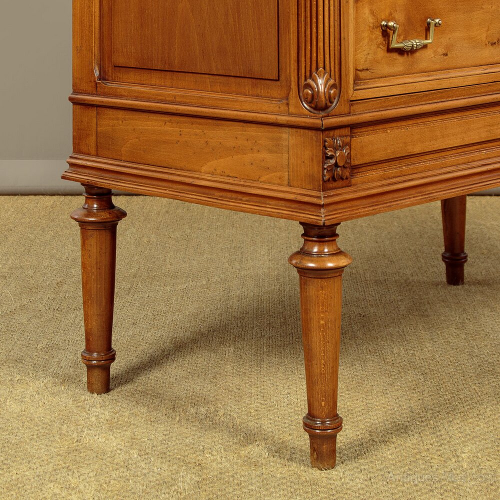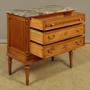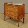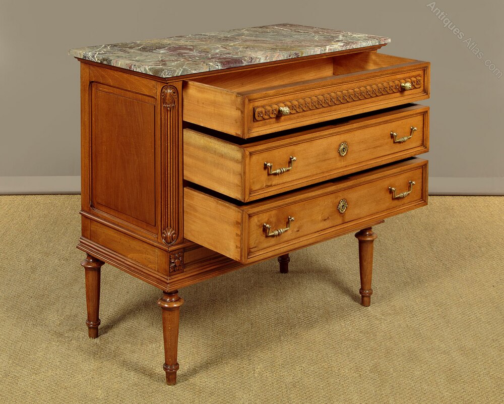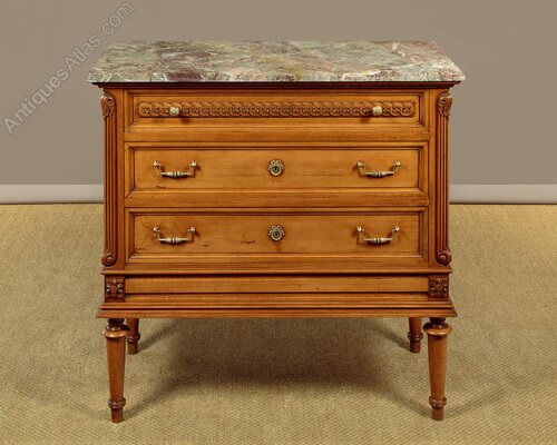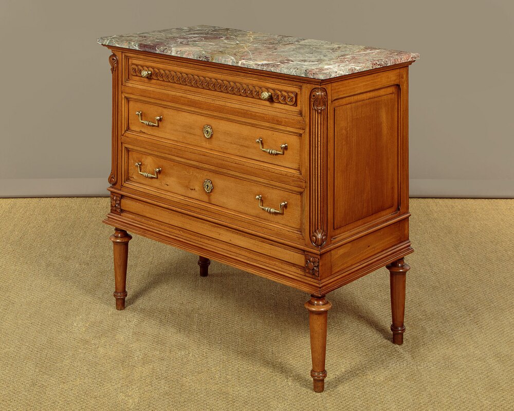 Very smart little French Louis XVI style walnut and marble top commode c.1960. Original and highly figured marble top with a moulded edge. Over a chest of three long drawers. Decorative carved guilloche frieze to the slightly slimmer top drawer, good quality brass knobs, handles and escutcheon plates. Flanked with reeded pilasters to the front corners with scrolling acanthus carved detail top and bottom. Further carved decoration below the drawers and a moulded edge. Raised and fielded side panels. Raised on short turned and tapering legs front and rear. With a repaired break running front to back across the marble. Otherwise excellent colour and condition, cleaned and waxed in our workshops.Width: 37" (94 cm)