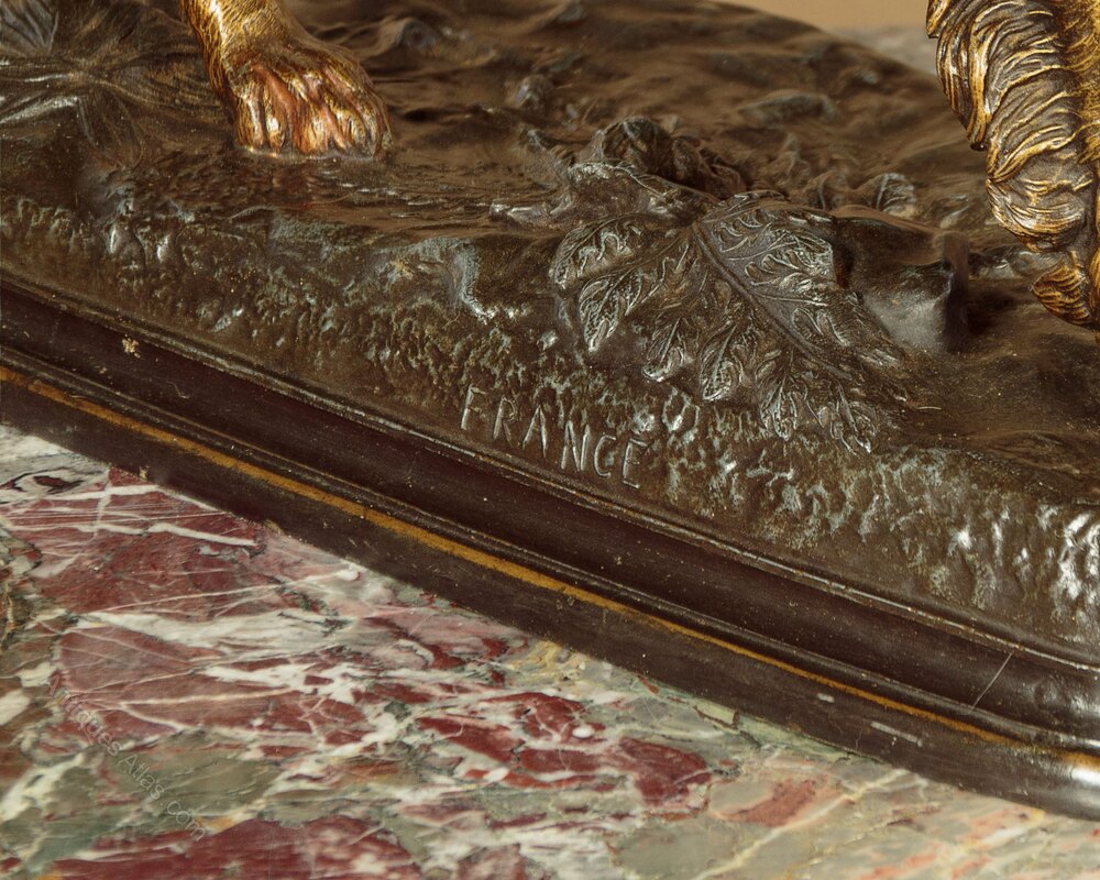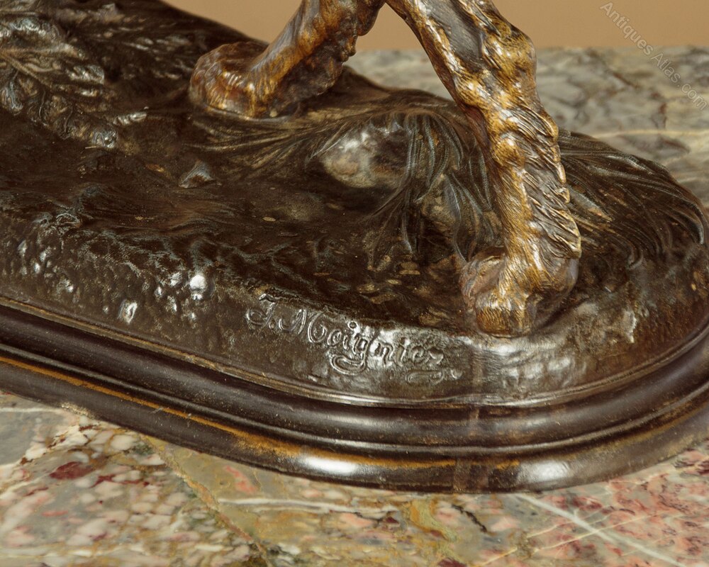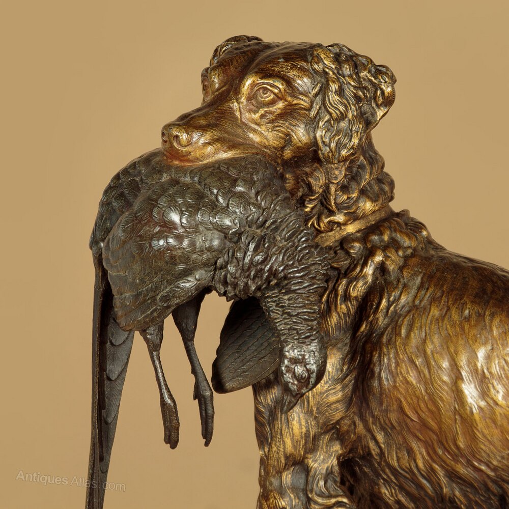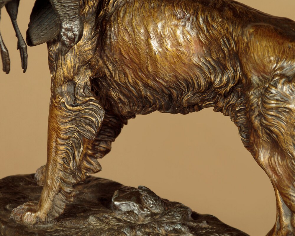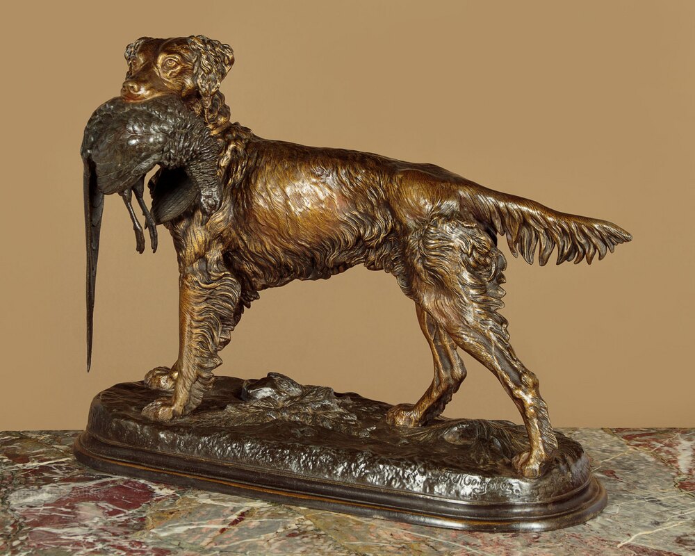 Late 19th.c. sculpture of a gun dog by the celebrated French animal sculptor Jules Moigniez c.1890. Very well cast in spelter as a gun dog retrieving a shot pheasant. Superb detail to the coat and feathers, with lovely golden bronze finish to the dog and a darker contrasting finish to the bird and the base, which also features fine naturalistic detail, something of a trademark of Moigniez's work. Signed in the cast on the front of the base and marked France on the rear. Excellent condition.Width: 22" (56 cm)