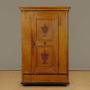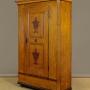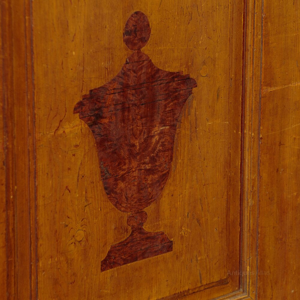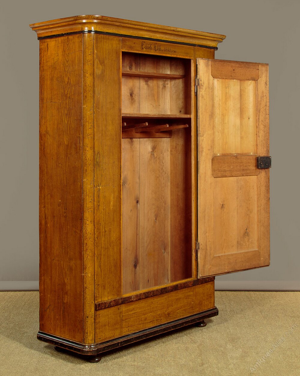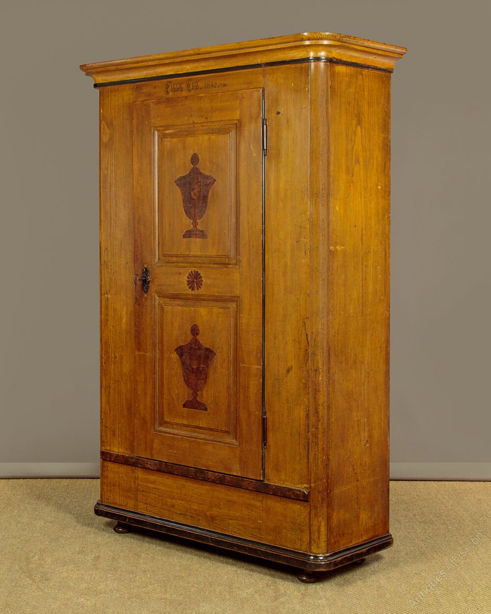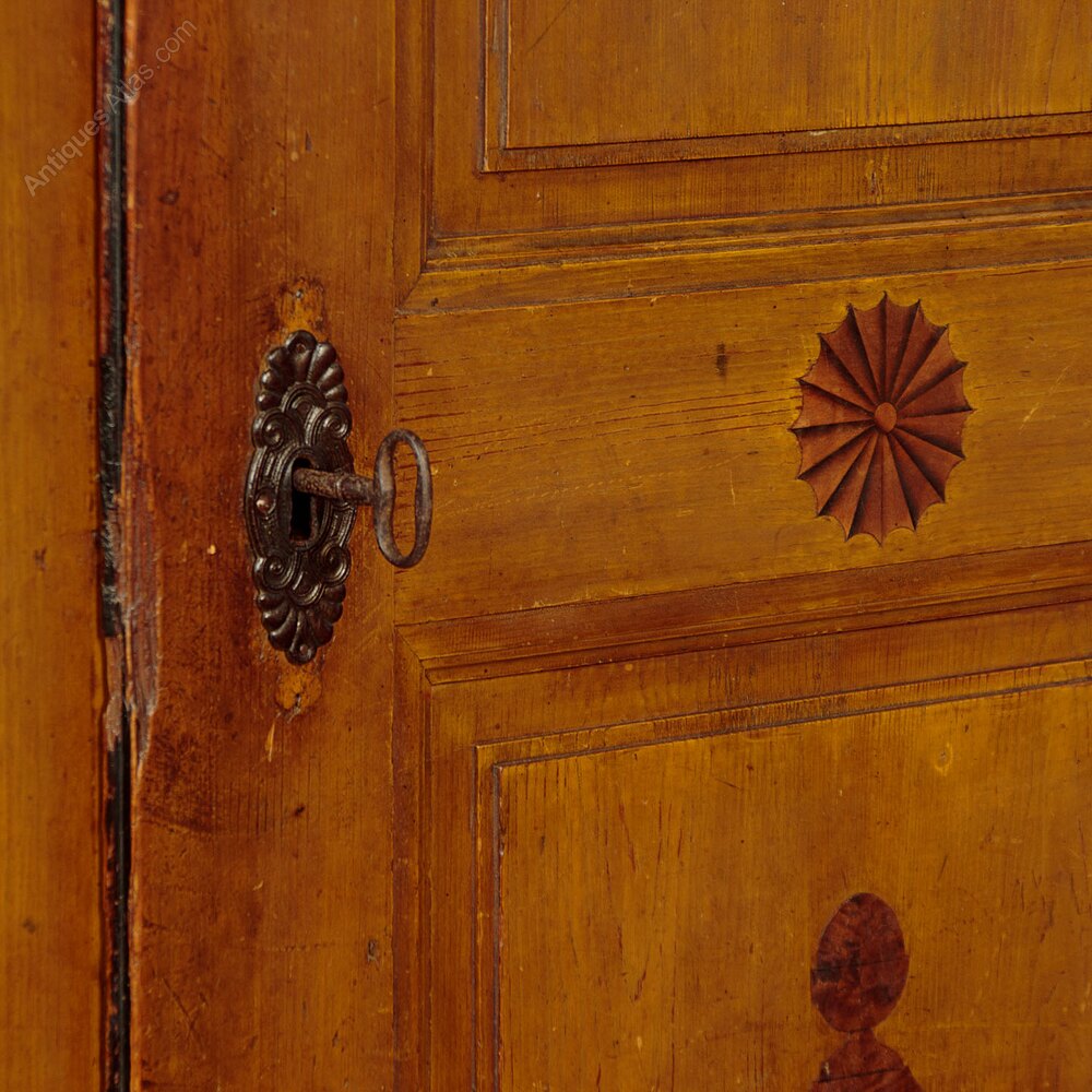 Beautiful pine wardrobe or cloak cupboard, likely from the Austrian / Italian Tyrol or Switzerland, with original painted decoration dated 1852. Single door wardrobe fitted inside with five large wooden peg hooks, a single shelf of full depth (16") plus a little 6" deep shelf above. Moulded cornice over the name Elizabeth Lirhti and the date 1852 painted in beautiful gothic scrip over the door. The door featuring raised and moulded panels inlaid with Classical urns in flame mahogany. Plus an inlaid marquetry work fan roundel to the centre. Retaining the original lock, escutcheon and key. Burr walnut trim below the door and a painted moulding around the base. Raised on the original turned bun feet. Excellent condition, cleaned and waxed in our workshops.Please contact us for more images, delivery and shipping quotes. Alternatively you are welcome to view and collect at our large warehouse showroom in Llandudno Junction, North Wales (approximately 45mins from Chester). We have a large and ever changing selection of genuine good quality antique furniture of all types and have twice been shortlisted for the Home and Antiques Magazine Antique Shop of the Year Award. 01492 580022.