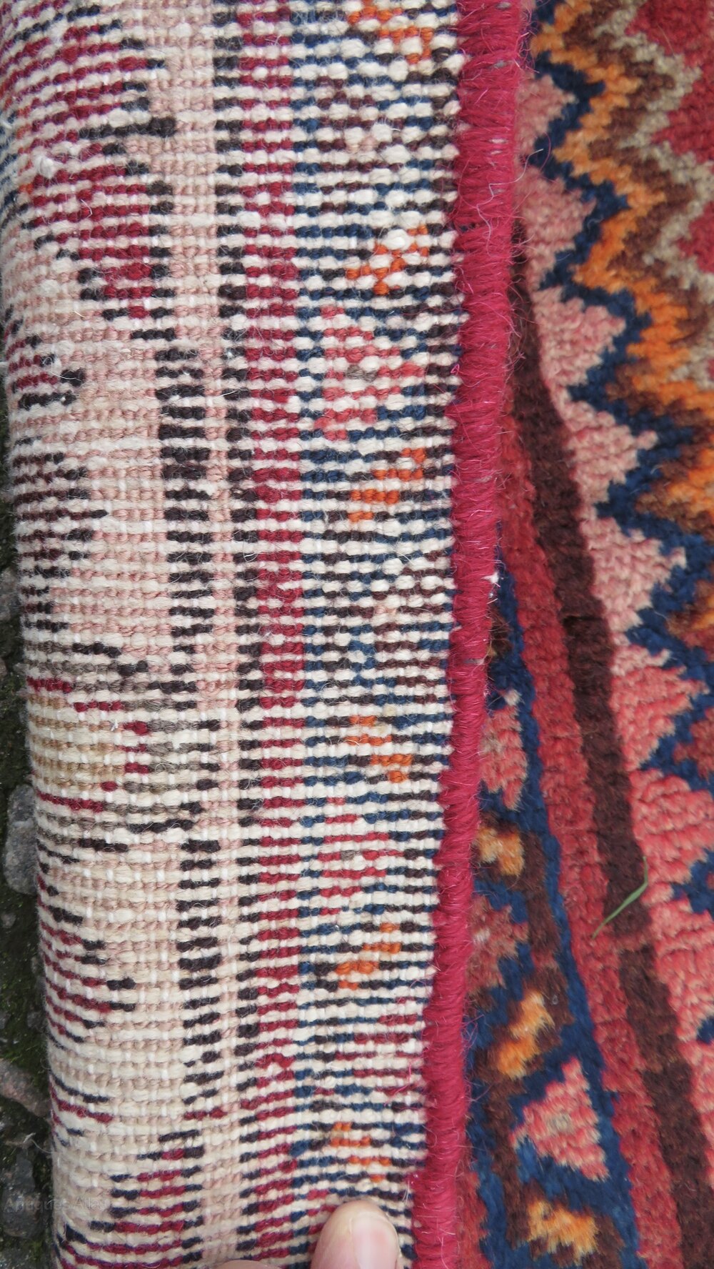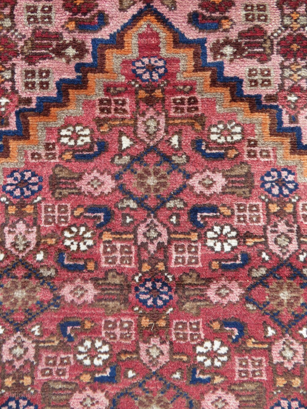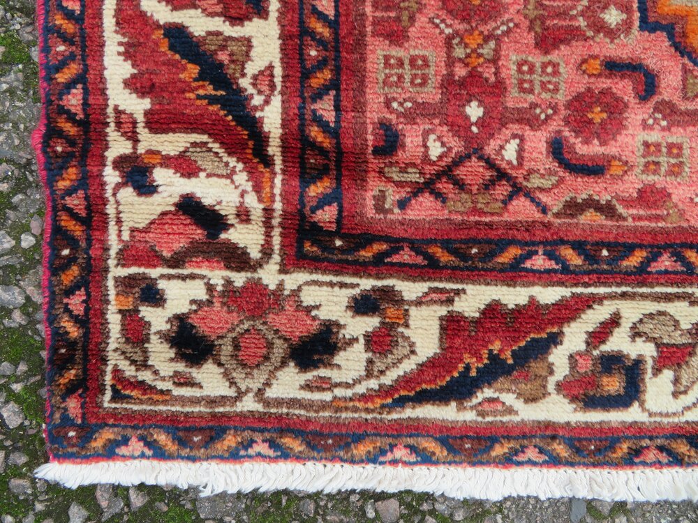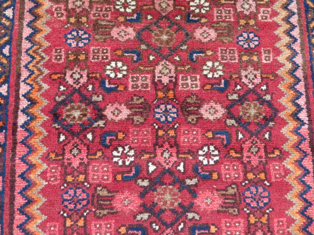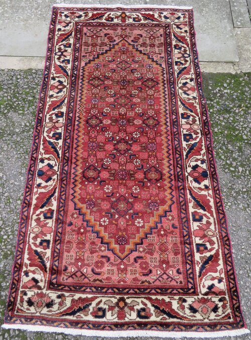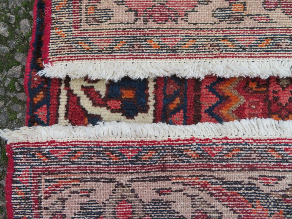West persia. Attractive floral type border with an ivory coloured ground. Central geometric flower heads and motifs kind of a herati pattern on a light red ground with a kind of pinky red outer frame. 6 foot 5 inches by 3 foot 2 inches. 195cm x 97cm. Fringes not measured in size. Wool pile on cotton foundations. Floor ready condition. U. K post £20. Fos 145selling fair priced rugs. Viewings/collections possible. Purveyors of unusual rare distinctive quality tribal rugs & carpets,howard & sons seating,some orientalist items & decorative objects for the everyman.