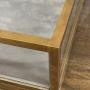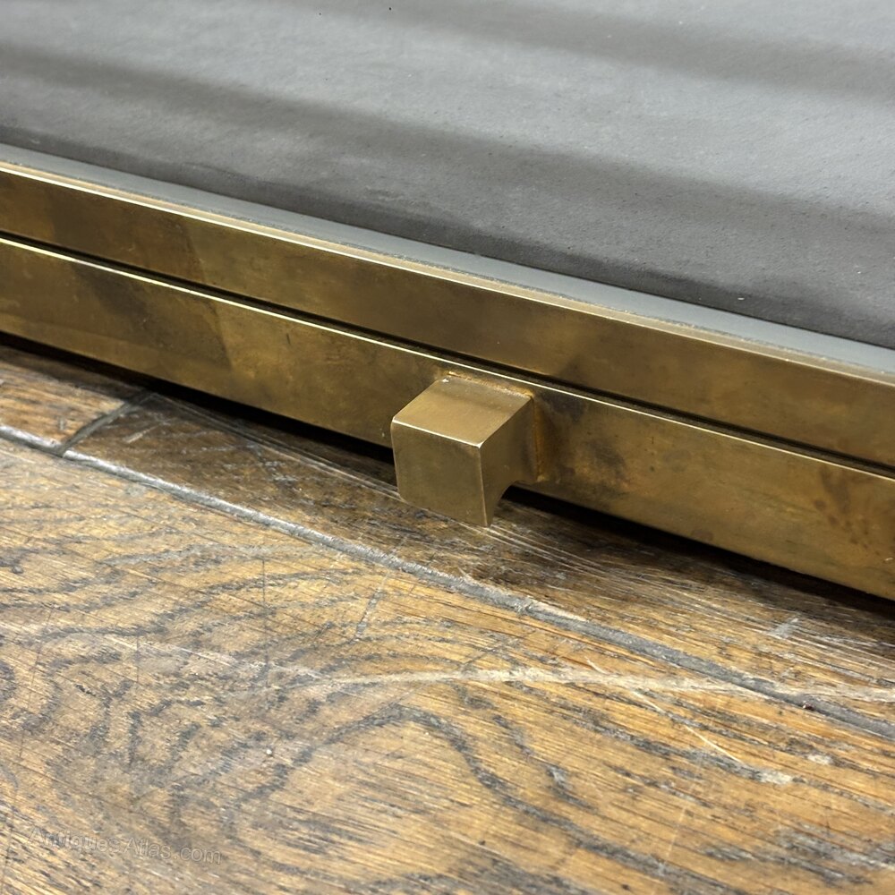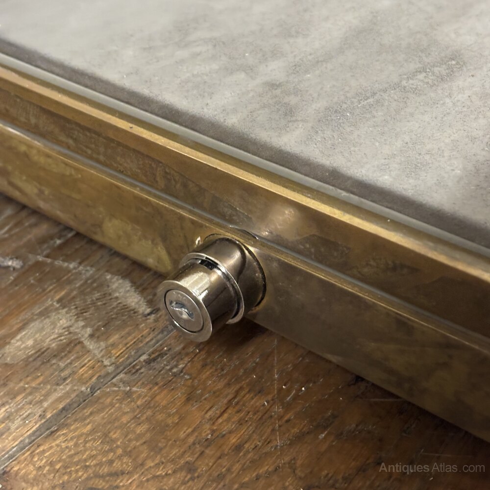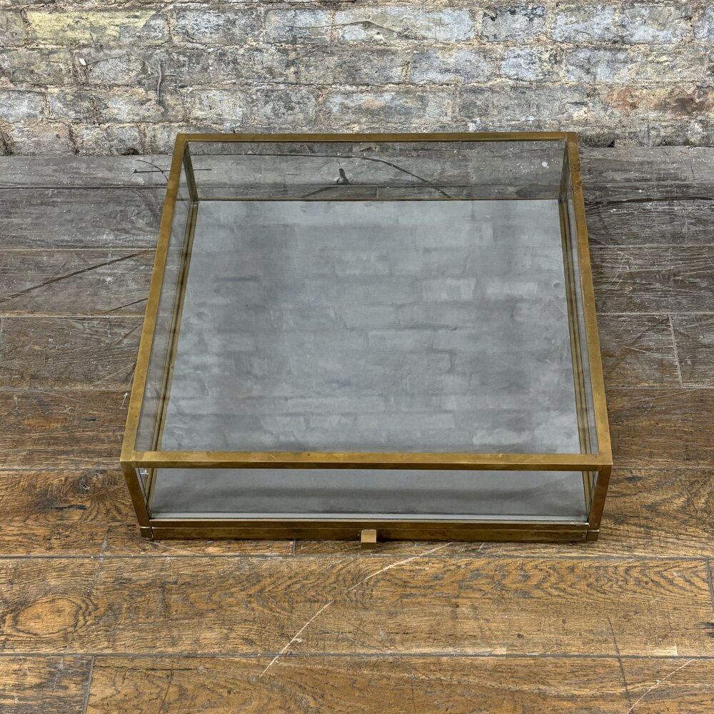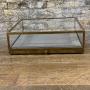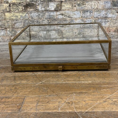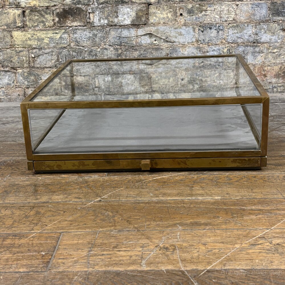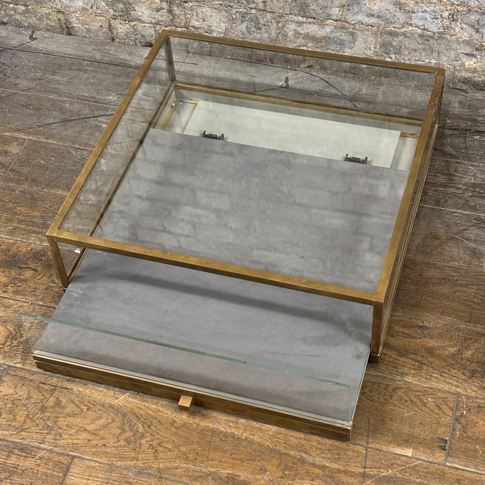 A sleek, low-profile display brass famed countertop display cabinet dating from the late 1960s . Framed in patinated brass with five-sided glass , it features a lockable drawer lined in soft grey fabric, making it the perfect item for showcasing jewellery or small collectibles.H: 19.5 W: 61.5 D: 61.5
