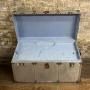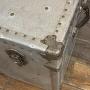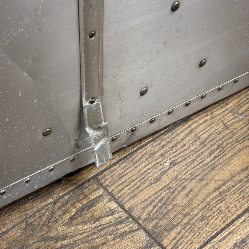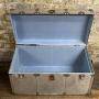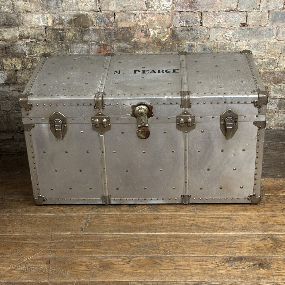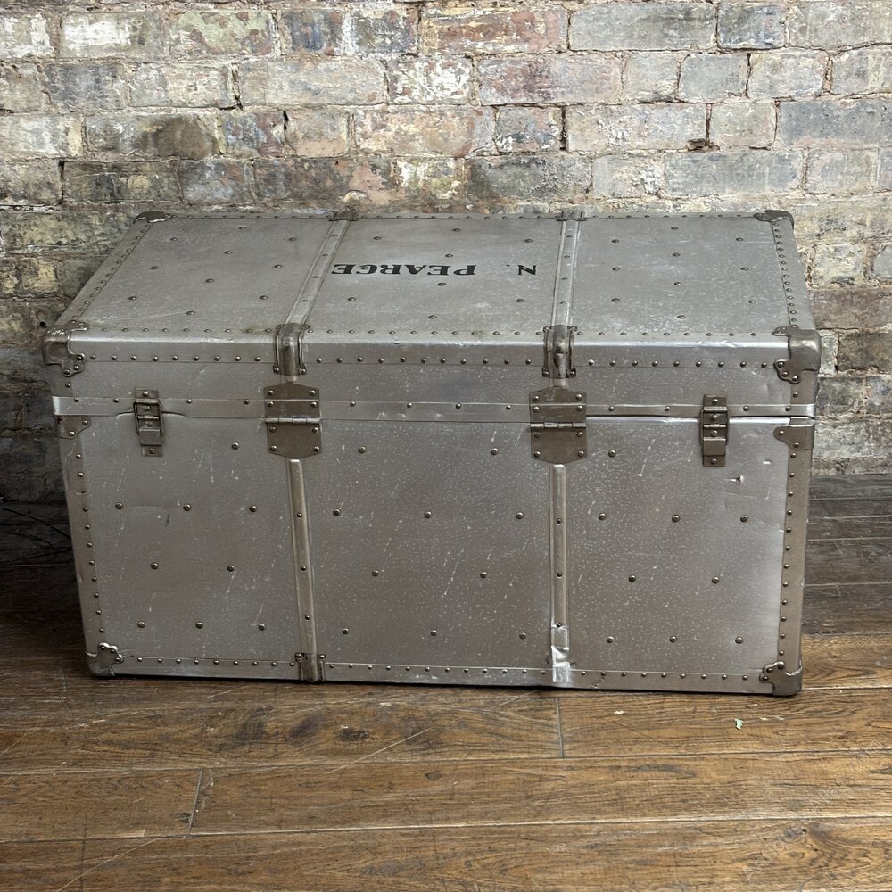 A striking mid-20th century industrial trunk is constructed from riveted aluminium panels, giving it a robust yet lightweight character. Inside, the trunk is lined in a soft blue fabric, complete with the original lift-out compartment, showing signs of use consistent with age. Ideal for use as a coffee table, blanket box, or distinctive storage piece.H: 54 W: 104 D: 54 cm