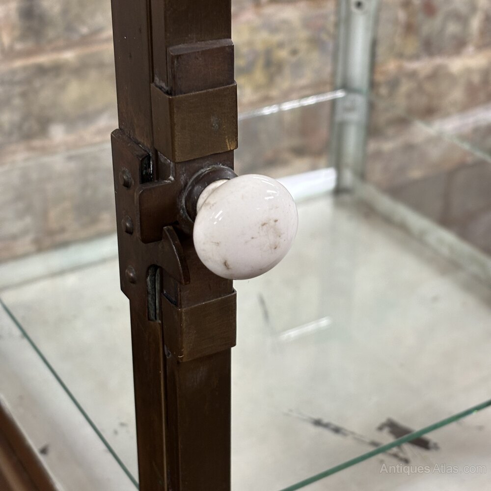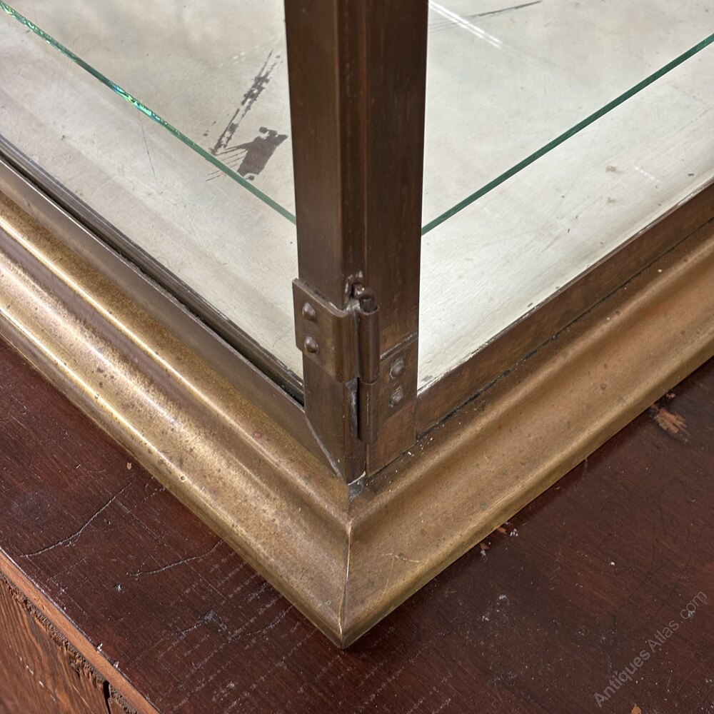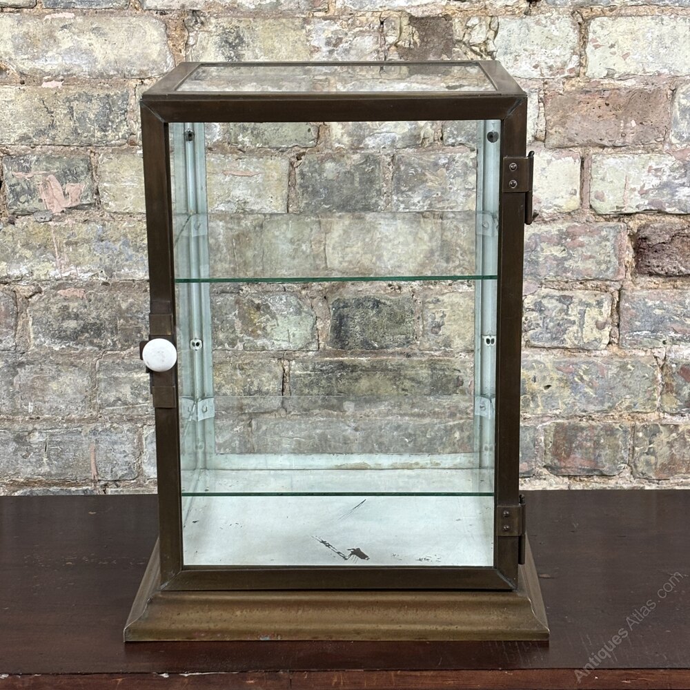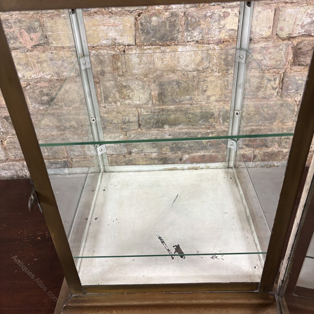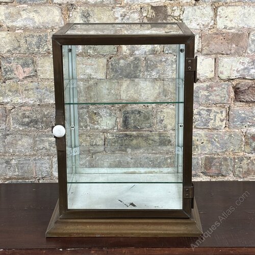 An early 20th-century brass and glass countertop display cabinet, originally used in a pharmacy or medical setting. The cabinet features a brass frame with a stepped plinth base, glazed panels on all sides and top, and two removable glass shelves. It retains its original white ceramic handle and latch. The cabinet has developed a naturally aged patina, giving it a warm, authentic appearance.A beautifully simple and functional piece, ideal for use in a retail or residential interior to display smaller objects, toiletries, or collectibles.