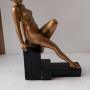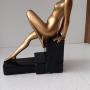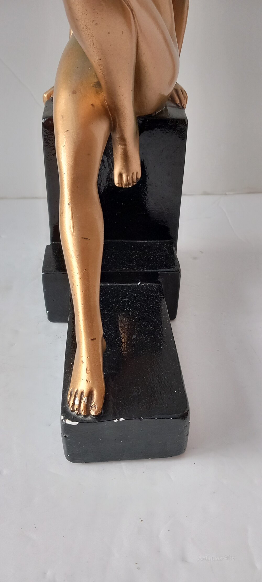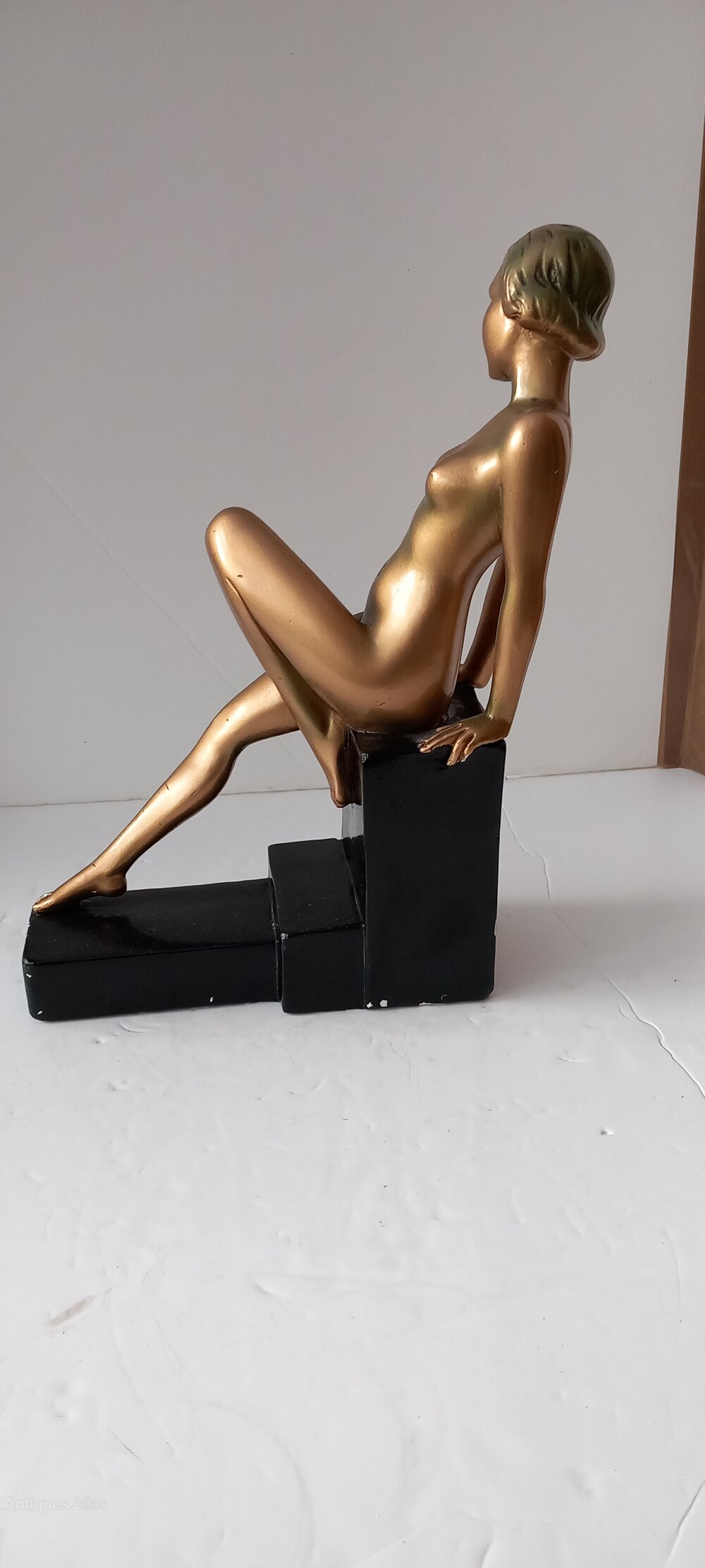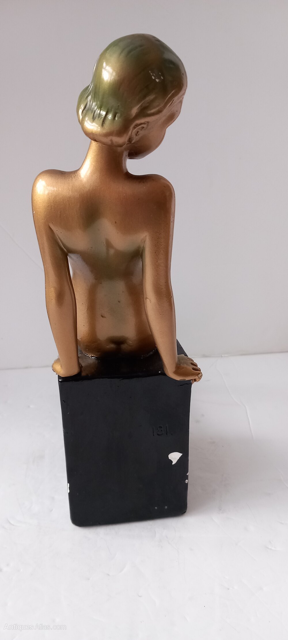 This rare Art Deco 1930 plaster figure by G.Leonardi of Delories which is marked on the back 181 is a stunning example of early 20th century sculpture. The nude figurineis in gold sitting on a black plinth embodies the elegant and glamorous style of the era. Handmade with a length of 20.5cms and a height of 31cms, this original peice exudes sophistication and is sure to make a striking addition to any room. There is a slight removal of some of the paint ( please see pictures ) which is wear nd tear but with no damage to the plaster. Should you require any further information or pictures please do not hesitate to contact us. We offer UK and overseas postage.The item can be collected in person from our unit or can be couriered ( please enquire for costs ). We can also deliver overseas.