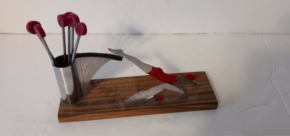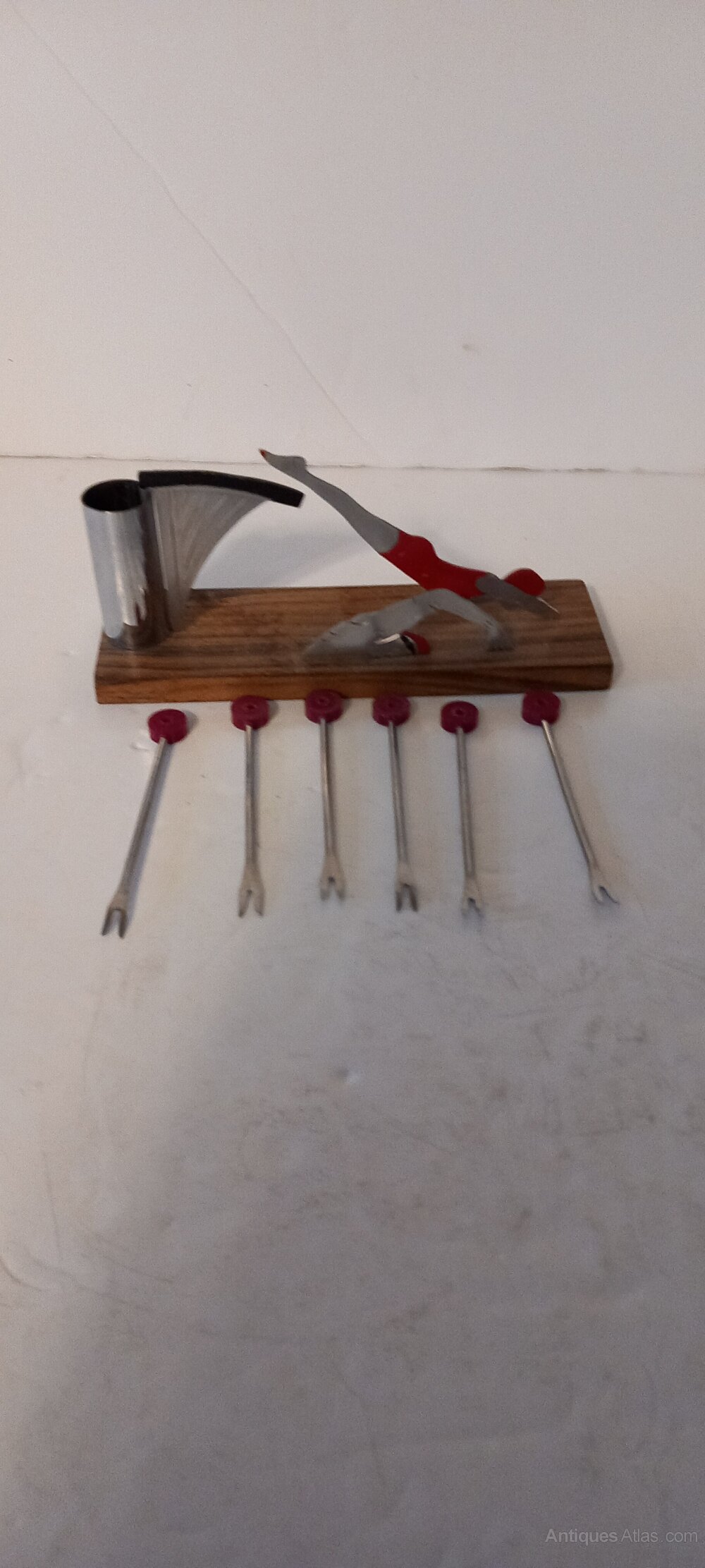 This original French Art Deco Sudre Novelty Cocktail set depicts 2 swimmers ( one swimming and one diving from a board ) complete with 6 cocktail sticks is a stylish and unique accessory of collectors of bar wear. They are mounted onto a macassar wooden base and measures 15.5cms in length x 10cms high ( from base to top of cocktail sticks ) and 5cms wide. It is in good condition. Should you require any further information or pictures please do not hesitate to contact us. We offer UK and overseas postageThe item can be collected in person from our unit or can be couriered ( please enquire for costs ). We can also deliver overseas.