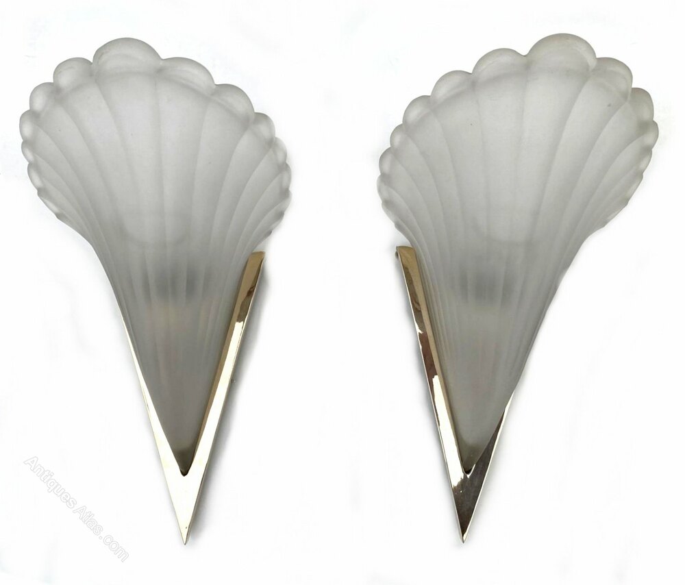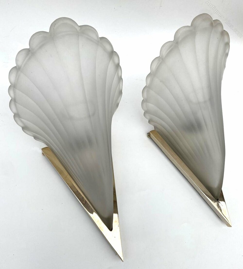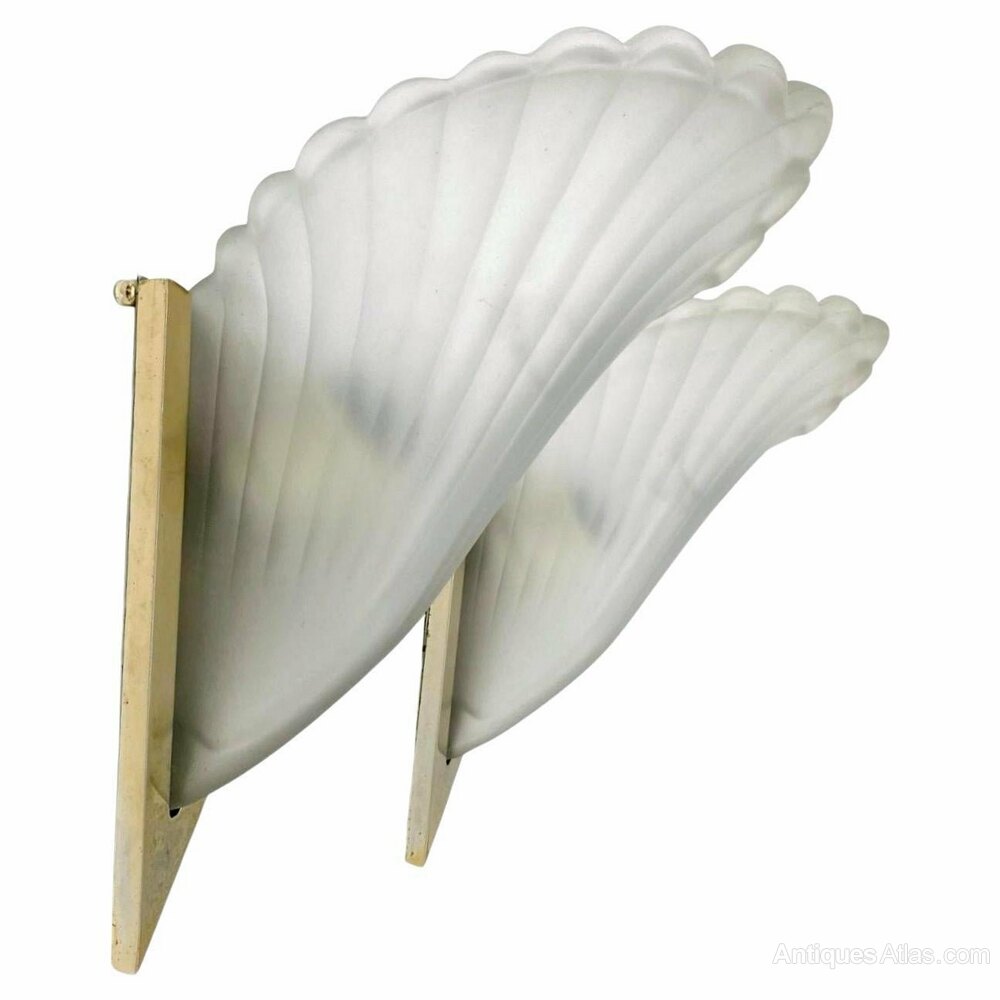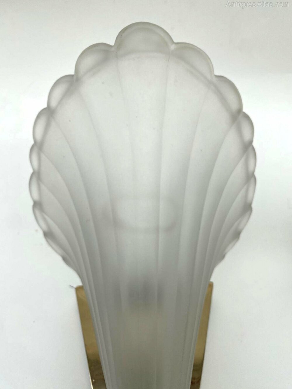 We really can't sing the praises of these fabulously stylish wall lights enough. Originating from France these Art Deco matching pair of lights feature very heavy thick satin pressed glass slip shades which sit snugly inside brass wall brackets. Condition is great, the odd little nibble to the edges but these are hidden completely when held in brackets. Both lights have standard UK bayonet bulb holders. Recommend no more than 40 watts for best ambient lighting. These are a great size and will offer the perfect impact and impression to any room or entry way.FREE Dimensions