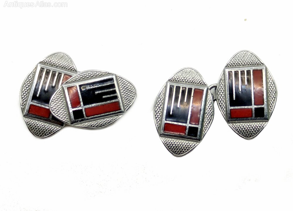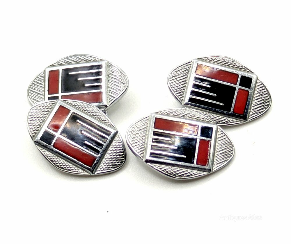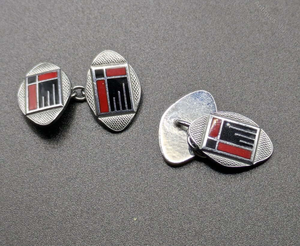 Extremely stylish and totally original are these matching pair of English Art Deco modernist enamel cufflinks dating to the 1930's. Fabulous geometric patterning and colour, with a slight modernist feel. Certainly can't be confused with any other era can they? Condition is excellent with minimal signs of age. Ideal for today's dapper gentleman. They have good and secure links making them a wearable item of vintage jewellery. These outstanding cufflinks would make the finest addition to any collection.All our jewellery is sent out in a complimentary gift box via first class FREE delivery.