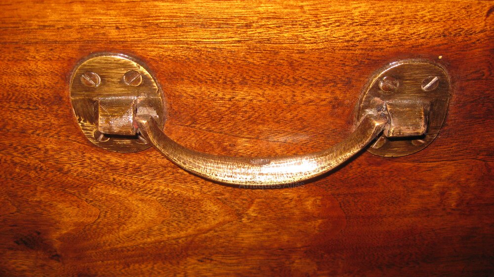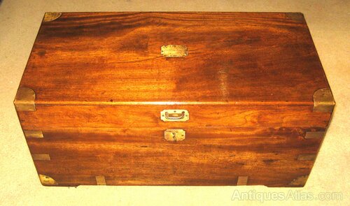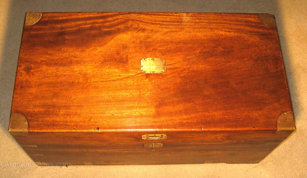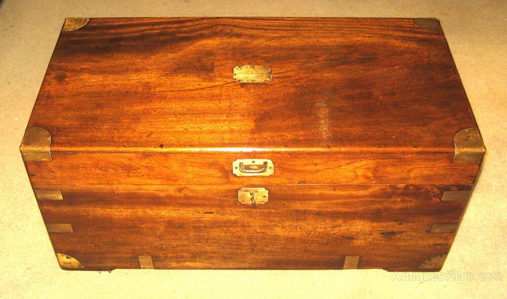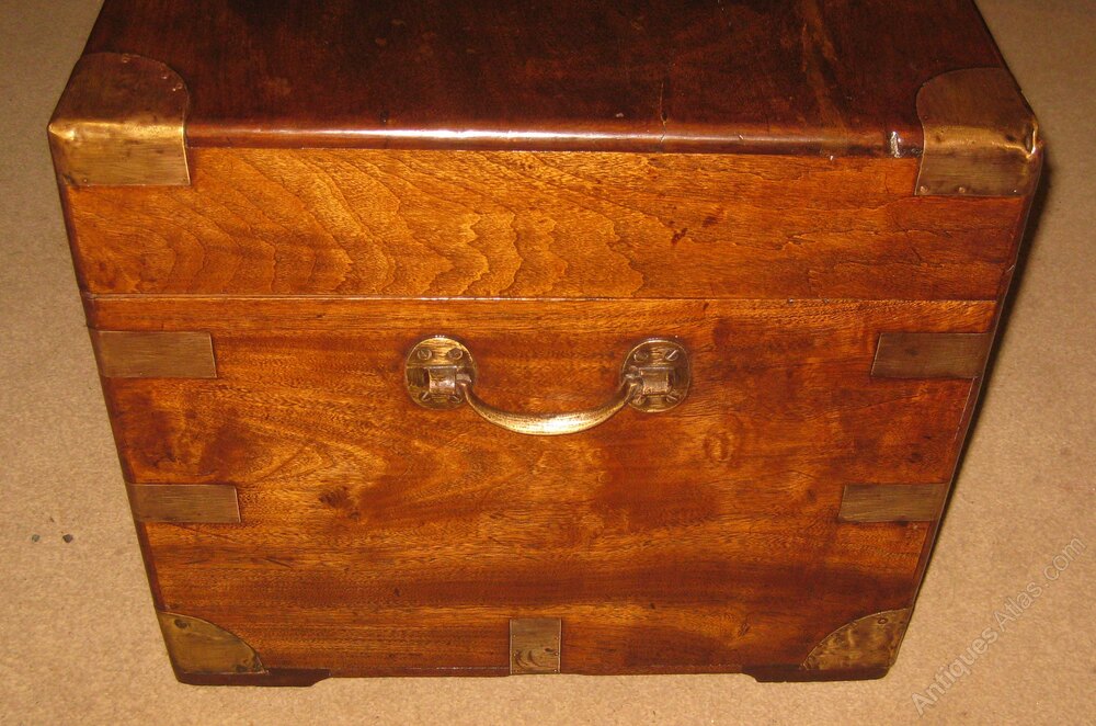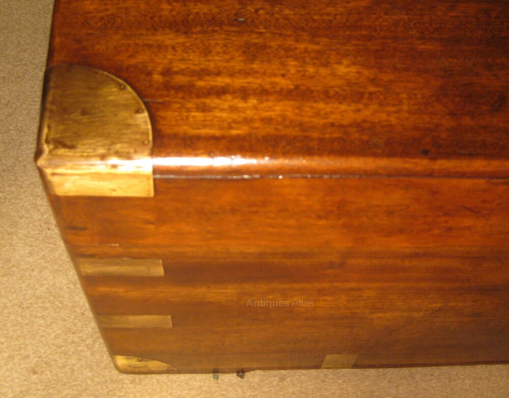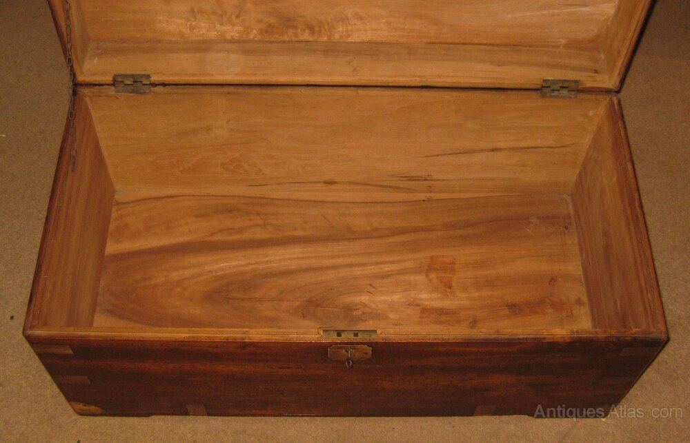 Beautifully grained Victorian, solid camphorwood, campaign trunk. Of a good solid construction with the original heavy solid brass lifting handles, brass corner strapping, top name plate and working lock with key. Ideal for use as a coffee table or stylish stand for a television.Size 35 x 18 x 16 inches tall (89 x 45 x 40 cm tall)