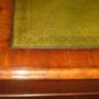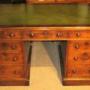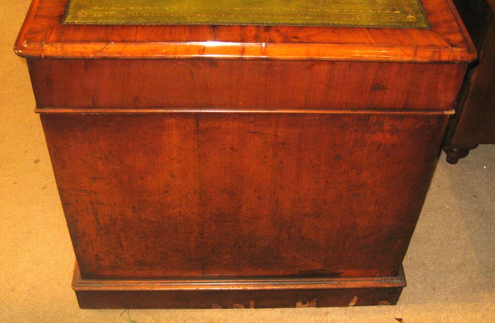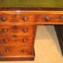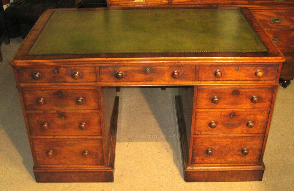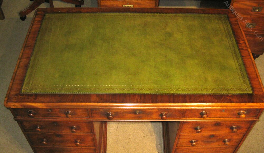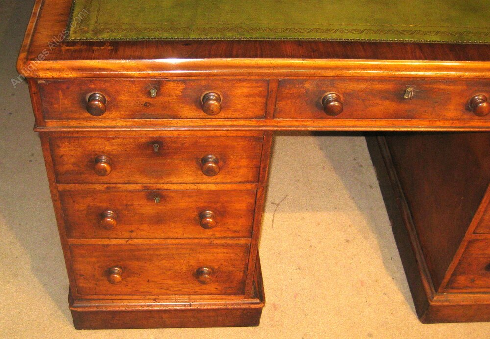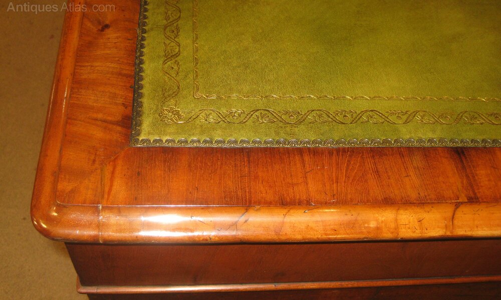 Beautiful Victorian faded mahogany pedestal desk. The 9 drawers of a good hand cut dovetailed construction with oak and pine linings, the original turned knob handles and working locks. The top with hand carved mouldings, rounded corners and with a new full hide green leather writing surface. The back with panelled door effect. With the makers label 'J. Alderson, Cabinet Maker & Upholsterer, Bedford Terrace, Derby Road. Bedford' (?) Shown before restoration.Size 50 x 30 x 29 inches tall, without castors, which could raise it by 4cm (126 x 76 x 74 cm tall)