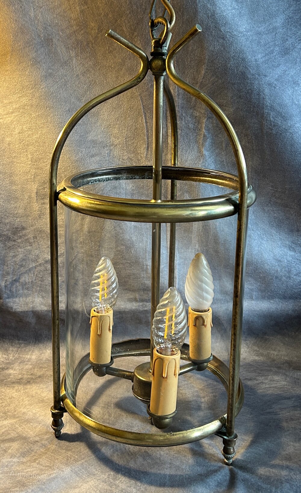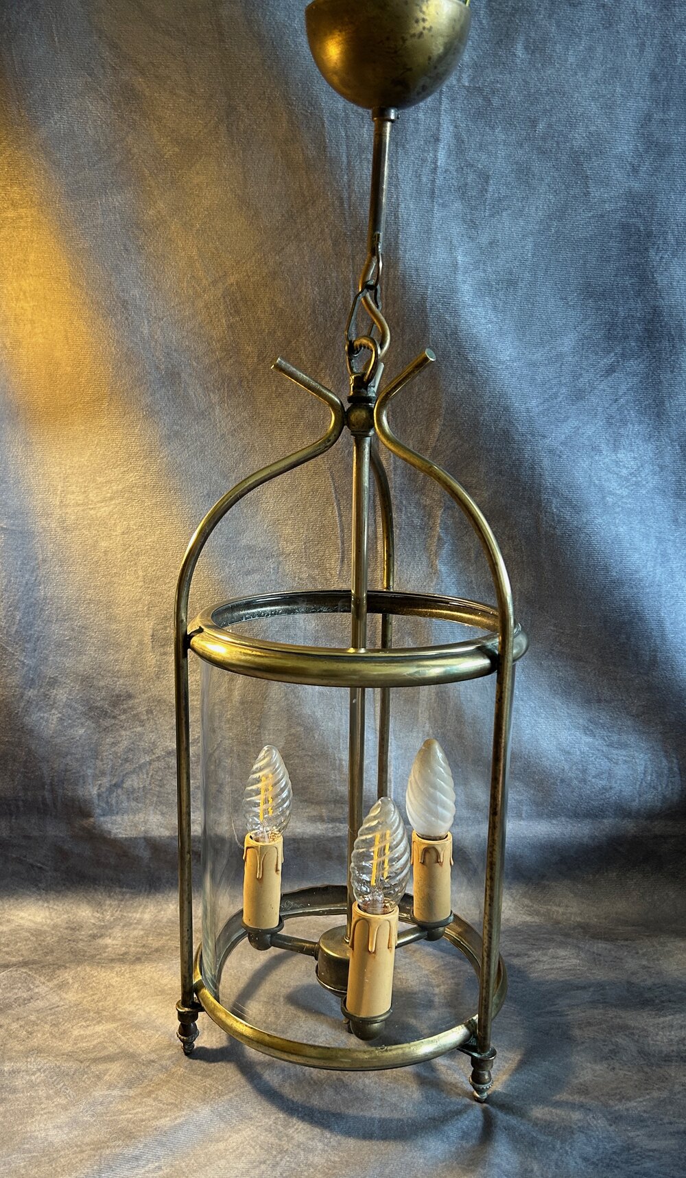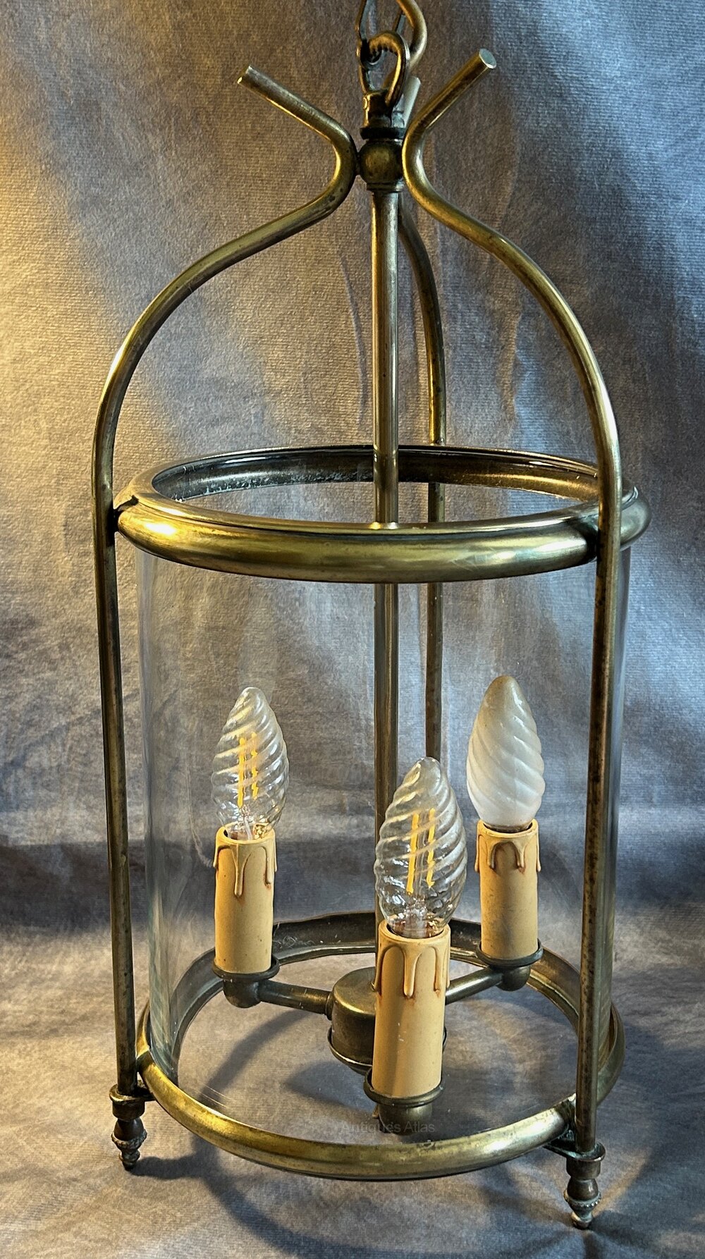 French brass three light vintage hall lantern, the three horizontal light fittings surrounded by one circular convex glass tube and held within a plain brass frame with decorative finials and fluid brass support rods from base to canopy, having the original chain and ceiling rose, nice quality patination and good size. Will need to be re-wired as wiring is as existing that being French.Dimensions: H: 18.5"/47cm W: 8"/20cm Excluding Chain & Rose