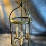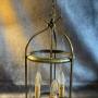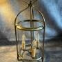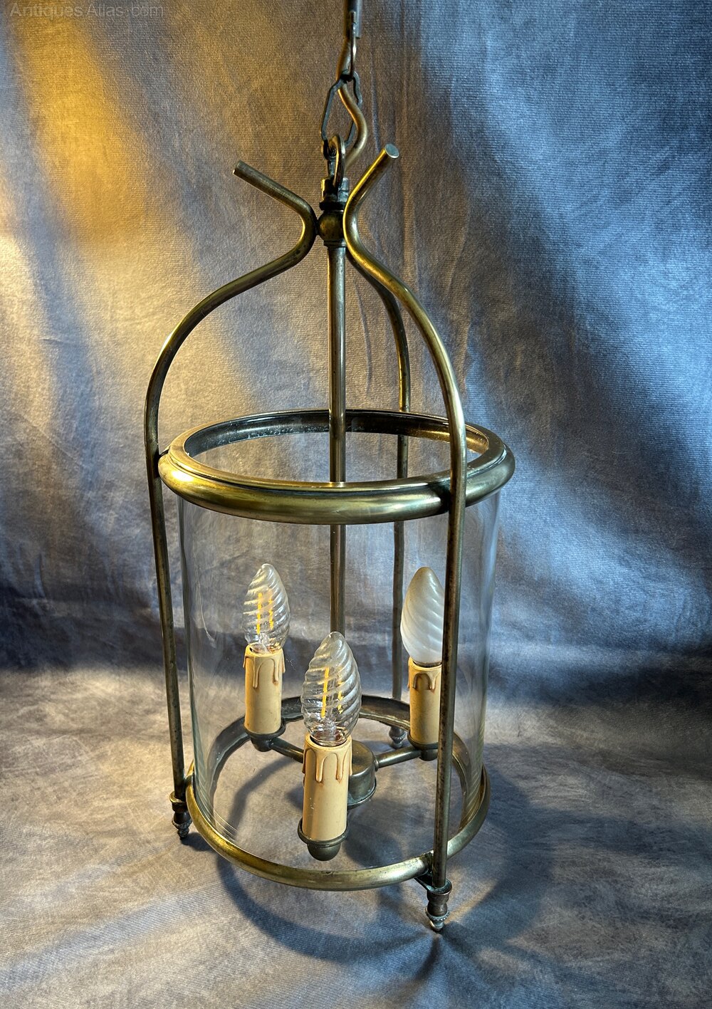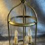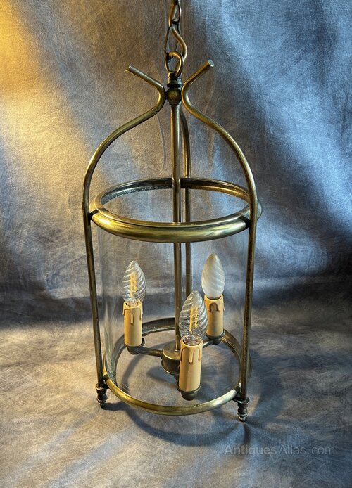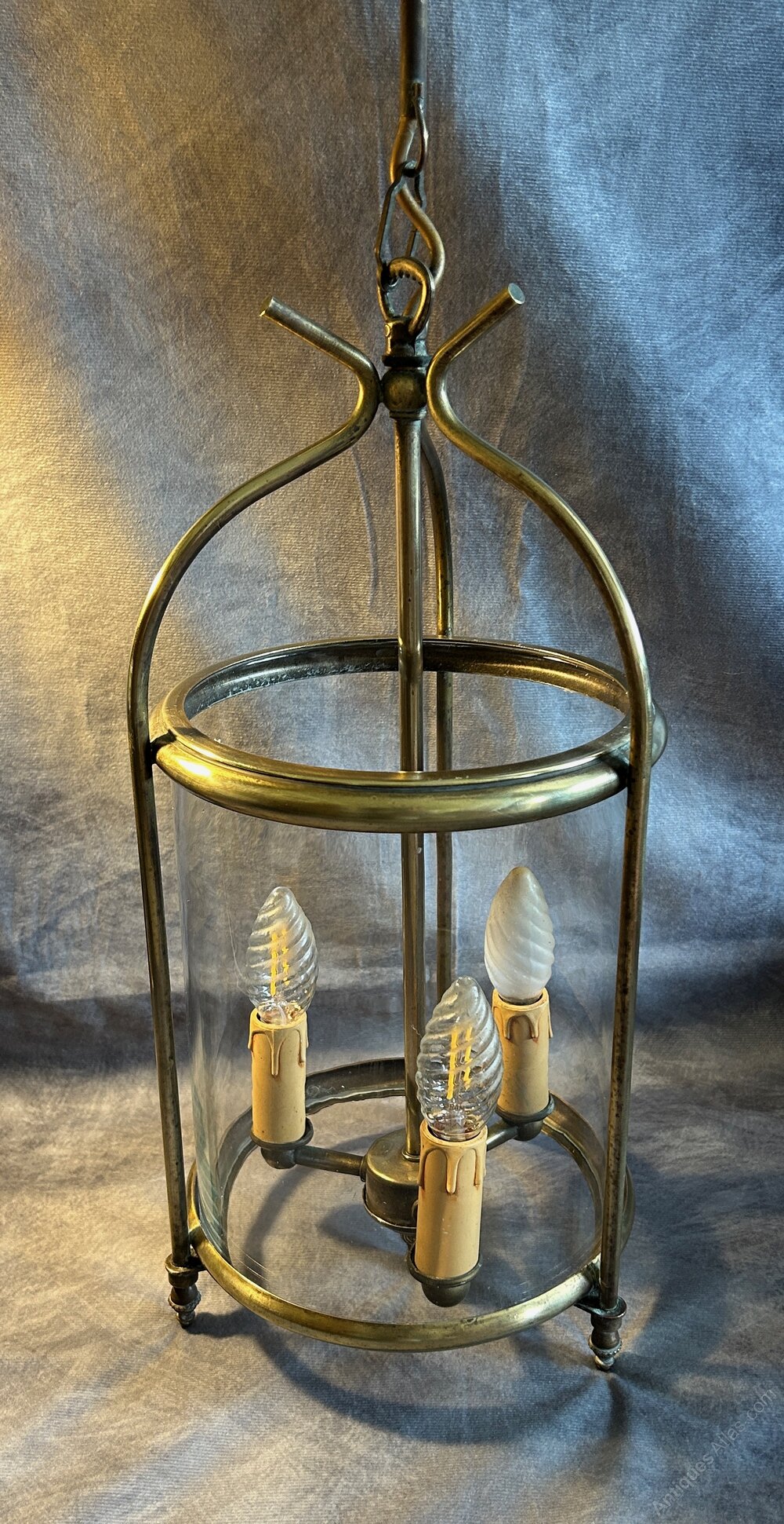 French brass three light vintage hall lantern, the three horizontal light fittings surrounded by one circular convex glass tube and held within a plain brass frame with decorative finials and fluid brass support rods from base to canopy, having the original chain and ceiling rose, nice quality patination and good size. Will need to be re-wired as wiring is as existing that being French.Dimensions: H: 18.5"/47cm W: 8"/20cm Excluding Chain & Rose