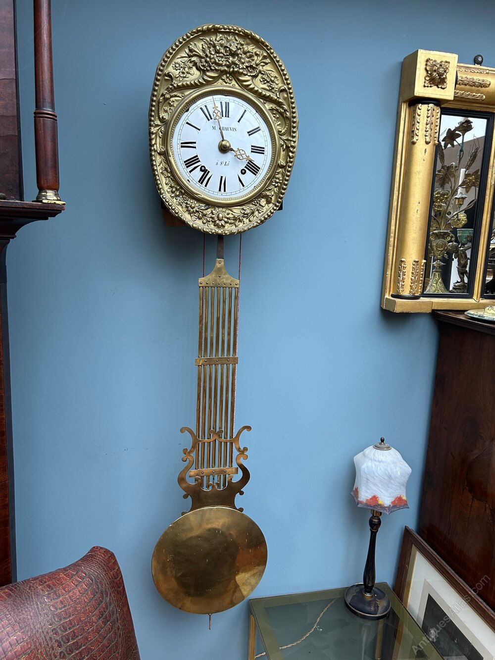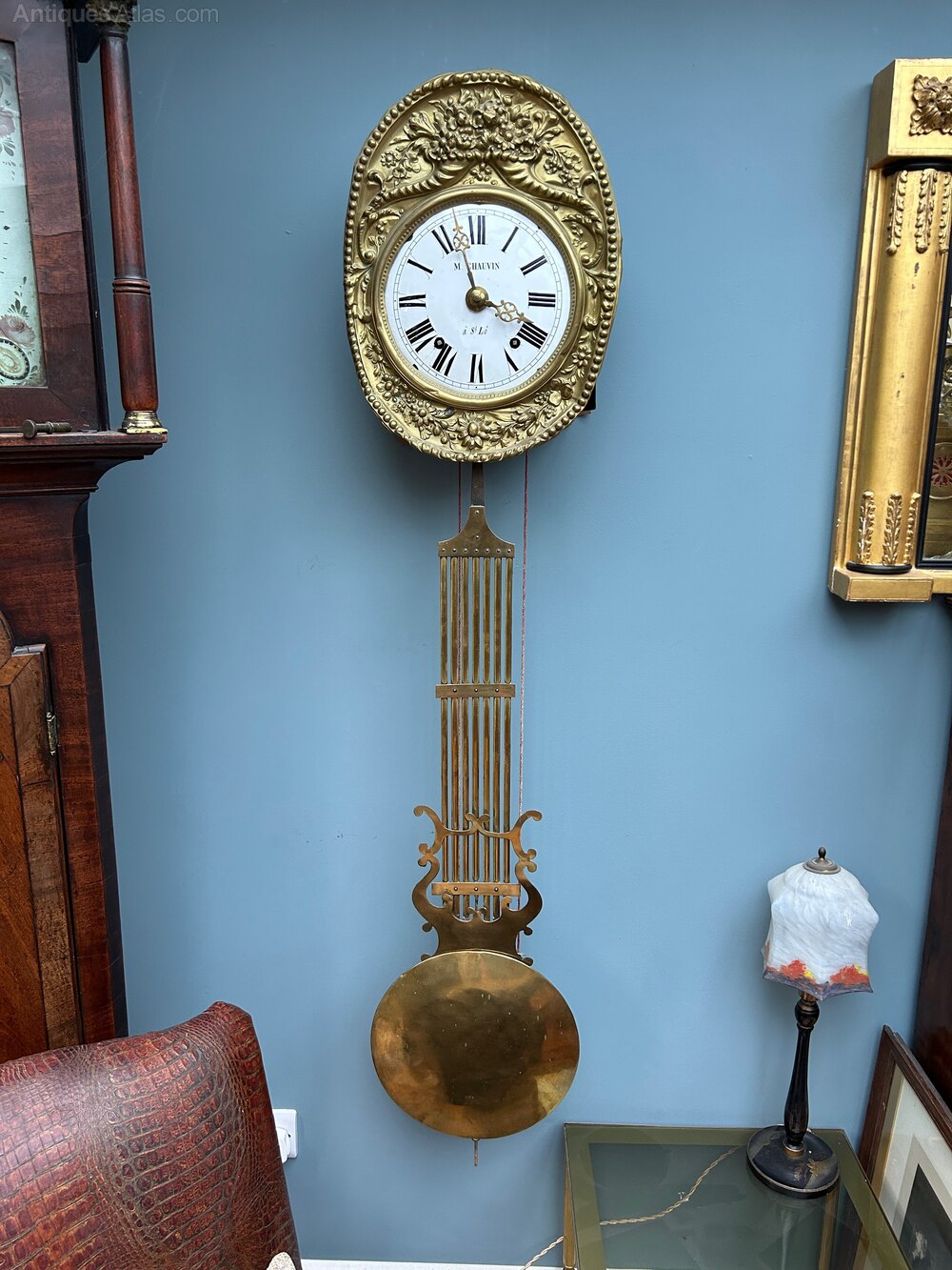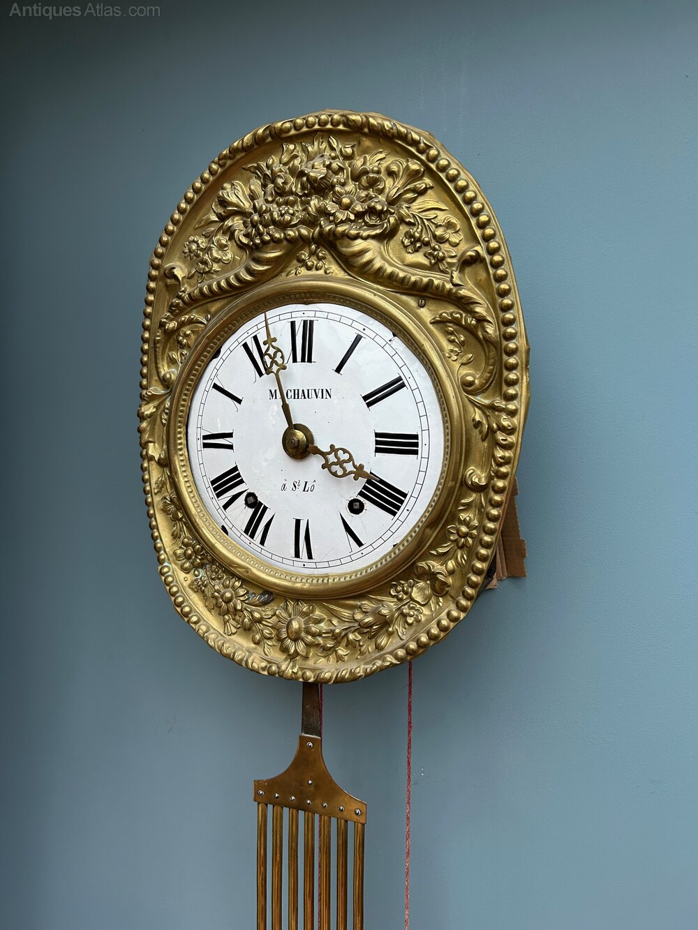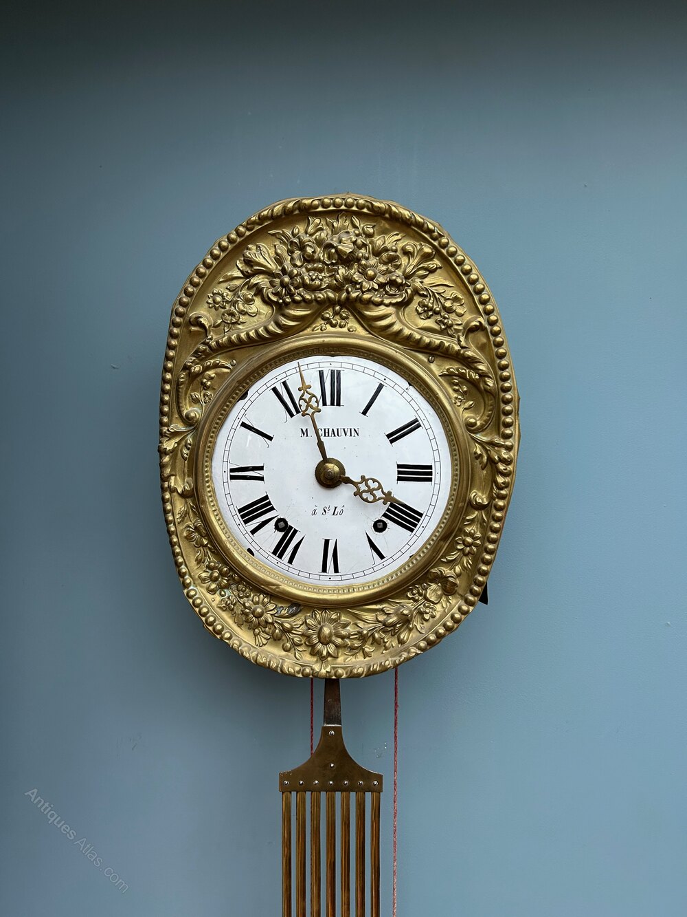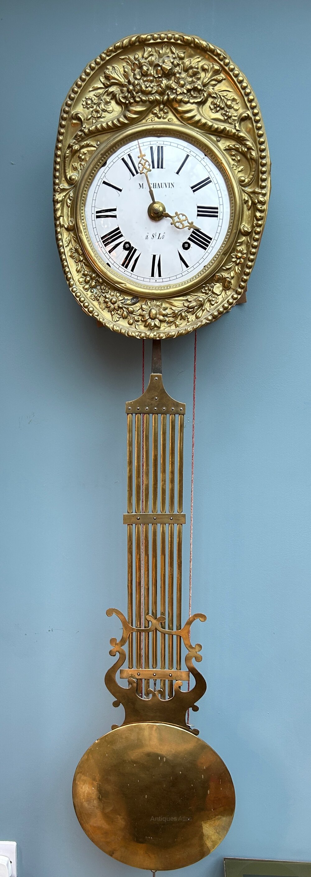 Being a 19th century piece, this French eight-day striking brass wall antique clock has an embossed floral oval surround to the face which is an enamel dial marked 'M Chauvin a St. Lo', with a lyre shaped pendulum.