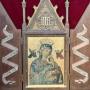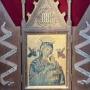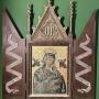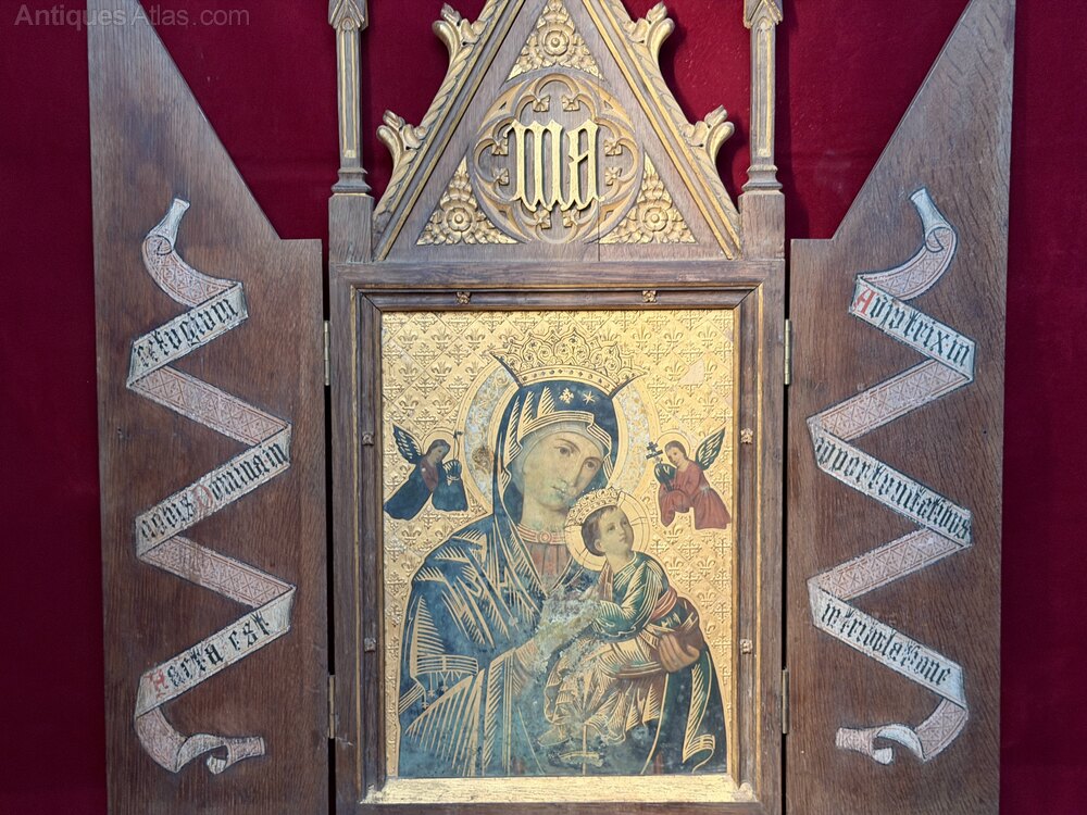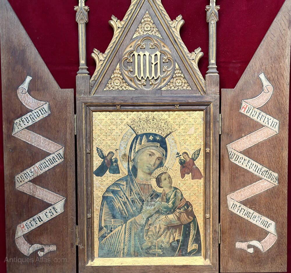 Late 19th Century Religious Icon oil on metal plate (probably copper) painting of the Virgin Mary & Child - Our Lady of Perpetual Help.Set in a very attractive carved & gilded oak or mahogany Gothic Revival cabinet frame, with scroll decorated doors.
