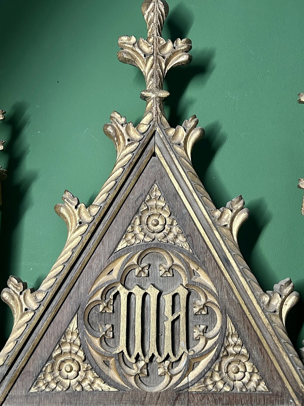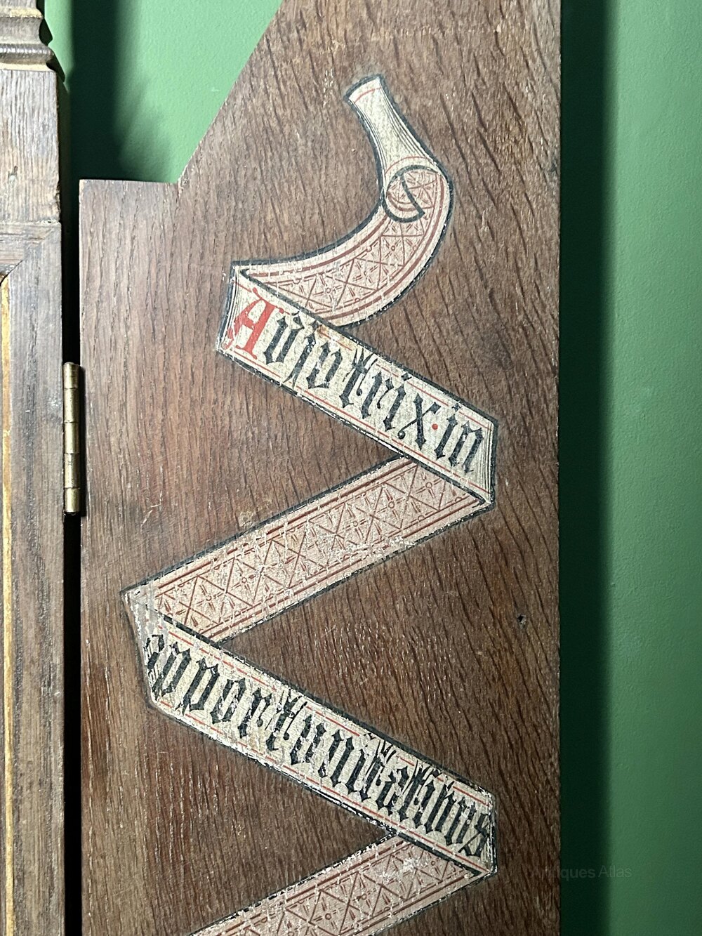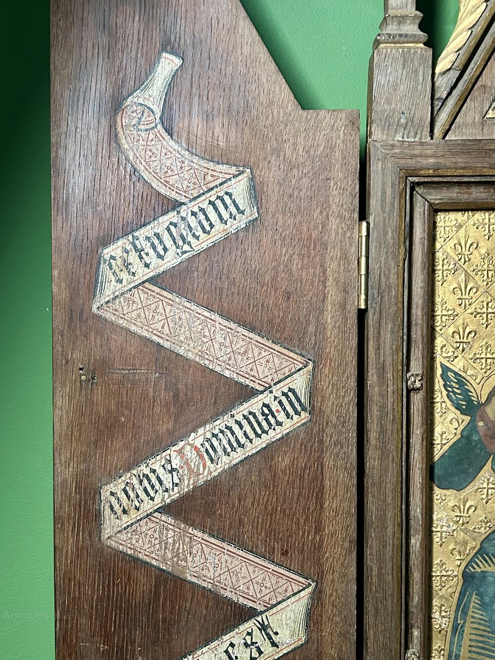 Some scuffs, scratches and paint loss to the Madonna’s hands. Possibly caused by the doors closing. Otherwise good colour and detail to the rest of the painting. The cabinet frame is in good condition, with only small loss to the top of the left side decorative tip.