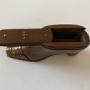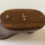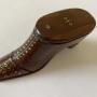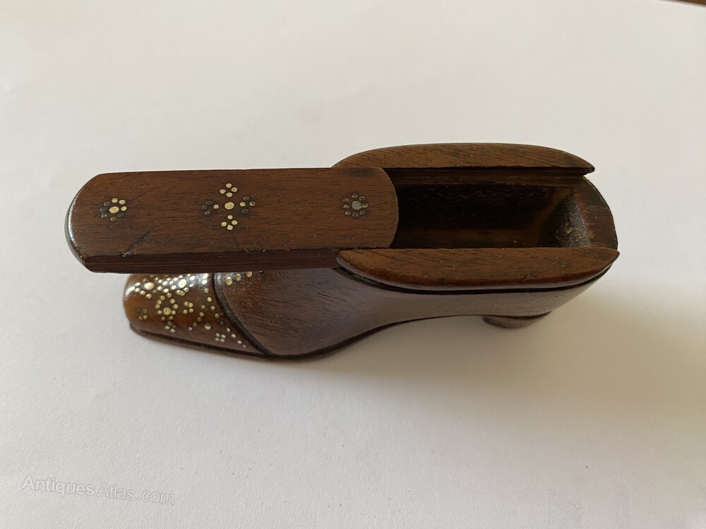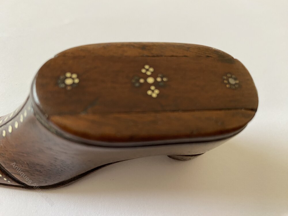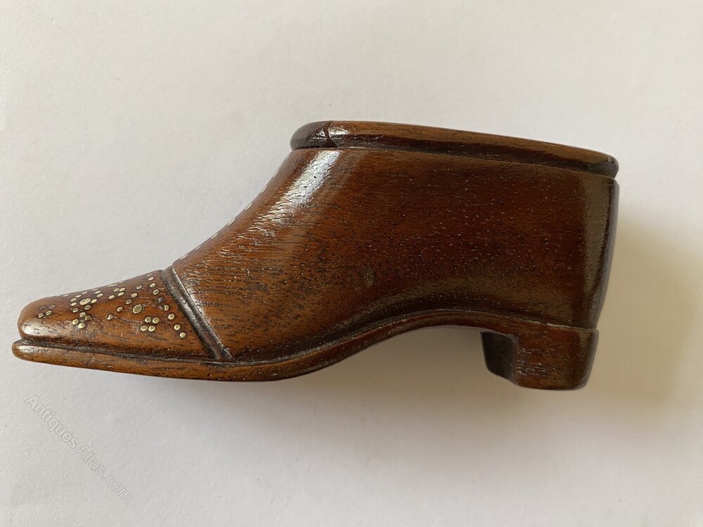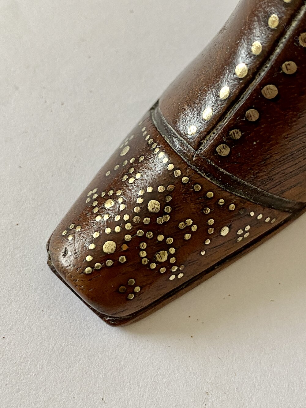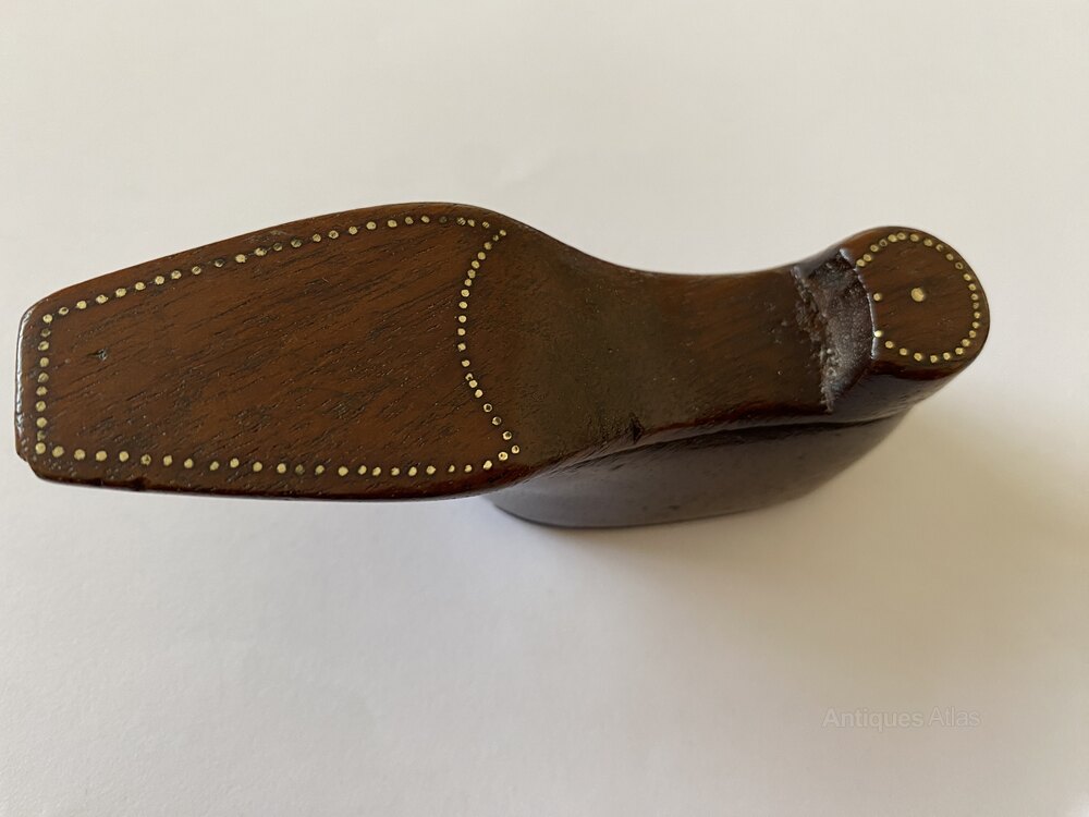 A quality Mahogany Snuff Shoe with lovely detailed Brass Pique work to Toe,Sole and Slide.All in excellent condition. Loveley Patination. c.1830/40. Measures 10cms (4") long.