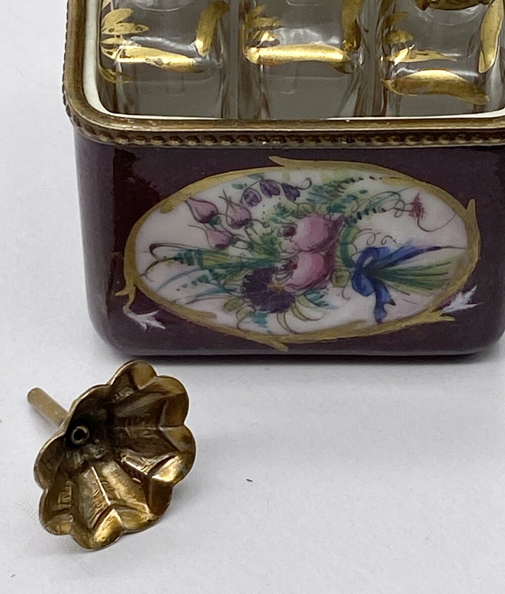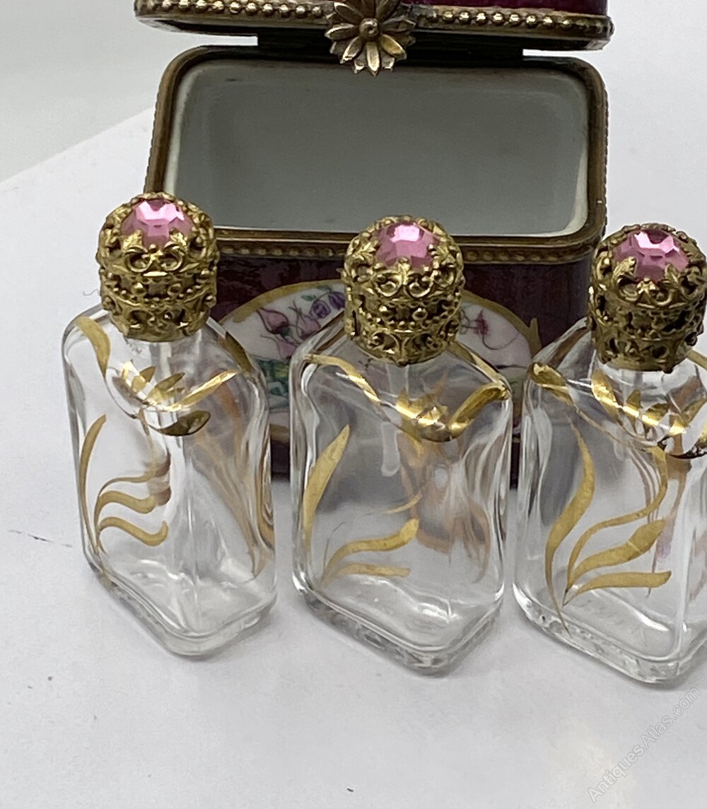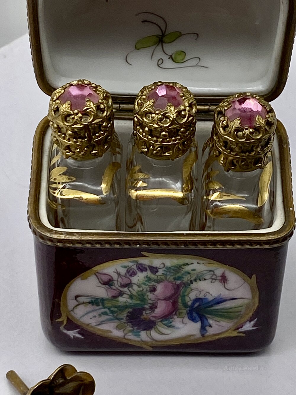 A Limoges Hand Painted Porcelain Casket enclosing three Gilt Decorated and Pink Crystal inset and Ormolu screw tops each with original Dipper.Also original Gilt Funnel. Ormolu Mounts.Closes securely.Dimensions:-7cms x 5cms x 3.5cms.c. 1940/50I am listed as a Private Dealer but some of my Stock can be viewed at The Antique Shop, 53, High Street Heathfield E.Sussex.If you wish, I am am able meet you there to discuss any items and also bring along any items which are not on Antiques Atlas but not displayed in the Shop.