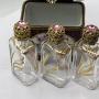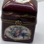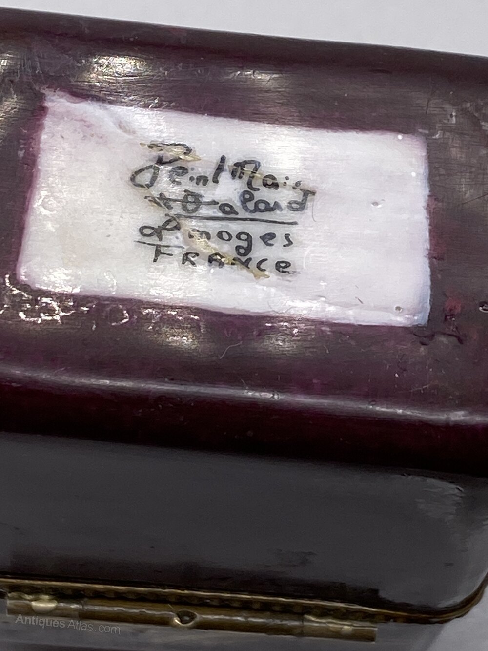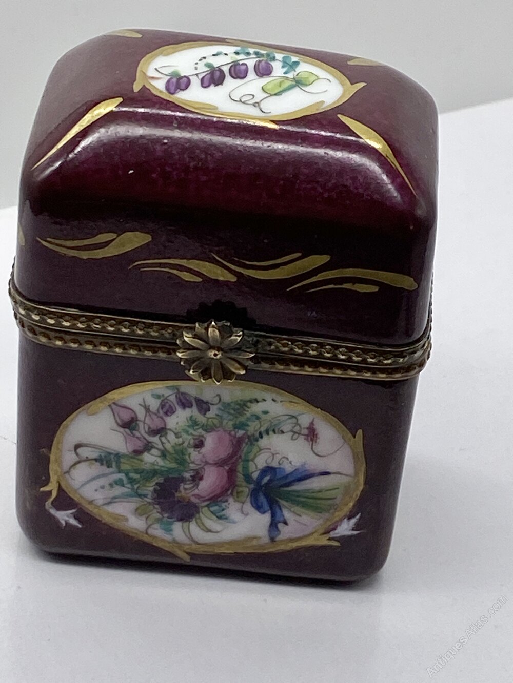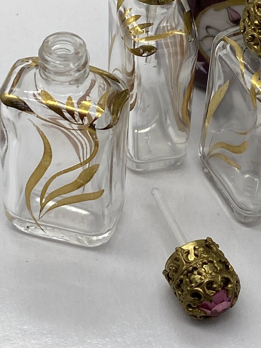 A Limoges Hand Painted Porcelain Casket enclosing three Gilt Decorated and Pink Crystal inset and Ormolu screw tops each with original Dipper.Also original Gilt Funnel. Ormolu Mounts.Closes securely.Dimensions:-7cms x 5cms x 3.5cms.c. 1940/50I am listed as a Private Dealer but some of my Stock can be viewed at The Antique Shop, 53, High Street Heathfield E.Sussex.If you wish, I am am able meet you there to discuss any items and also bring along any items which are not on Antiques Atlas but not displayed in the Shop.