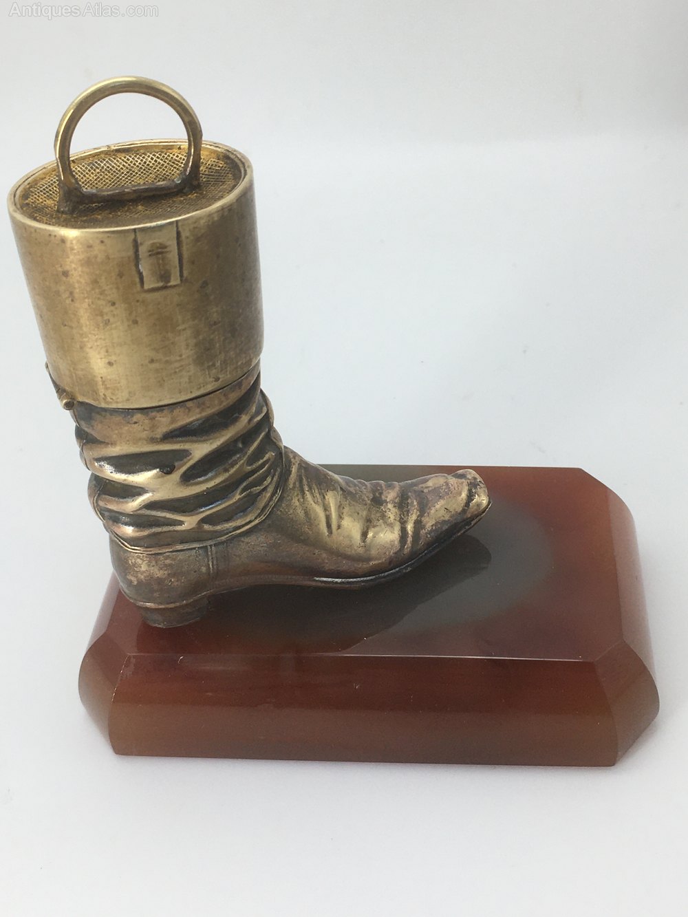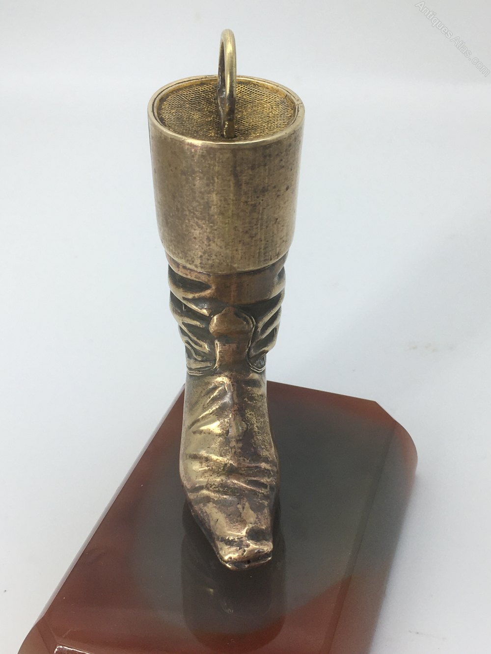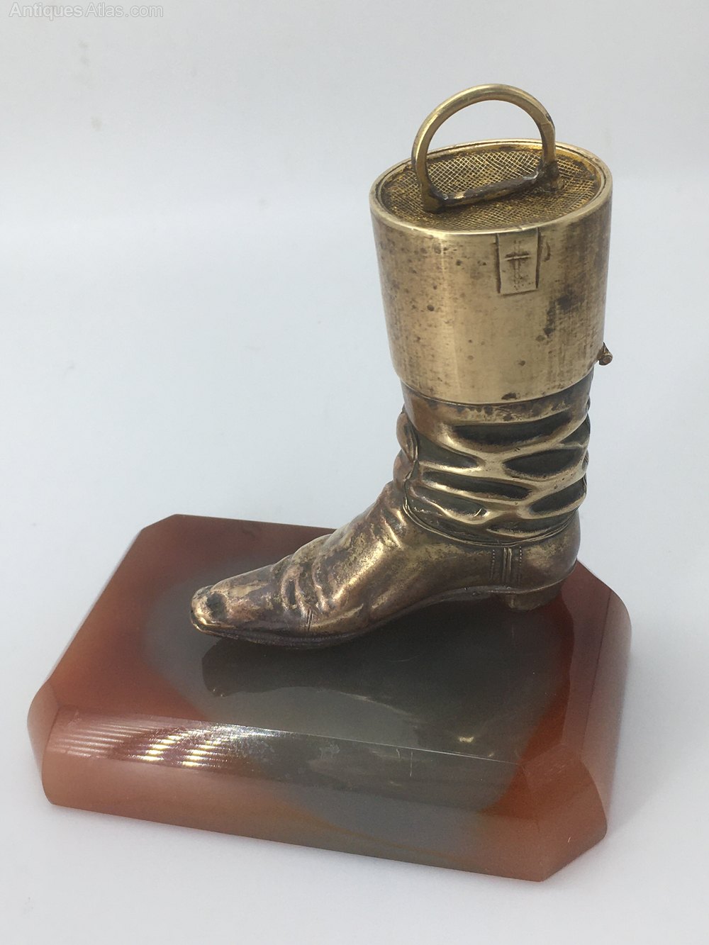 Very unusual Vesta/Matchsafe in form of a Boot.The 'strike' is on top of the lid which has a ring pull to open the Boot and store Matches. It is mounted on a rectangular base of Cornelian.Excellent condition.I am listed as a Private Dealer but some of my Stock can be viewed at The Antique Shop, 53, High Street Heathfield E.Sussex.If you wish, I am am able meet you there to discuss any items and also bring along any items which are not on Antiques Atlas but not displayed in the Shop.