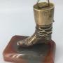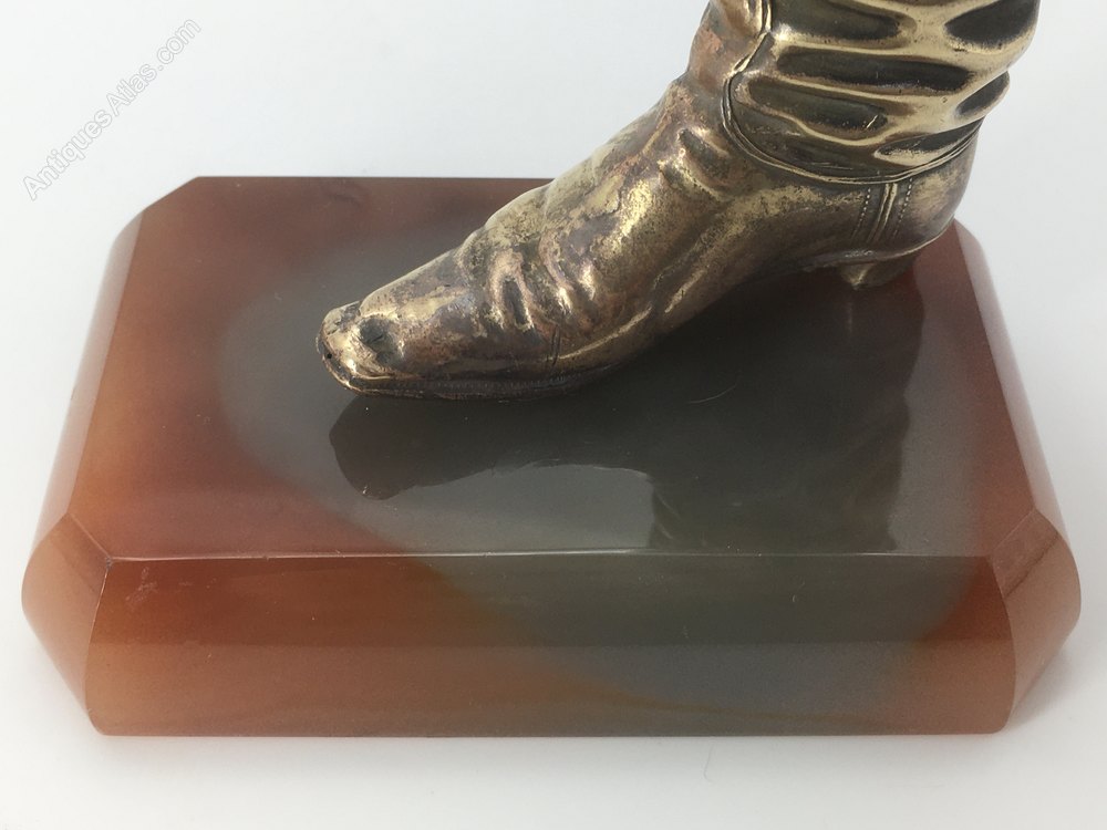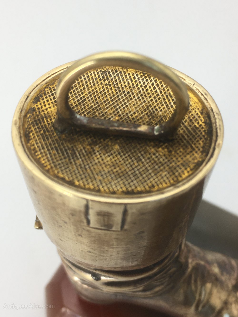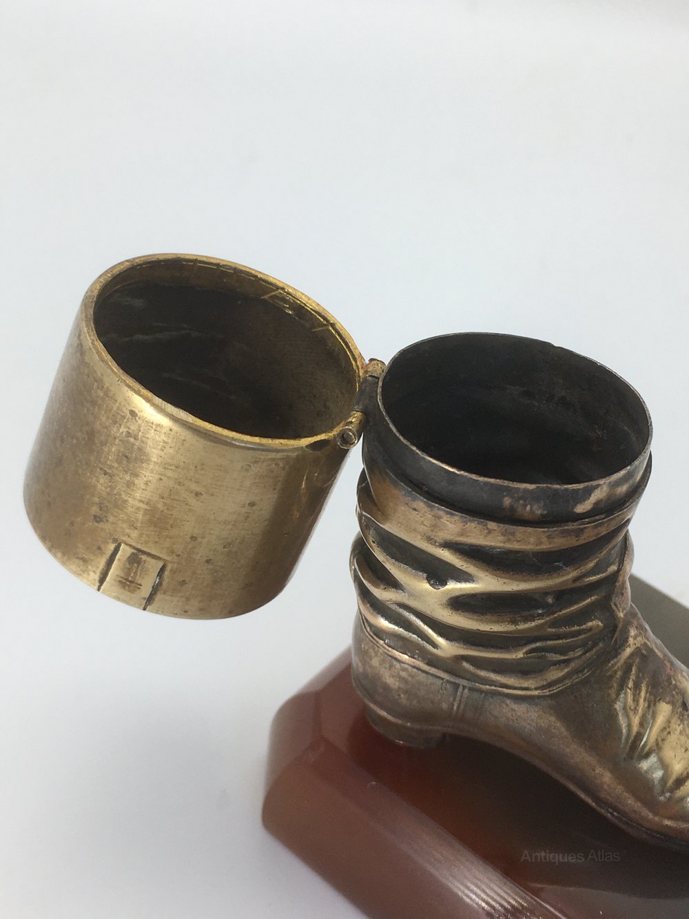 Very unusual Vesta/Matchsafe in form of a Boot.The 'strike' is on top of the lid which has a ring pull to open the Boot and store Matches. It is mounted on a rectangular base of Cornelian.Excellent condition.I am listed as a Private Dealer but some of my Stock can be viewed at The Antique Shop, 53, High Street Heathfield E.Sussex.If you wish, I am am able meet you there to discuss any items and also bring along any items which are not on Antiques Atlas but not displayed in the Shop.