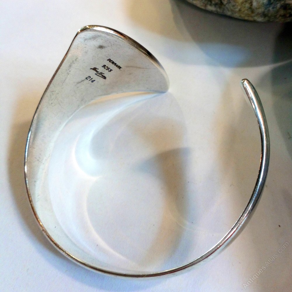 A Hans Hansen crafted sterling silver bangle #214 designed by Bent Gabrielsen. Marked Denmark 925S Hans Hansen . This bracelet is dazzling and very wearable. It is in good vintage condition with light signs of wear. Circa 1960's.Dimension = 42mm wide and a weight of 43 grams.