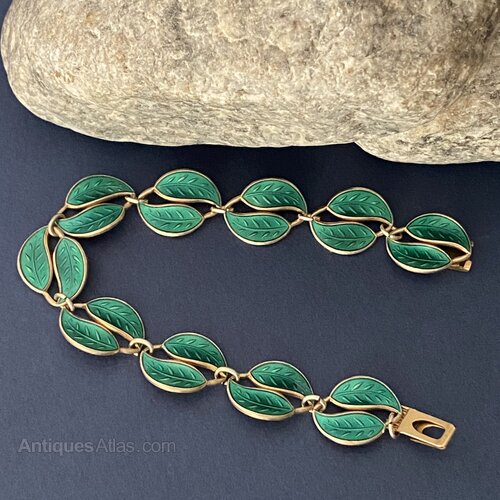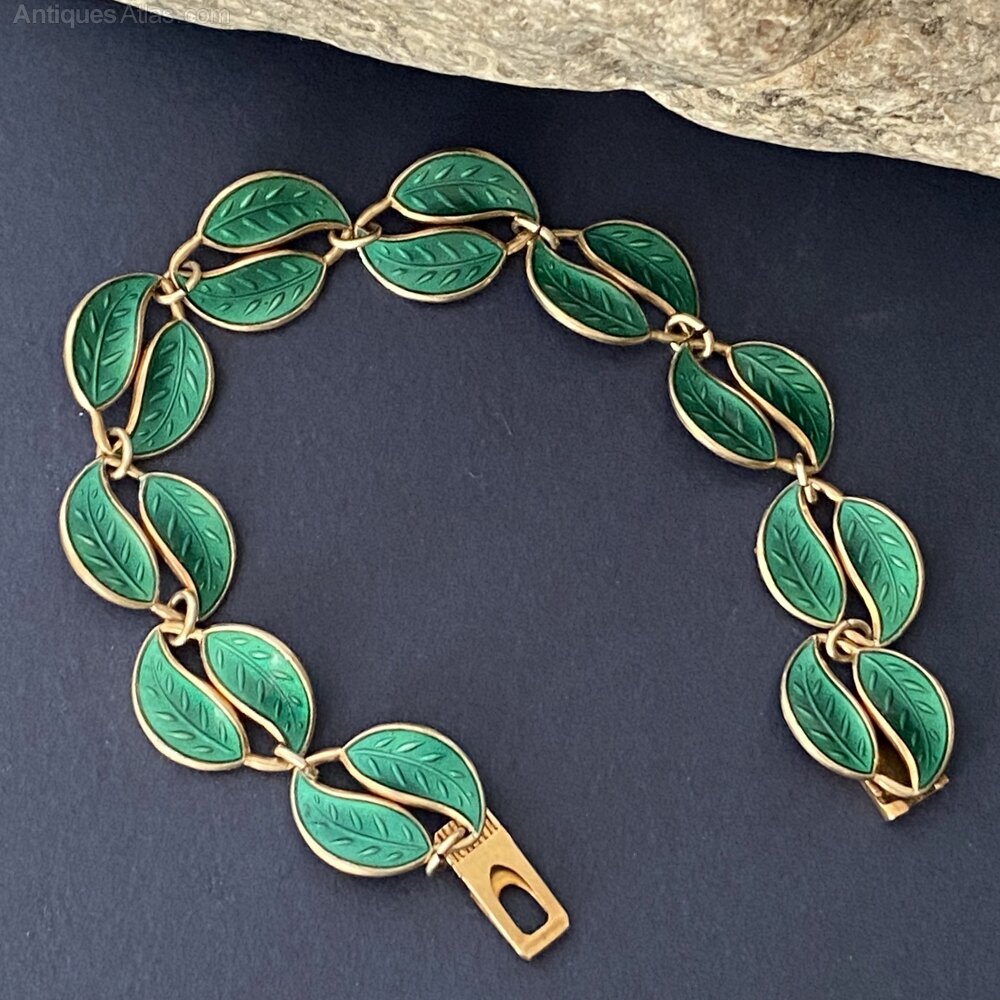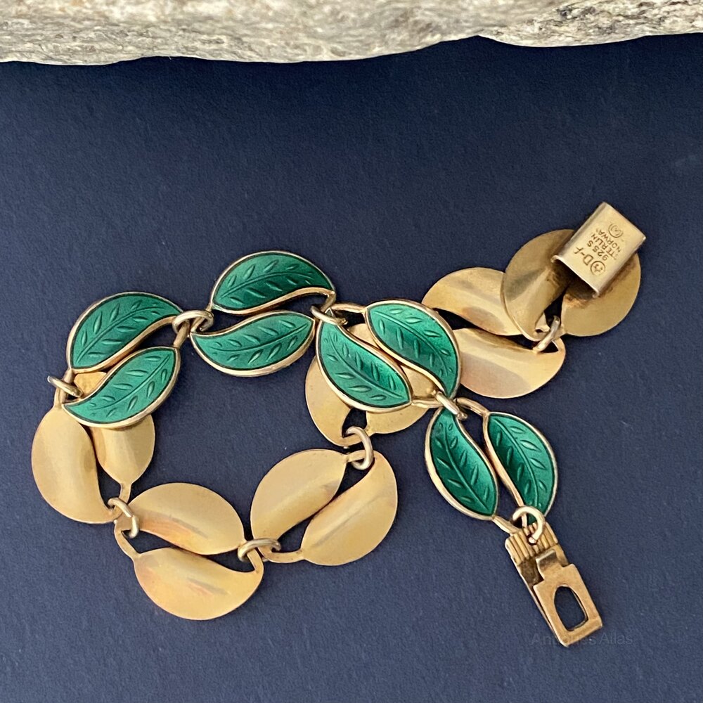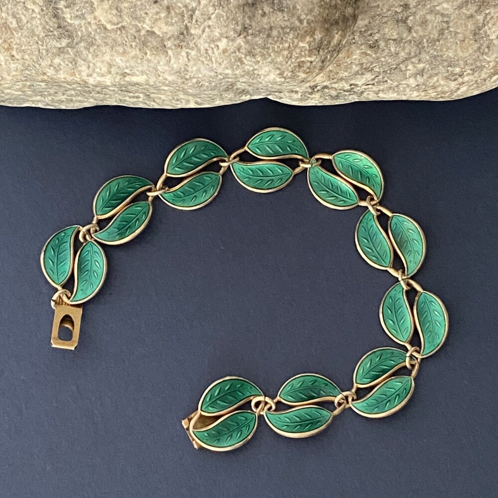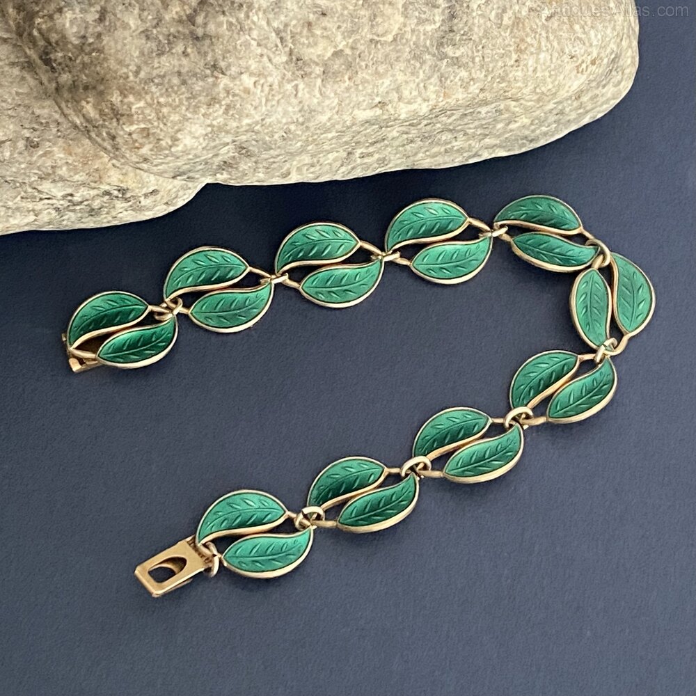A beautiful mid century David Andersen Norwegian sterling silver and enamel bracelet. Each of the ten silver links is styled as a twin leaf enriched in a gorgeous emerald green. Very good vintage condition.This David Andersen enamel bracelet would make an excellent Christmas gift.