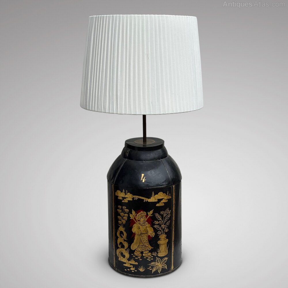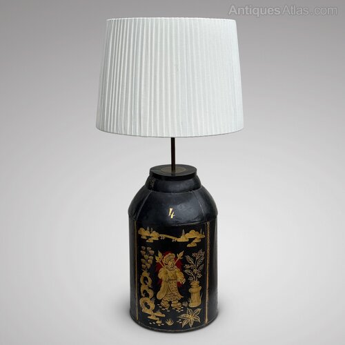 A large table lamp converted from a 19th century tea canister. The condition is good, compatible with age and the lamp has been professionally rewired and PAT tested.The traditional Chinoiserie painted decoration is particularly striking and the lamp is sure to be an imposing feature wherever it is placed. A fine example of its type and a wonderful decorative item.