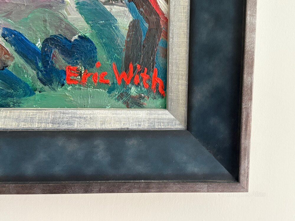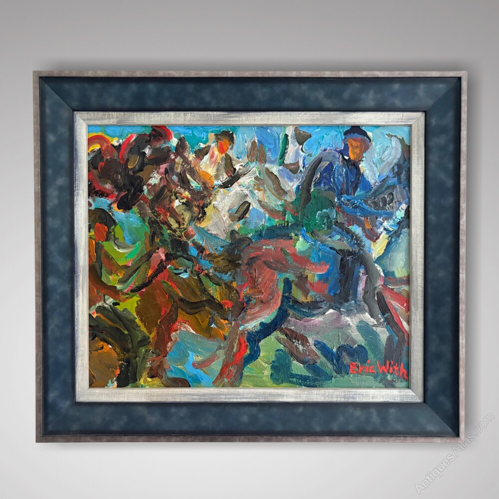 Eric With was a self taught Swedish artist, he travelled widely in Europe and is represented in a number of galleries and museums. In this work, with the use of vibrant colours, sweeping brushstrokes and heavy impasto, the artist has captured the speed and excitement of the race.This oil painting is housed in a modern mottled grey and silvered frame which compliments it perfectly