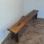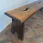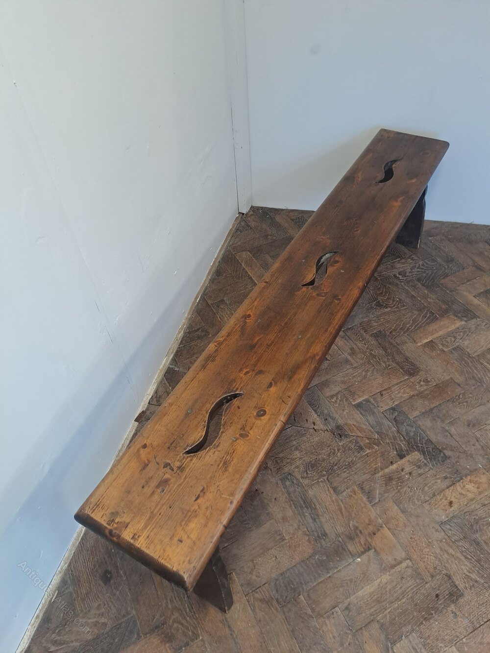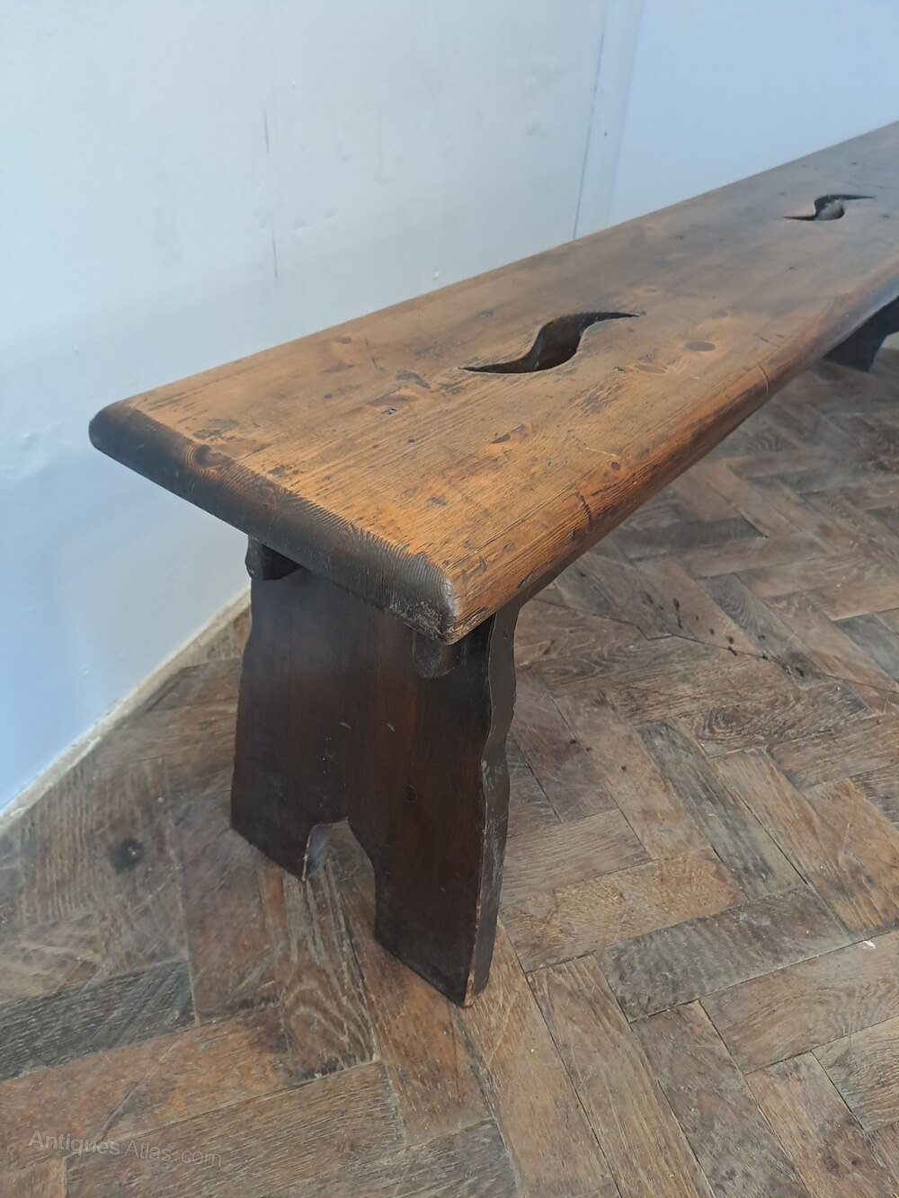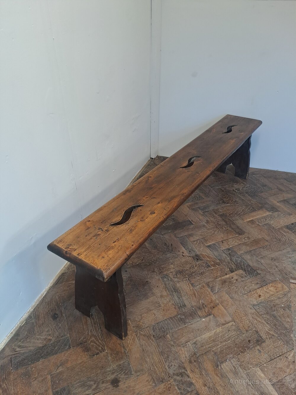 A charming and practical 1920s pine bench of solid construction, showcasing a simple rustic design with great character. The thick plank seat features two shaped hand-holds, typical of the period, supported by splayed ends joined by a central stretcher for strength and stability. Nicely worn with a rich, mellow patina developed through years of use, highlighting the natural grain and colour of the pine. Perfect for a farmhouse kitchen, hallway, or garden room.Height 46 cm, width 179 cm, depth 28 cm