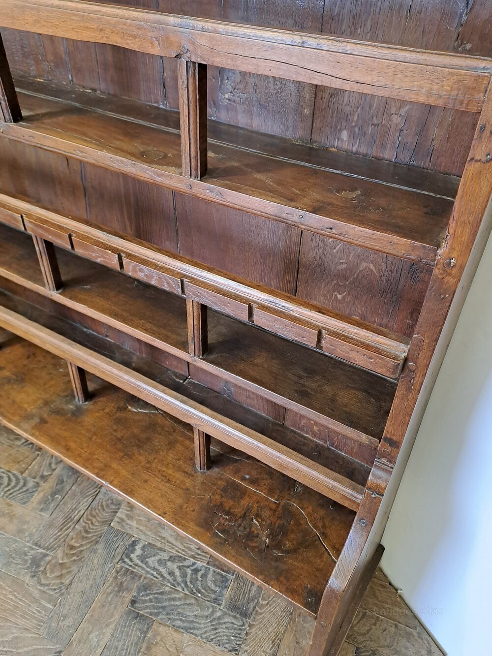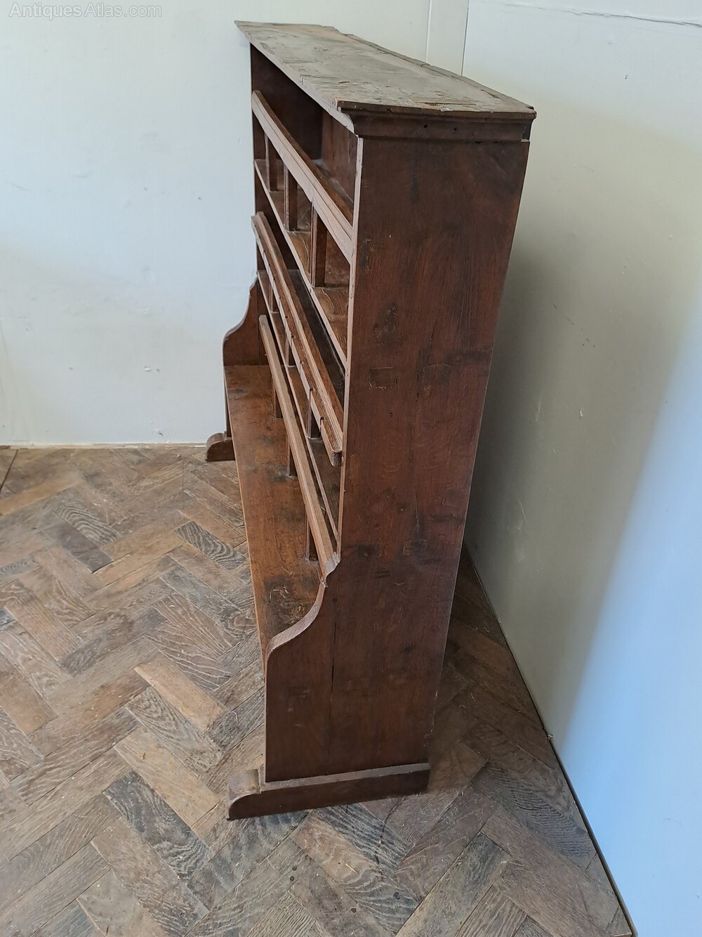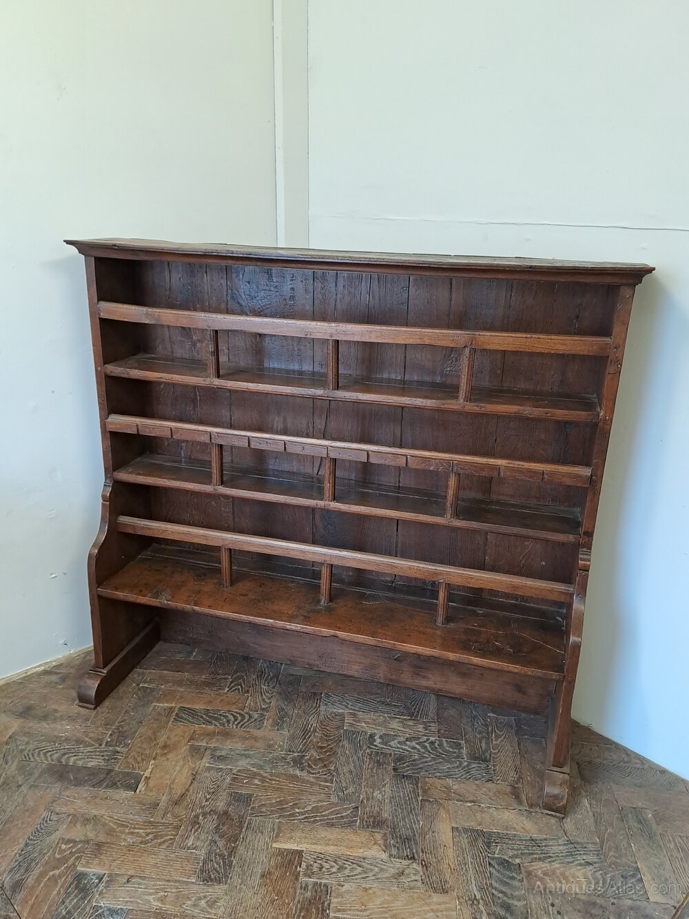 A 19th-century French oak Delft rack with cutlery slots, for sale by Hutton-Clarke Antiques.A charming and functional provincial piece, full of honest character and patina. Made from solid oak, this tall rack features multiple plate-grooved shelves for displaying Delft or pottery, along with a rare lower tier fitted with original cutlery slots – a practical detail seldom found today. The shaped sides and warm, time-worn finish give it a lovely country house feel, while the generous proportions make it ideal for a kitchen, dining room, or scullery setting. A good, authentic 19th-century example with great colour and utility.