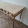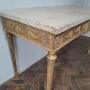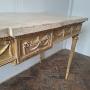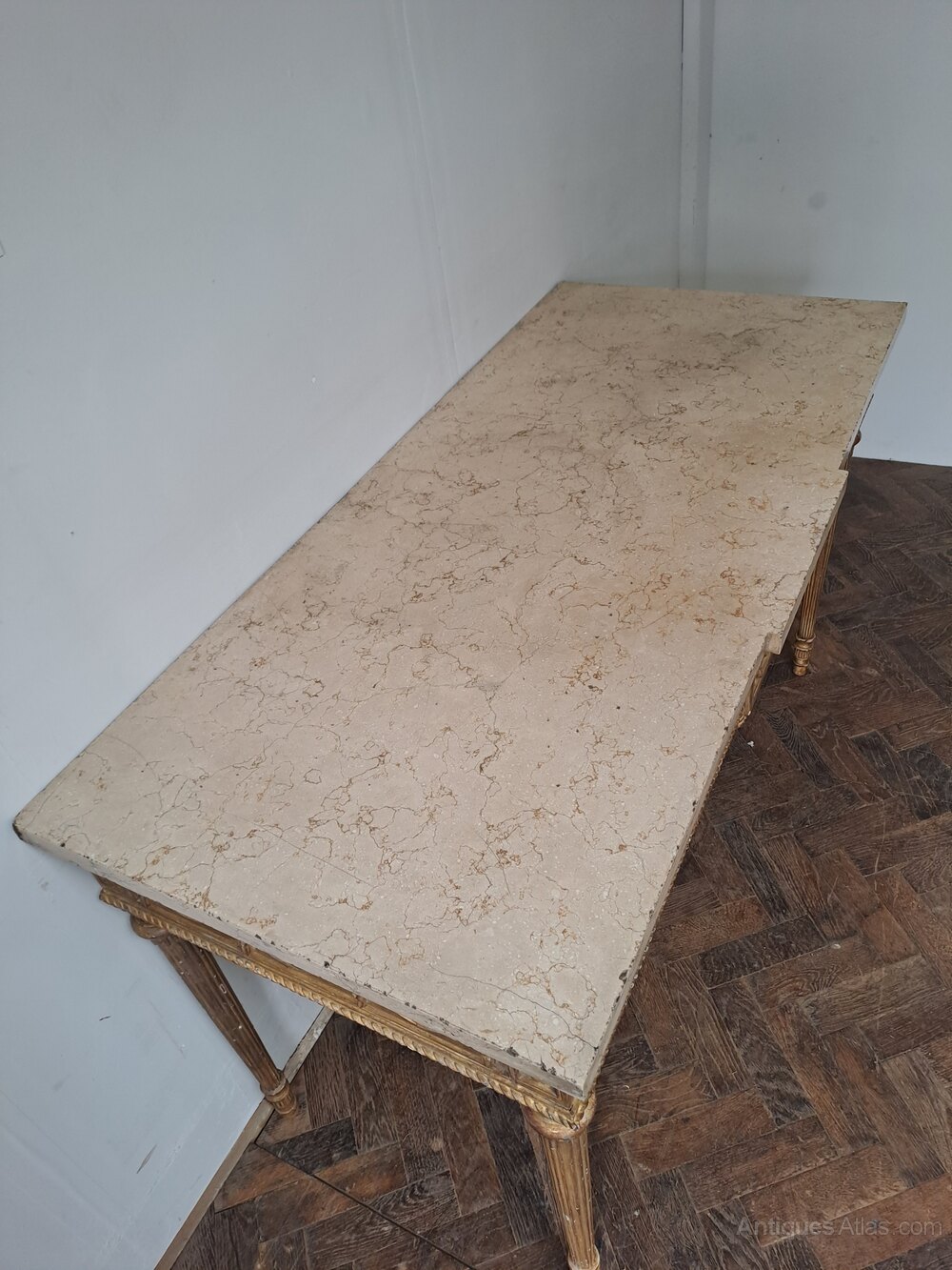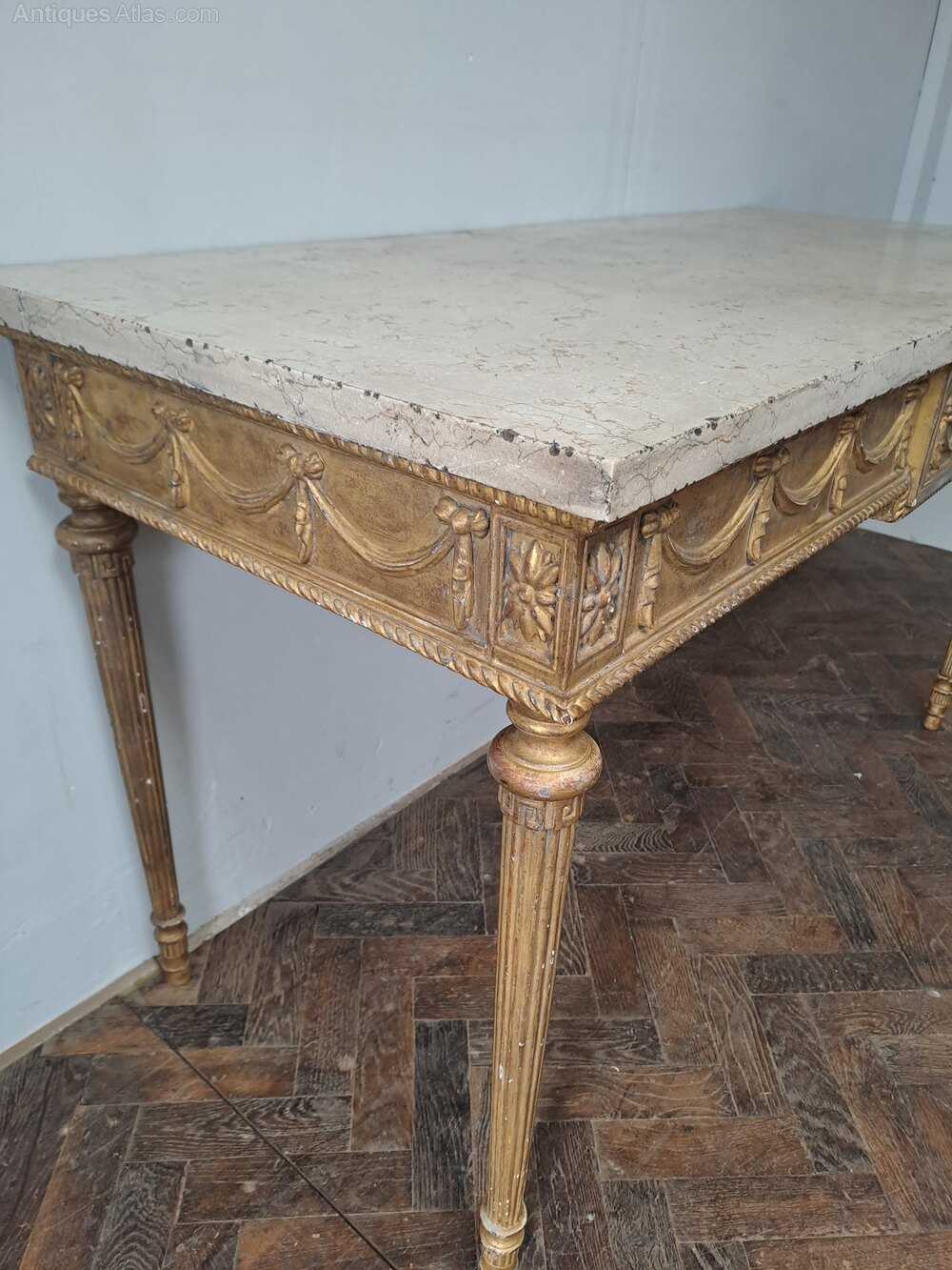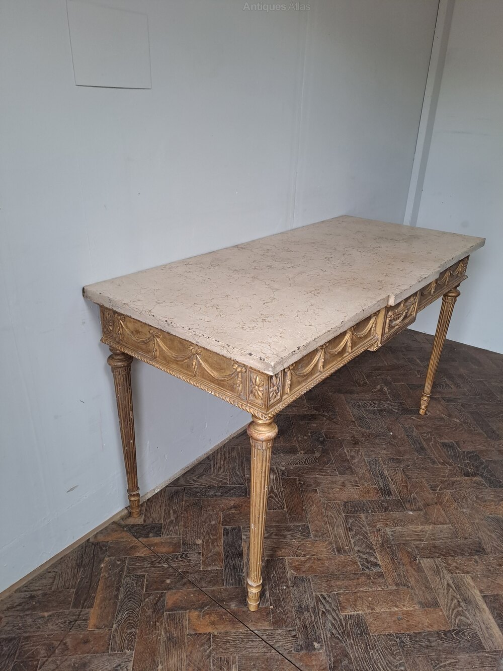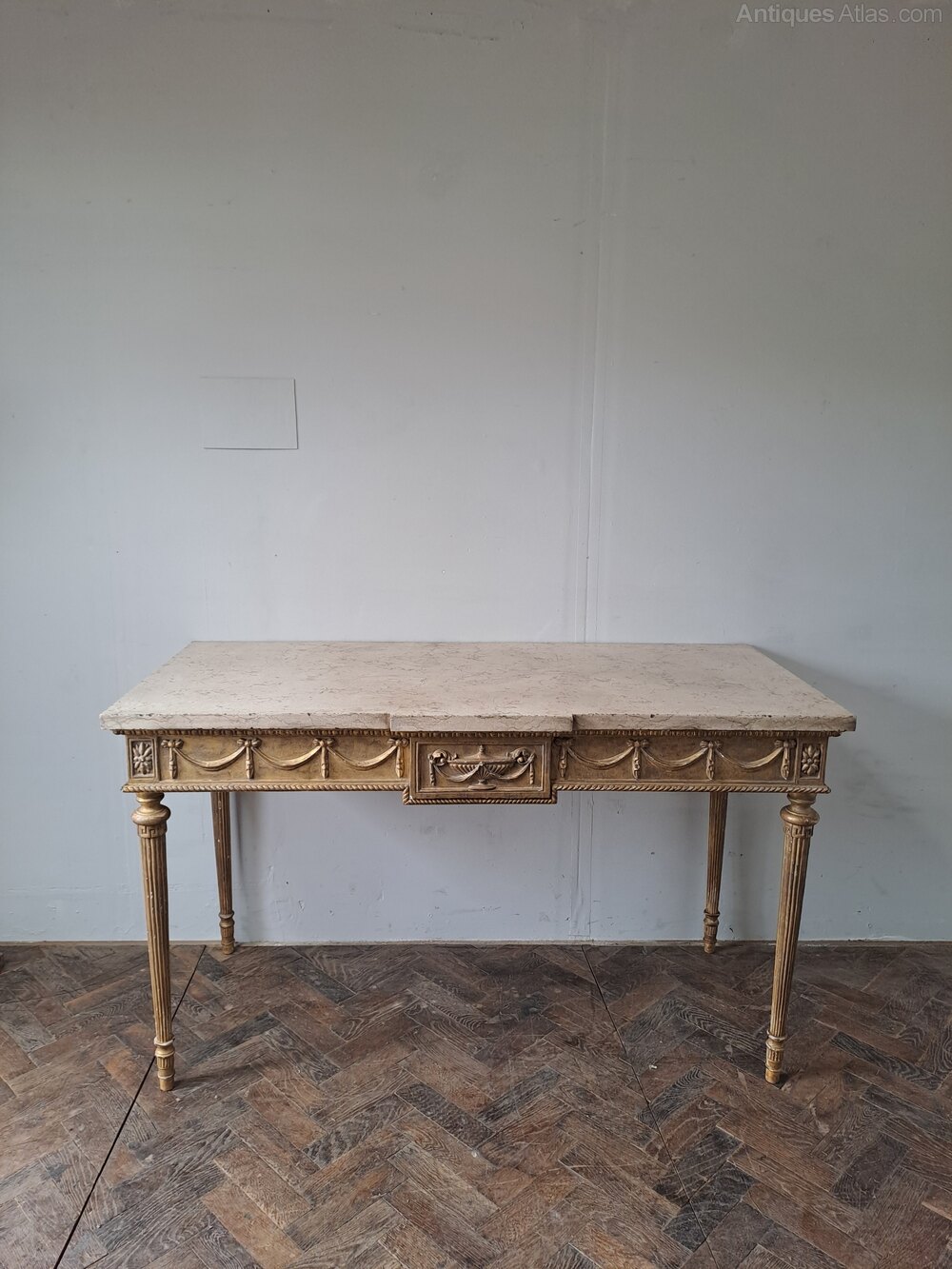 Hutton-Clarke Antiques is pleased to offer this elegant Louis XVI style gilt console, surmounted by a beautifully figured cream marble top with subtle natural veining.The frieze is richly carved with classical swags, rosettes and bead-and-reel mouldings, centred by a single panel, all executed with crisp detail and retaining a warm, softly aged gilt finish. The table is raised on four slender, fluted tapering legs with carved collars and turned feet, giving the piece a refined and balanced silhouette.