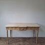 Inspired by 18th century French neoclassical design and likely dating from the late 19th to early 20th century, this is a versatile and decorative piece — ideal as a console table, writing desk, or dressing table.