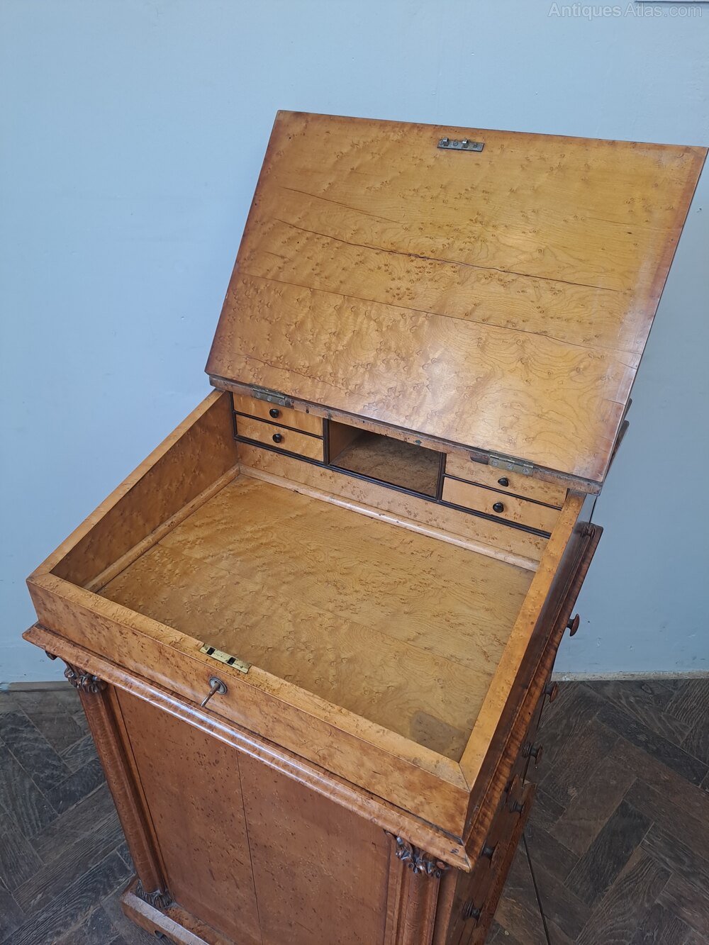 Hutton-Clarke Antiques is pleased to offer this extremely rare and unusual Davenport desk in beautiful bird’s eye maple, dating to around 1830. The desk features a bank of real drawers to one side, balanced by cleverly designed false drawers to the other, maintaining the symmetry typical of the form.A sliding top reveals a well-appointed interior with attractive storage compartments, complemented by a charming swing-out pen holder. The piece stands on a plinth base with original castors and is adorned with elegant, restrained columns to the front.