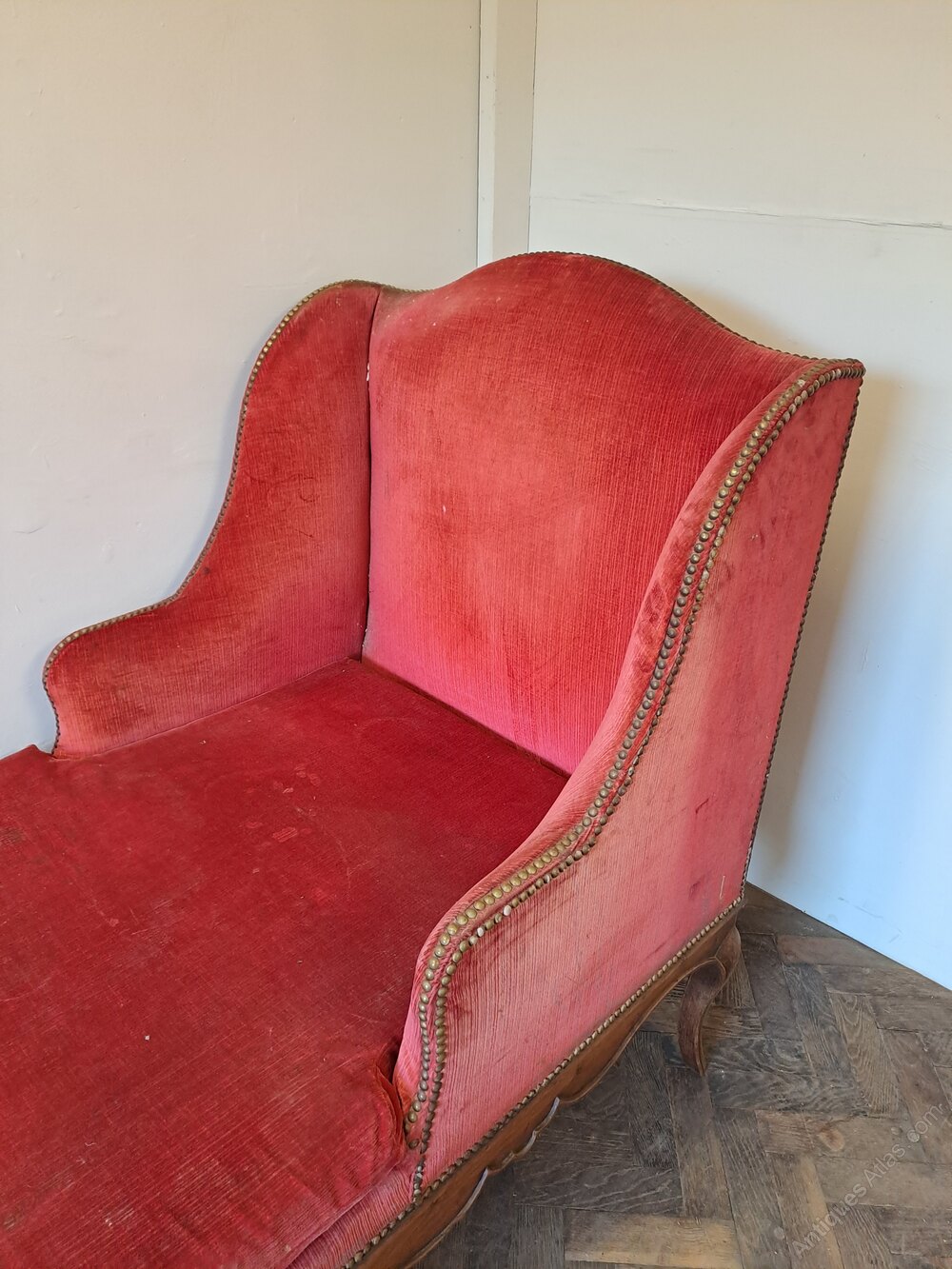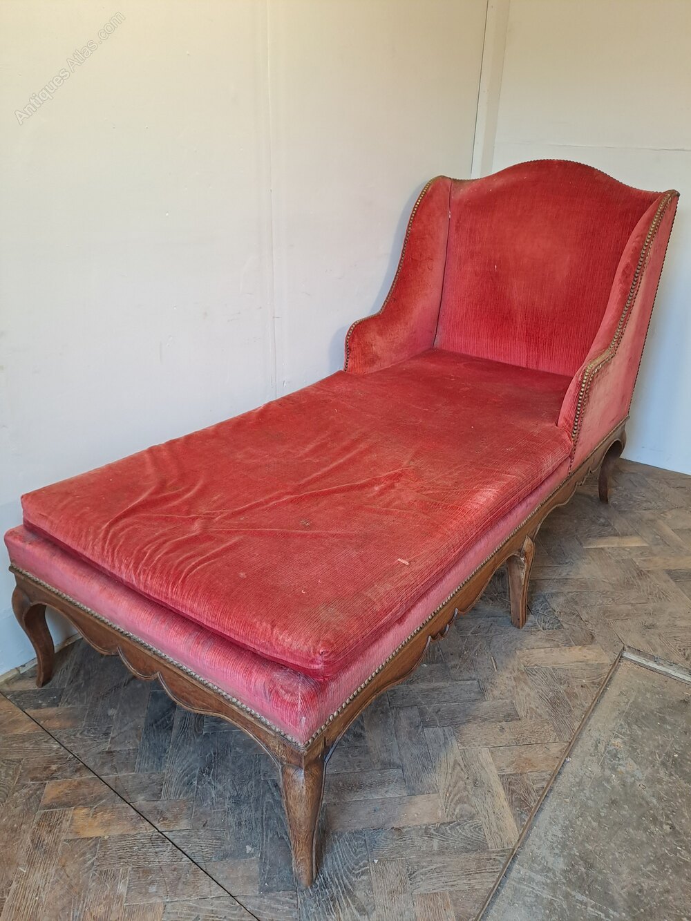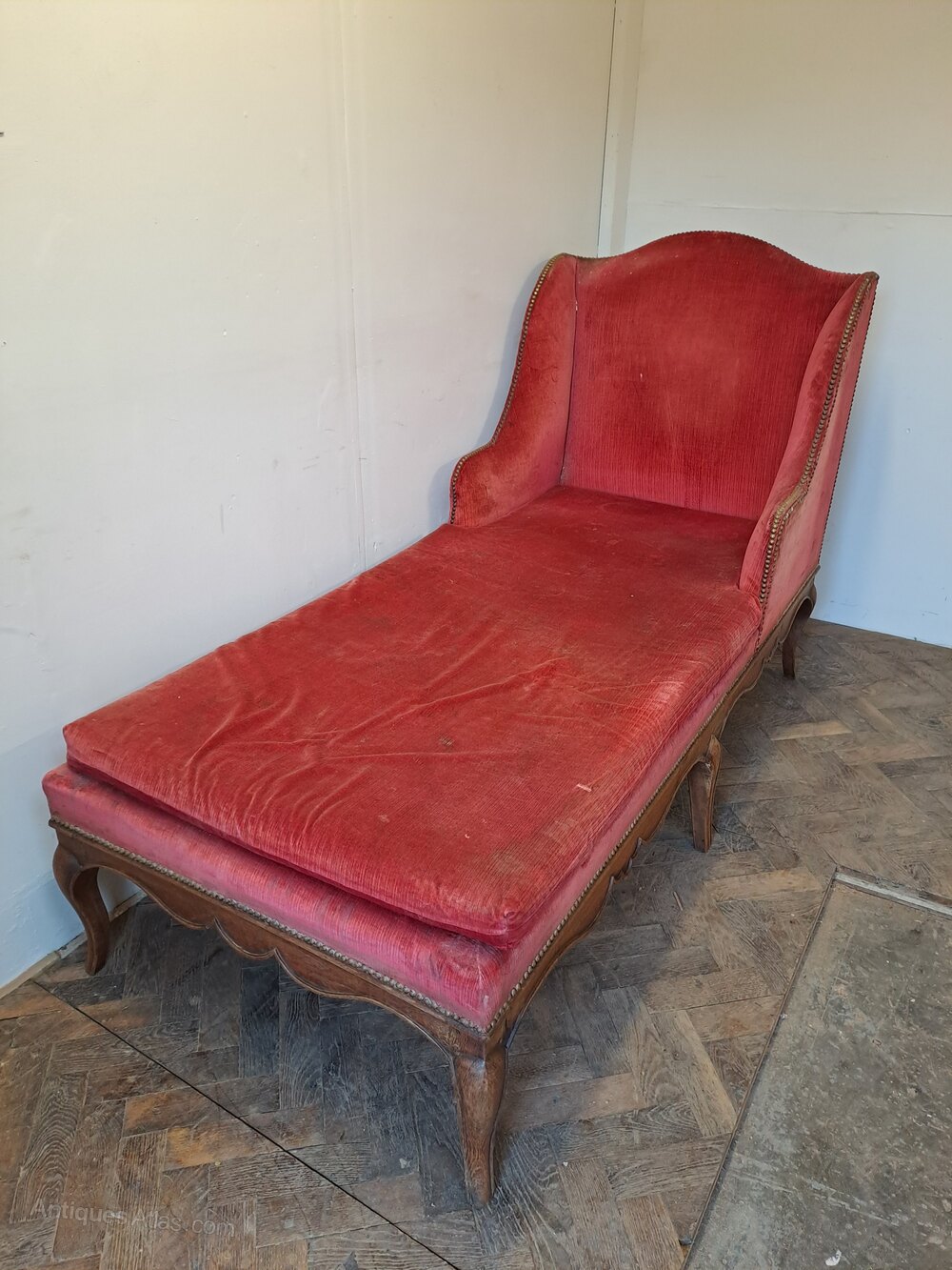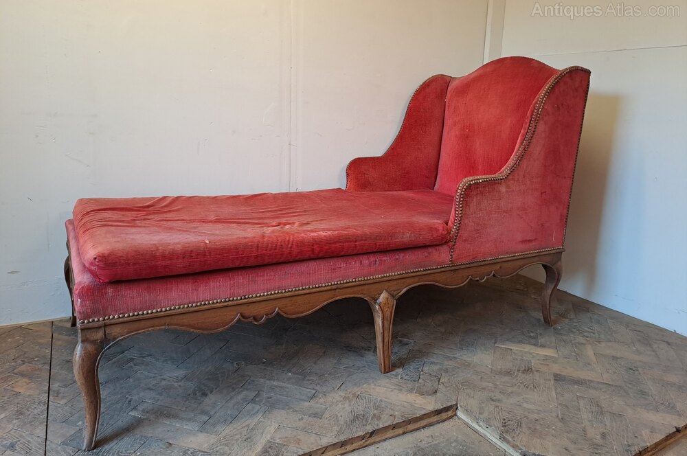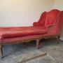 The day bed retains its old upholstery and is ready for re-upholstery, making it an ideal project piece. Once recovered it would make a superb decorative chaise longue or day bed for a bedroom, sitting room, or hallway.