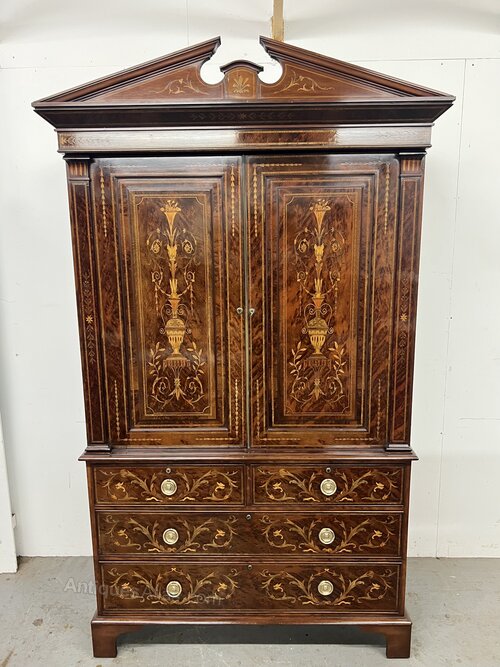 A fine and very good quality early 19th. Century plum pudding mahogany and marquetry inlaid linen press. The inlaid broken arch pediment above the moulded cornice with marquetry inlay. The 2 doors having superb marquetry inlaid panels with urns, swags, scrolling foliage and drapes all set within further marquetry and harebell inlaid frames. The doors open to reveal 3 shelves and 1 slide (all adjustable & removable) with oak linings. Flanked by applied square columns with satinwood inlaid capitals and boxwood & ebony stringing. The lower section having 2 short over 2 wide drawers all having scrolling marquetry floral inlay in various imported coloured woods and brass ring handles and escutcheons. The whole raised on an off set moulding with shaped bracket feet. This stunning antique linen press was probably commissioned by Edwards & Roberts of London. Condition- very good with oak linings and working locks with keys. Dimensions:- Max. Height…89.5’’/ 227.5cm. Width…49.5’’/ 124.5cm. Max. Depth at Cornice…25’’/ 63.5cm. Depth…22.75’’/ 58cm. Delivery by 2 man furniture carrier £90.ALL TRADE ENQUIRIES WELCOME.