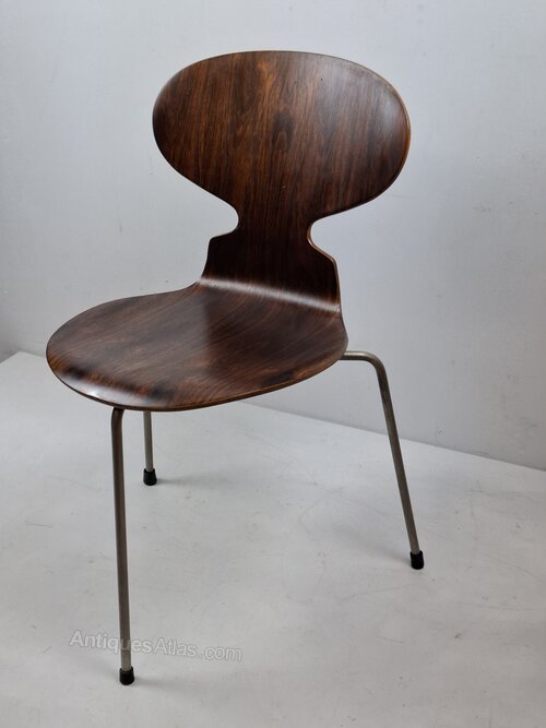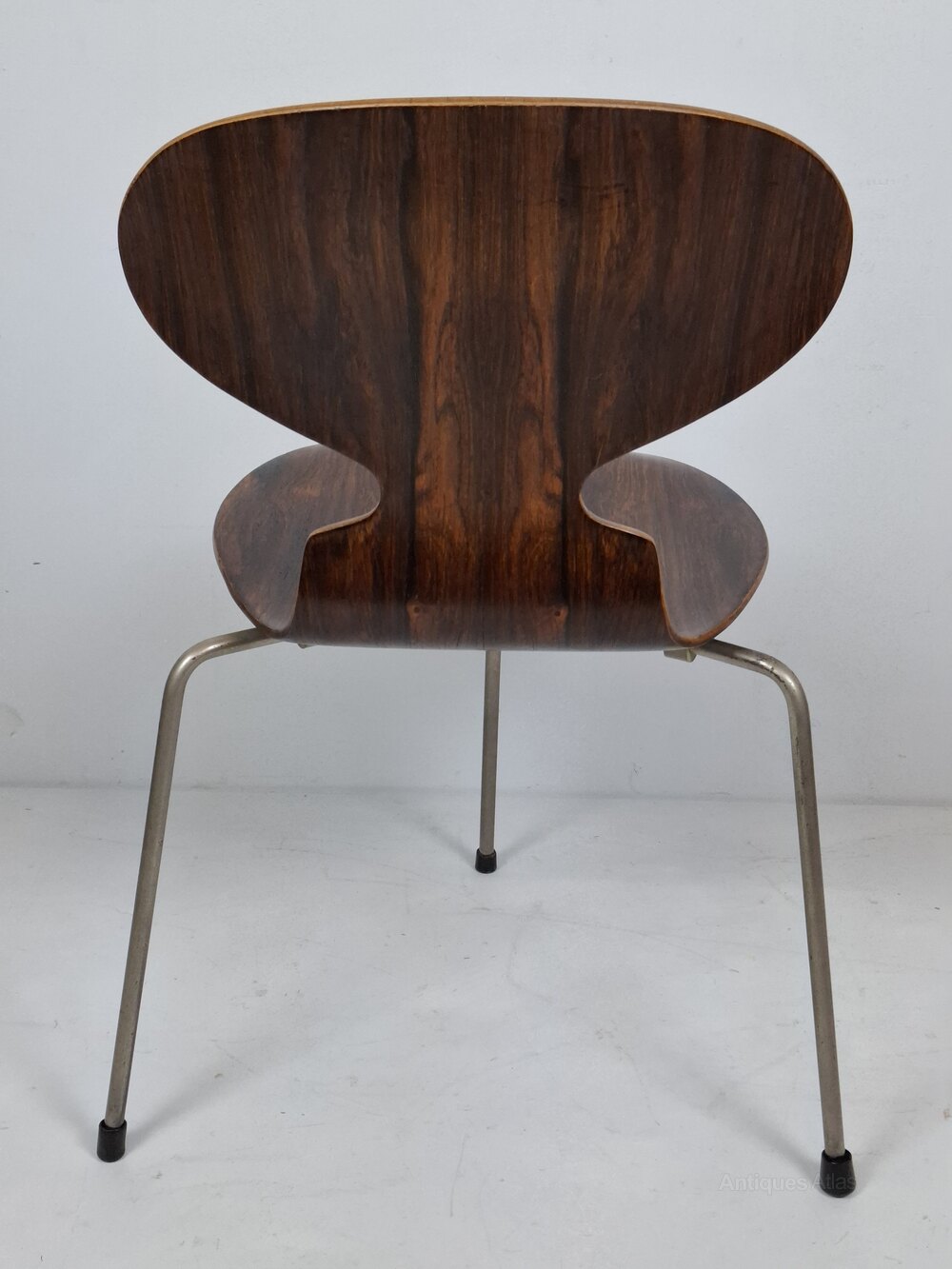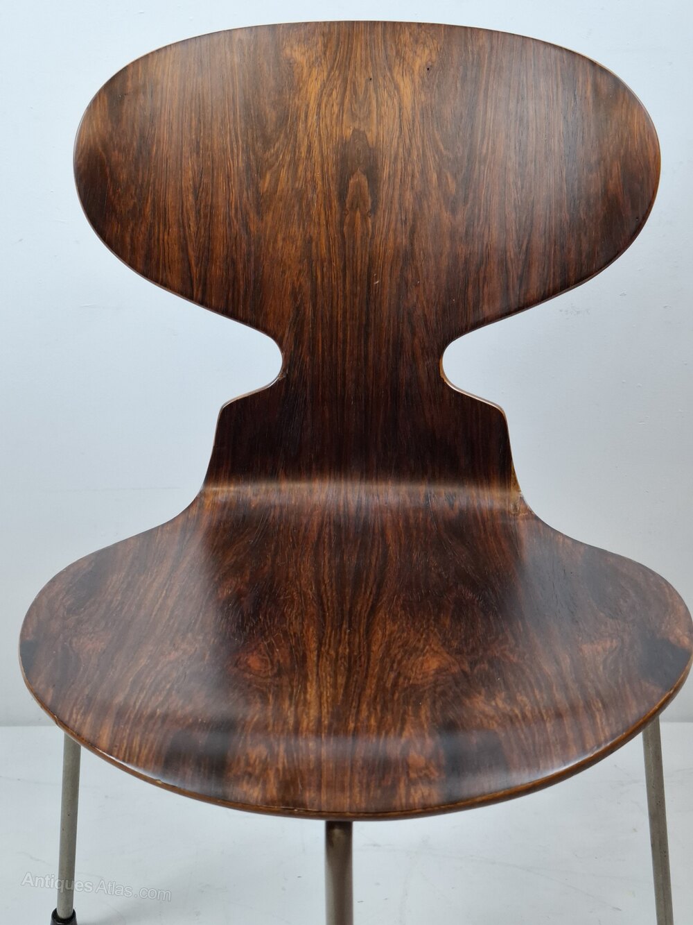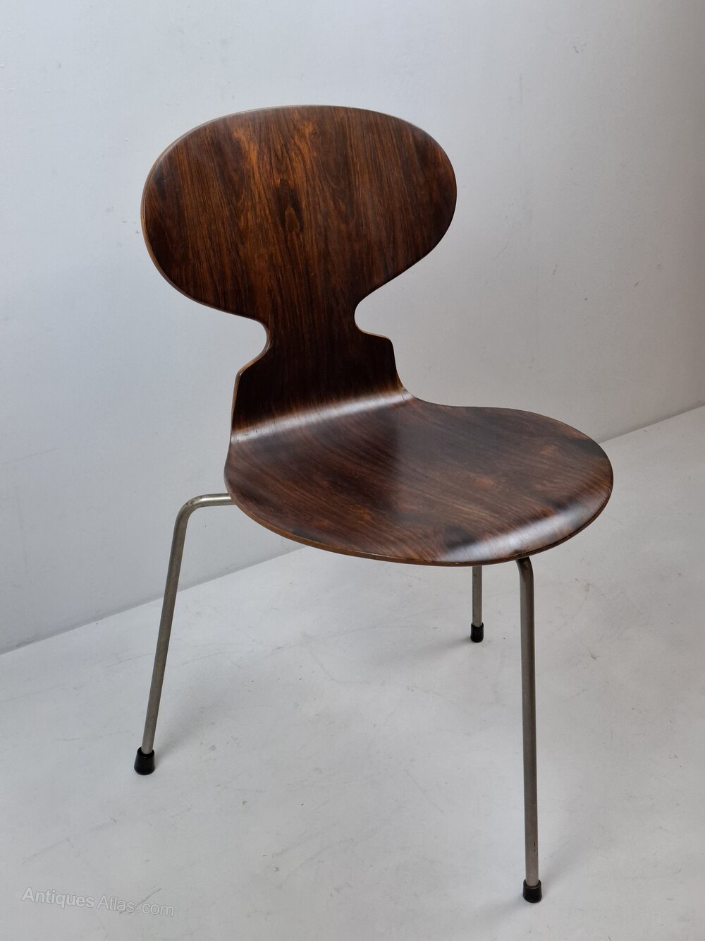A rare 'Ant chair' finished in rosewood. Dating from the 1950s and designed by Arne Jacobsen for the Danish firm of Fritz Hansen. Makers marks underside.In good condition but there is a small historical repair to the edge (see image), which is thankfully hard to notice.