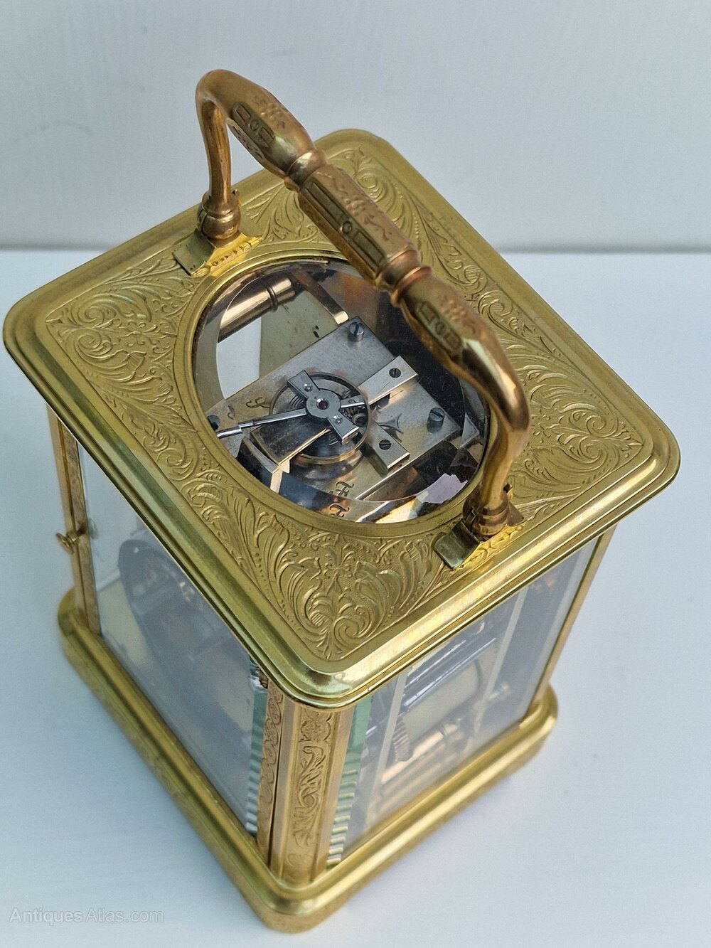 A French striking carriage clock by the noted maker, Brunelot. A fabulous all over engraved case. An enamel dial with Roman numerals and blued steel 'moon' hands.An 8-day duration mechanism striking the hours and 1/2 hours on a gong. The original escapement visible through the oval top glass. A B stamp mark to the backplate in a circle which is the mark for Brunelot. Circa 1880.