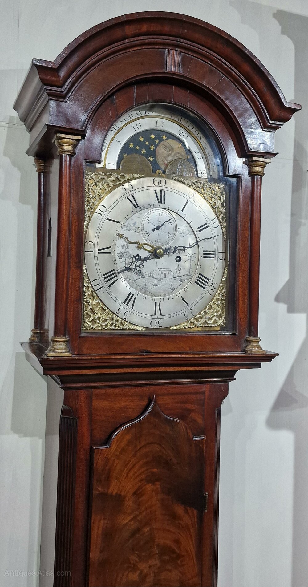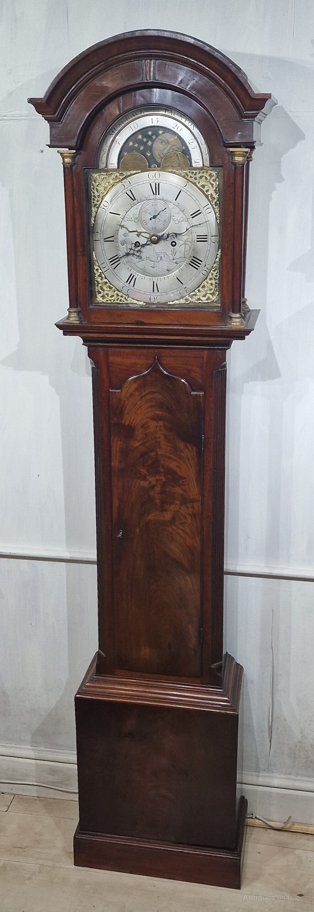 A small proportioned Georgian mahogany Somerset longcase clock. A slim case with an arched pediment and side glass hood apertures. Gilded hood front and rear column capitals. Choice flame mahogany case veneers and an arched trunk door. Fluted trunk sides. An arched brass and silvered dial with blued steel hands. Lunar moon phases to the arch and engraved 'Musgrave Taunton'. A seconds dial and a rarer feature of an inner date dial with a brass hand pointer. An 8-day duration mechanism striking the hours on a bell. Circa 1780.George Musgrave of Taunton is recorded in A J Moores ' 'The Clockmakers of Somerset' book as working from 1750-1795. Various examples are noted in the book.