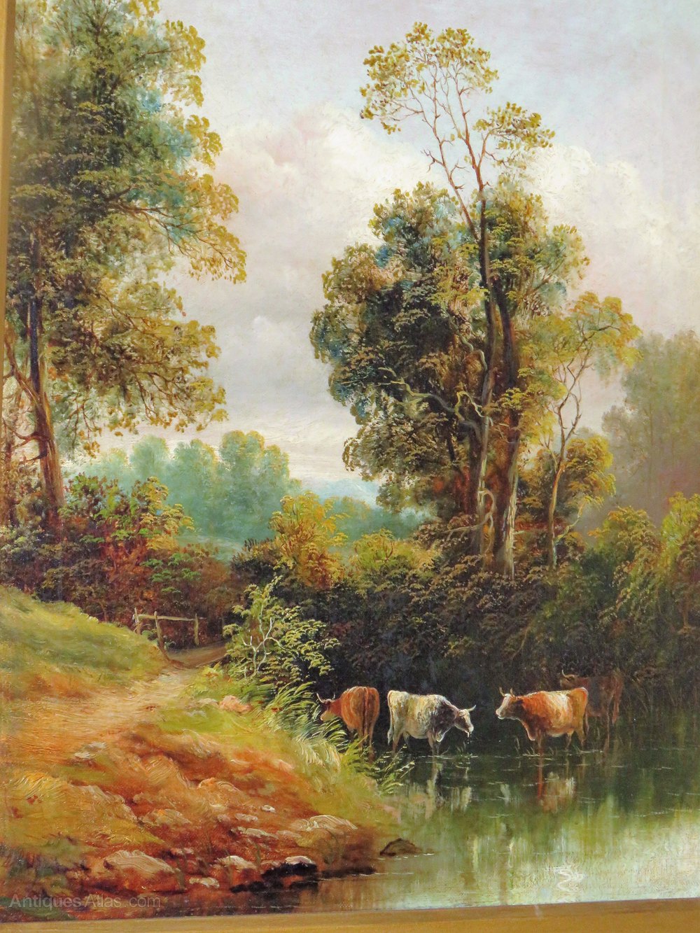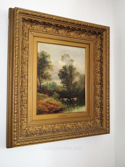 A good oil on canvas by the acclaimed West Country artist, Henry Harris (1852-1926). The painting is entitled "Near Highbridge, Somerset" and shows a river landscape with cattle. Henry Harris was a Victorian artist known for his pastoral landscapes.This painting is in a large, gilt frame which measures 29" x 25" (74 cm x 64 cm). The artwork itself is 17" x 13" (43 cm x 34 cm)