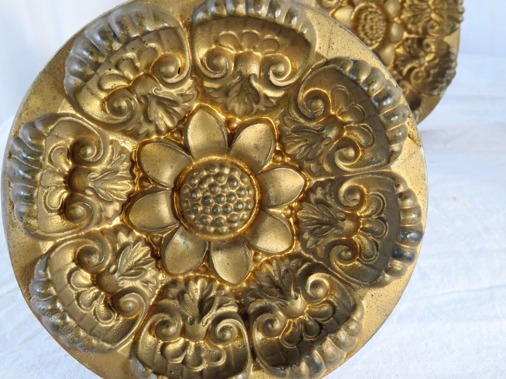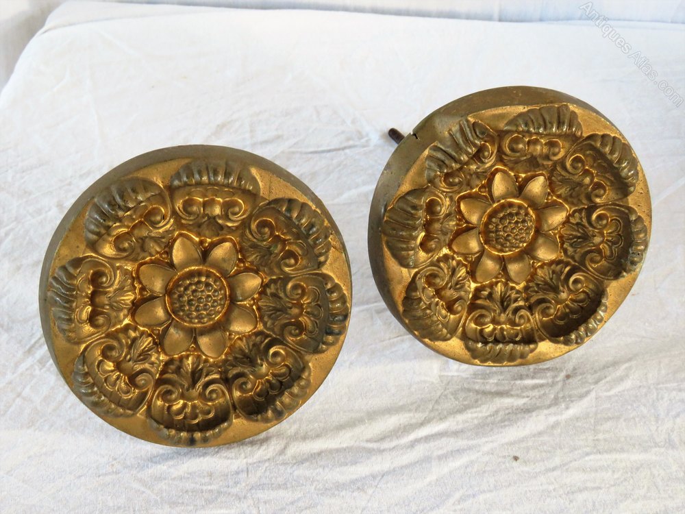 These 19th century curtain tie backs consist of a circular pair with embossed central rosette framed by shell motifs, and a curved pair with flowers and leaves on cast foliate wall mounts. 13 cm (5") diameter and 15.5 cm (6") diameter.All items are sold with a 14 day money back guarantee. In the unlikely event that you are unhappy with your purchase, we will gladly issue a refund (excluding carriage costs). The item must be returned in the same condition as it left us. The refund will be issued on the item's return to our premises.