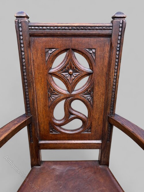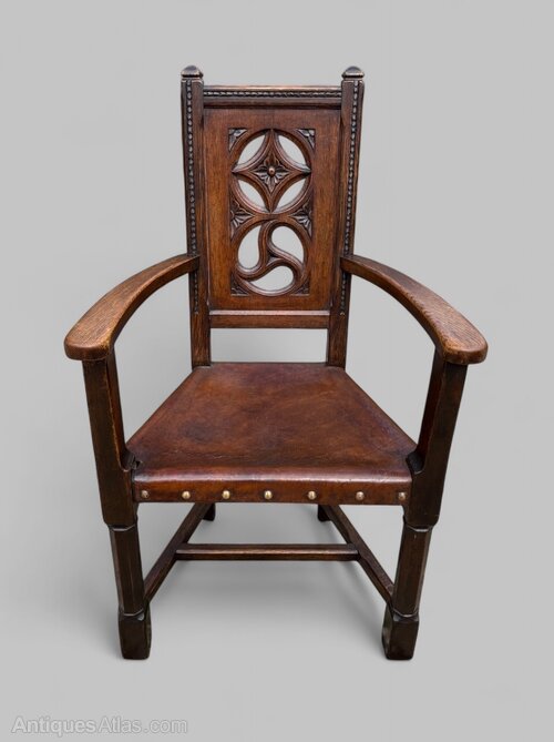 A wonderful Gothic Revival oak open armchair, dating to circa 1890-1900, with carved pierced back and thick leather seat. Extremely comfortable and a striking design it is a lovely chair. Offered in good condition, commensurate with age, with great colour to the oak and the leather seat. There is an old split to the seat which has been expertly repaired and then infilled which doesn't affect use. It measures 107cm tall, 63cm wide and approx 50cm deep. The internal seat width is 47cm. The price includes delivery within 30 miles of Taunton, elsewhere likely £84.00 England and Wales, but please contact me with a delivery postcode for an accurate price.Shipping information