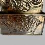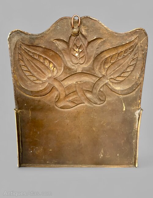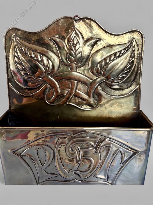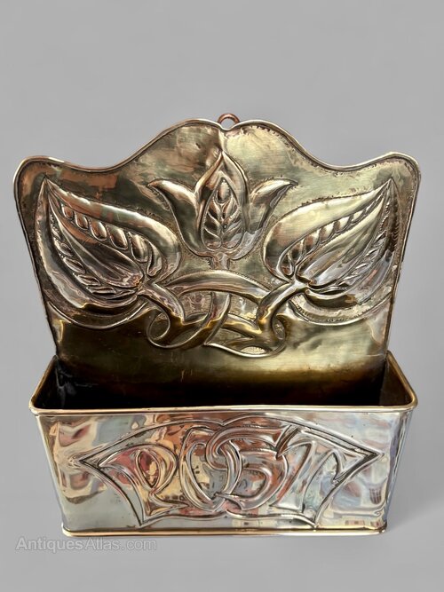 A great Arts & Crafts brass post box, dating to circa 1910, made at the Newton Class in Cambridgeshire. The Newton School of Metalwork operated from circa 1890 through to the onset of World War II and was helped by former Guild of Handicraft Metalworker John Williams who also worked at Fivemiletown in Ireland. Beautifully detailed with seed pods to the back and "post" to the front it is offered in pretty good condition, commensurate with age, with some minor wear. There are two places where they chased right through the metal within the lettering of "Post" and there are the beginnings of stress cracks to the back as shown in the last photo but nothing really noticeable. It measures 20.5cm tall, 18cm wide and 5cm deep. The price includes insured postage within the UK. Please contact if further afield.Shipping information
